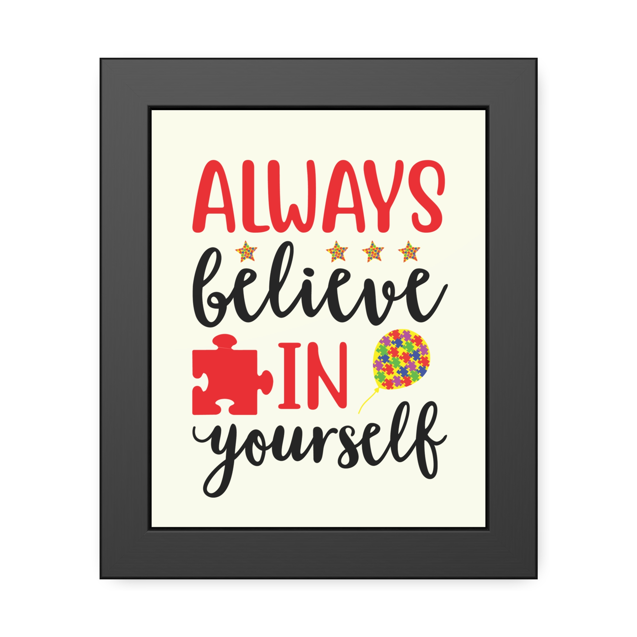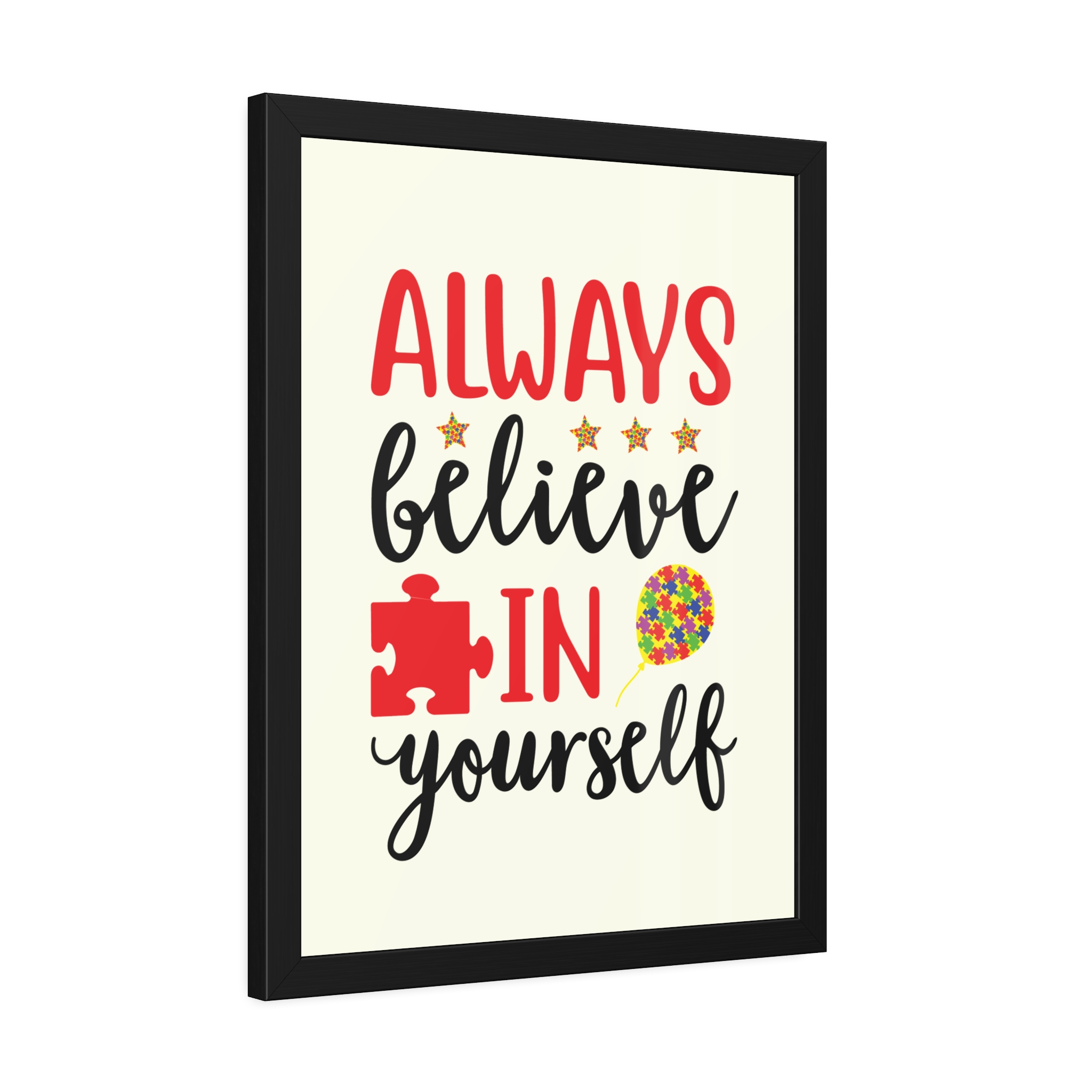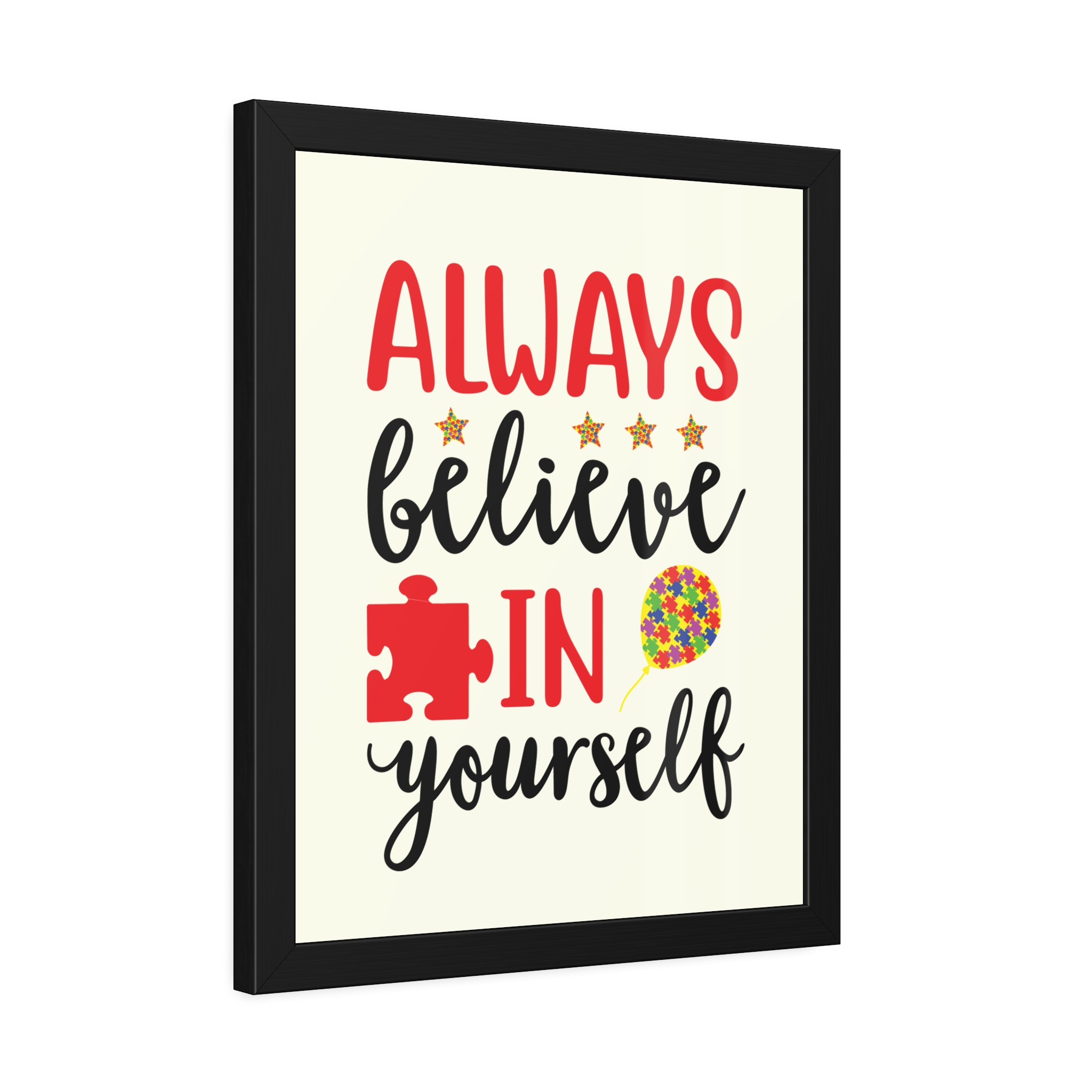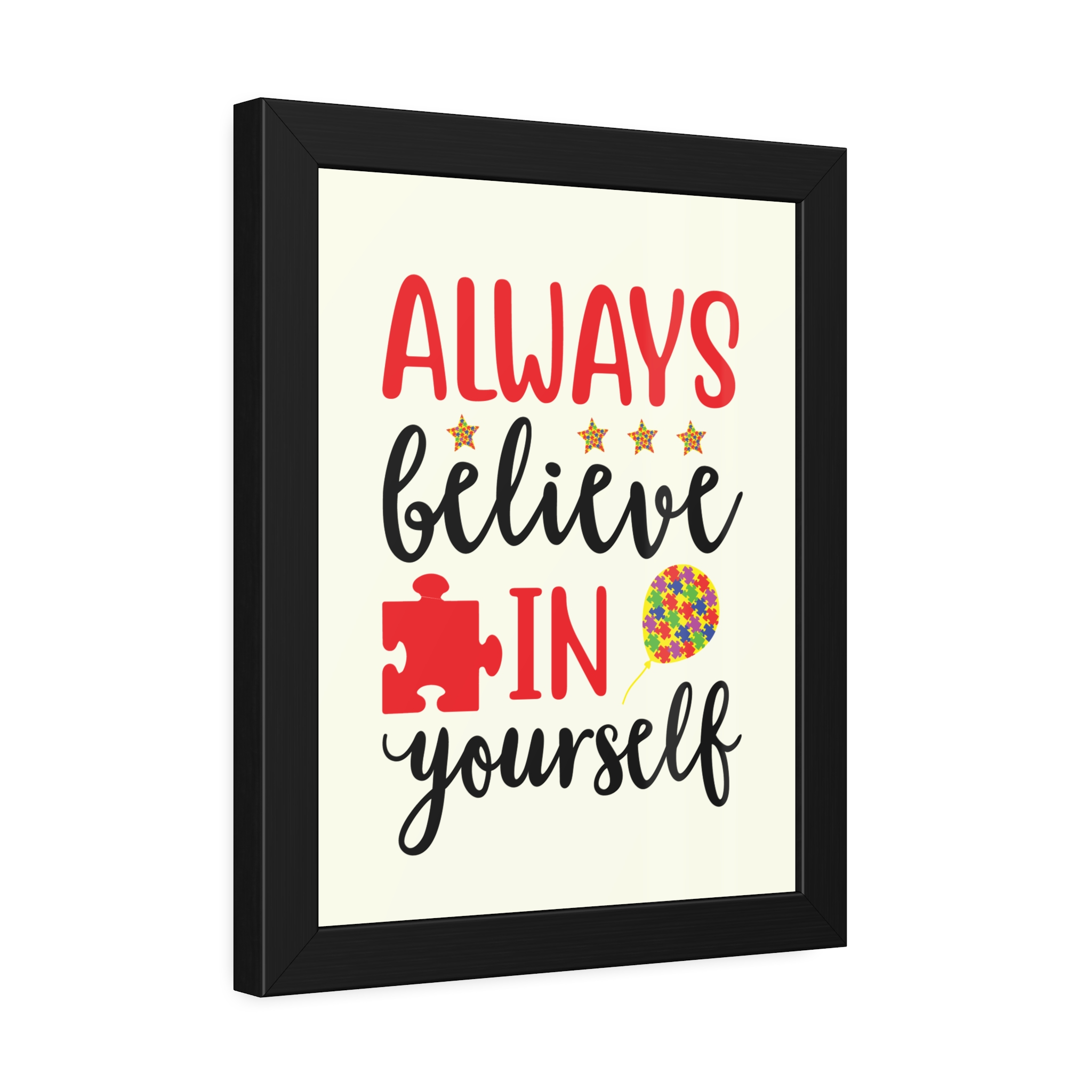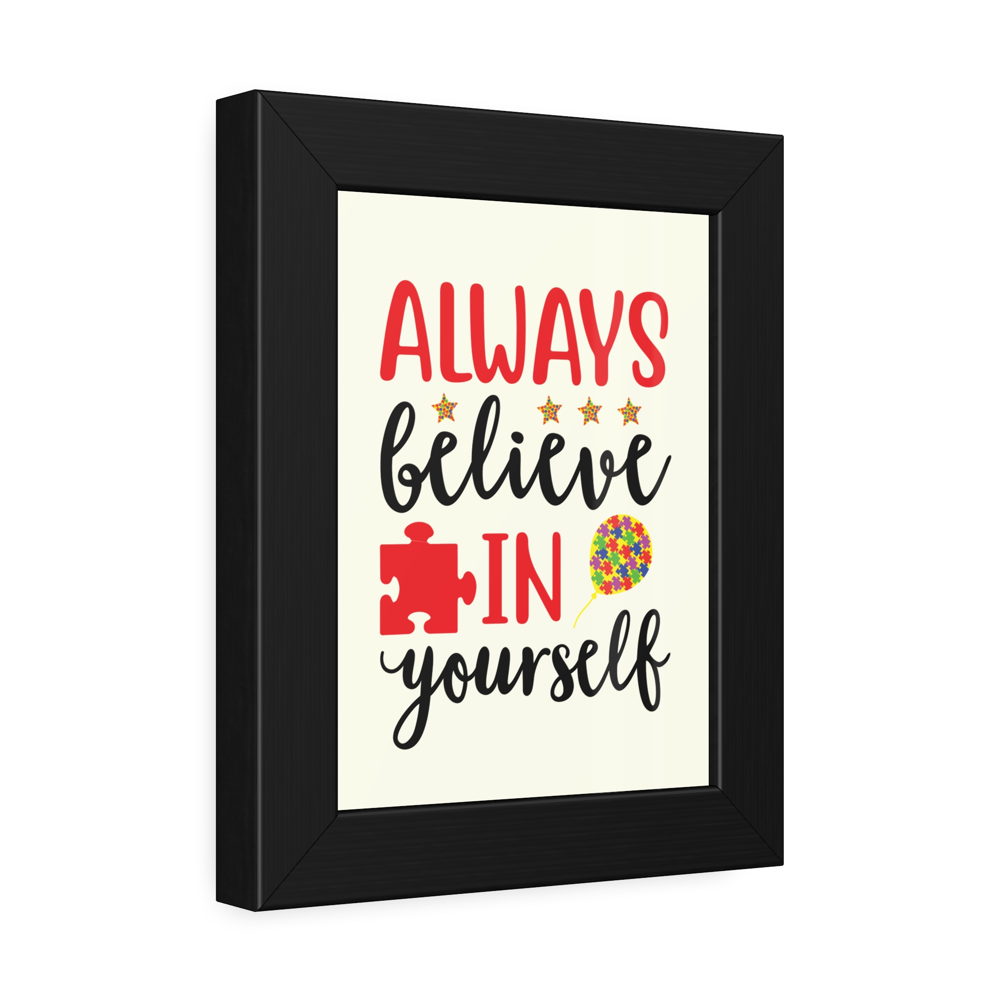 A warm, framed paper poster that speaks gently and clearly: “Always believe in yourself.” Printed on your choice of fine art or semi-gloss paper, the design combines playful script, a bold puzzle-piece motif, and a colorful confetti circle to celebrate perseverance and individuality. The print arrives ready to hang in a matte black pinewood frame with shatter-proof plexiglass and brown paper backing — a simple, polished presentation that brightens a classroom wall, therapy space, kid’s nook, or home office. The colors are vivid and durable, and the lightweight frame sits flat and secure thanks to pre-installed hardware and rubber bumpers. Choose orientation and size to fit a gallery wall or a small shelf display; assembled in the USA from globally sourced parts.
