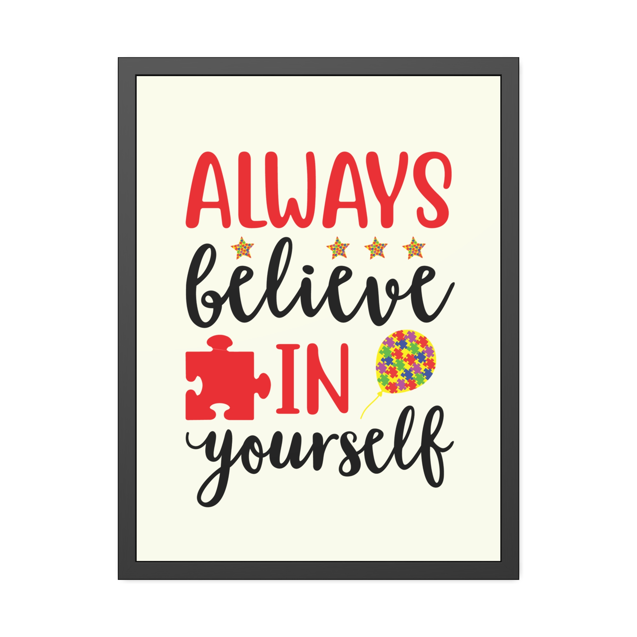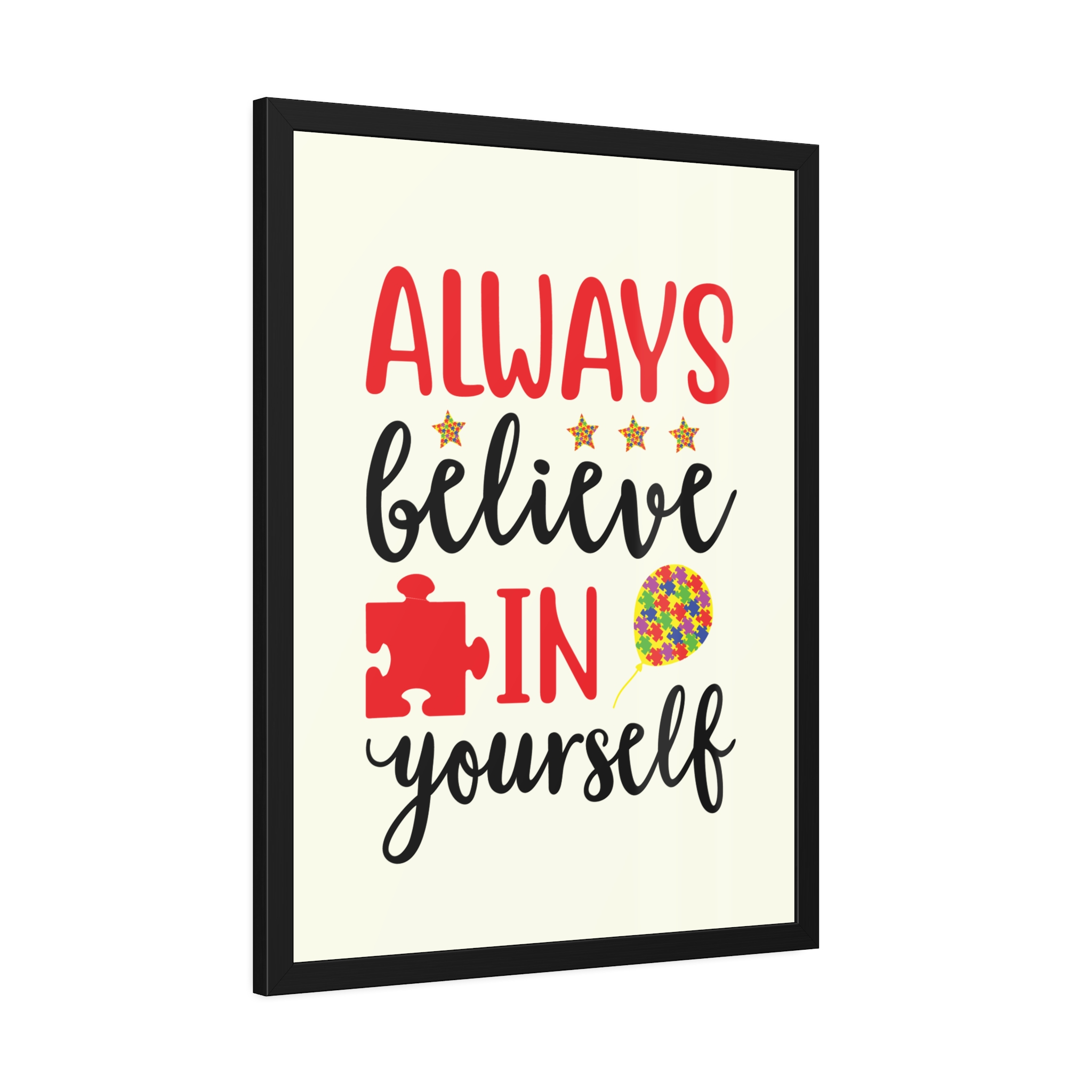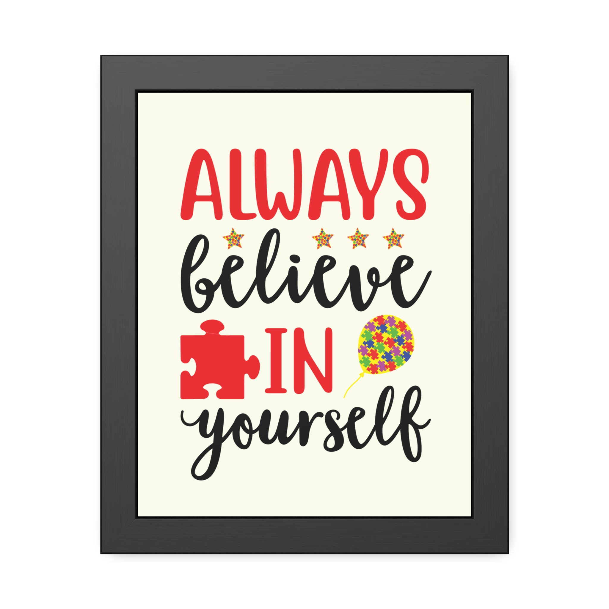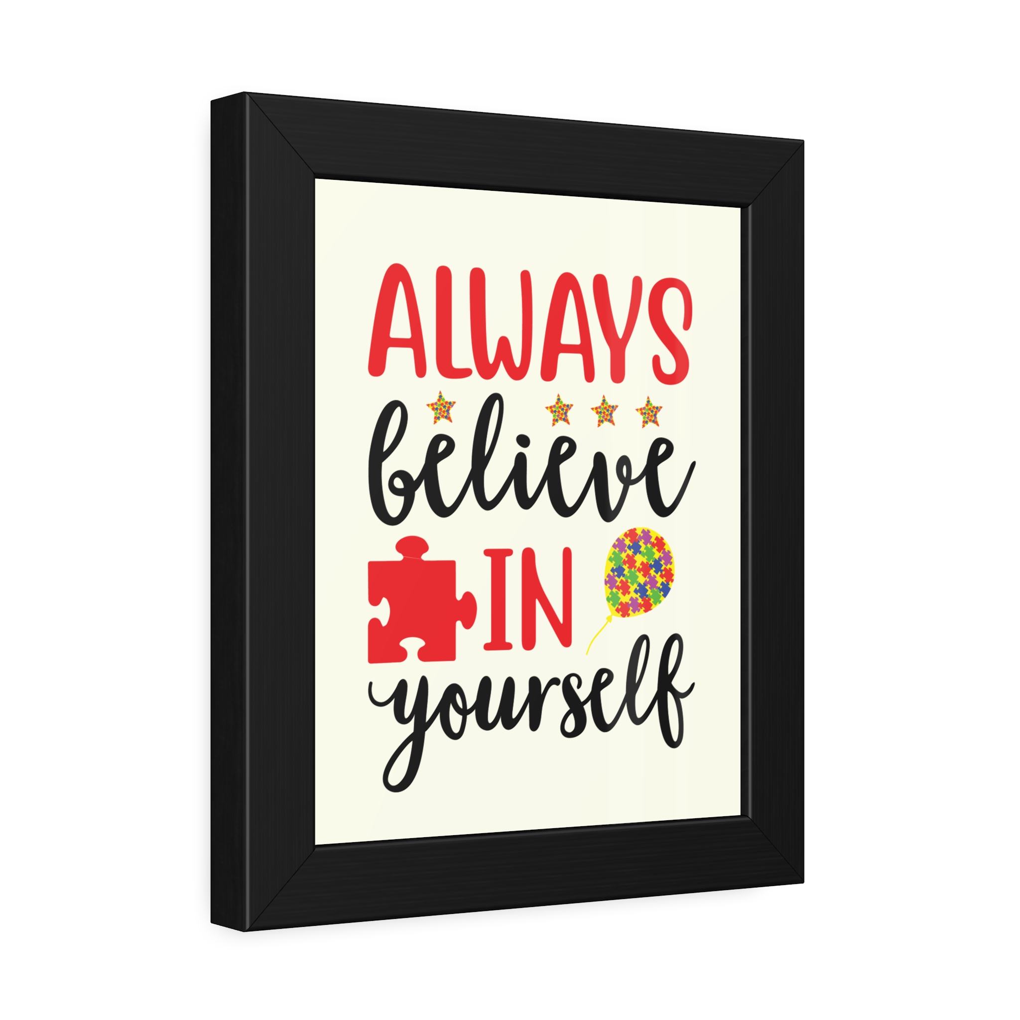 A warm, framed paper poster that speaks gently and clearly: “Always believe in yourself.” Printed on your choice of fine art or semi-gloss paper, the design combines playful script, a bold puzzle-piece motif, and a colorful confetti circle to celebrate perseverance and individuality. The print arrives ready to hang in a matte black pinewood frame with shatter-proof plexiglass and brown paper backing — a simple, polished presentation that brightens a classroom wall, therapy space, kid’s nook, or home office. The colors are vivid and durable, and the lightweight frame sits flat and secure thanks to pre-installed hardware and rubber bumpers. Choose orientation and size to fit a gallery wall or a small shelf display; assembled in the USA from globally sourced parts.