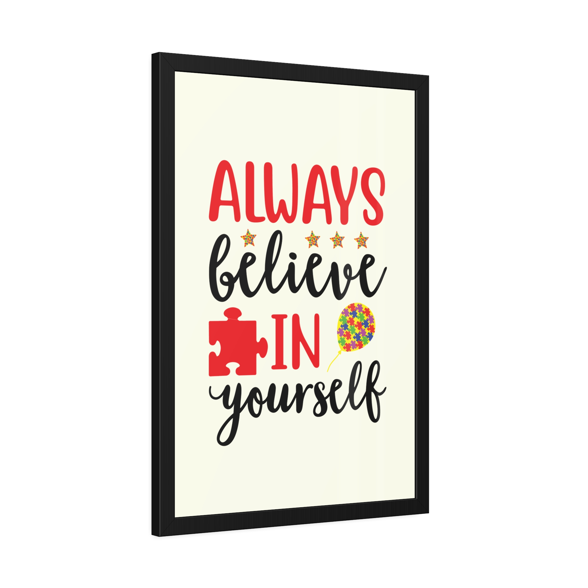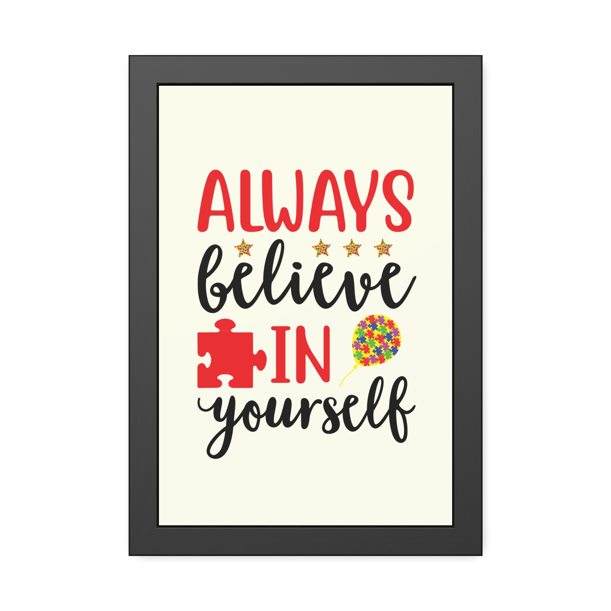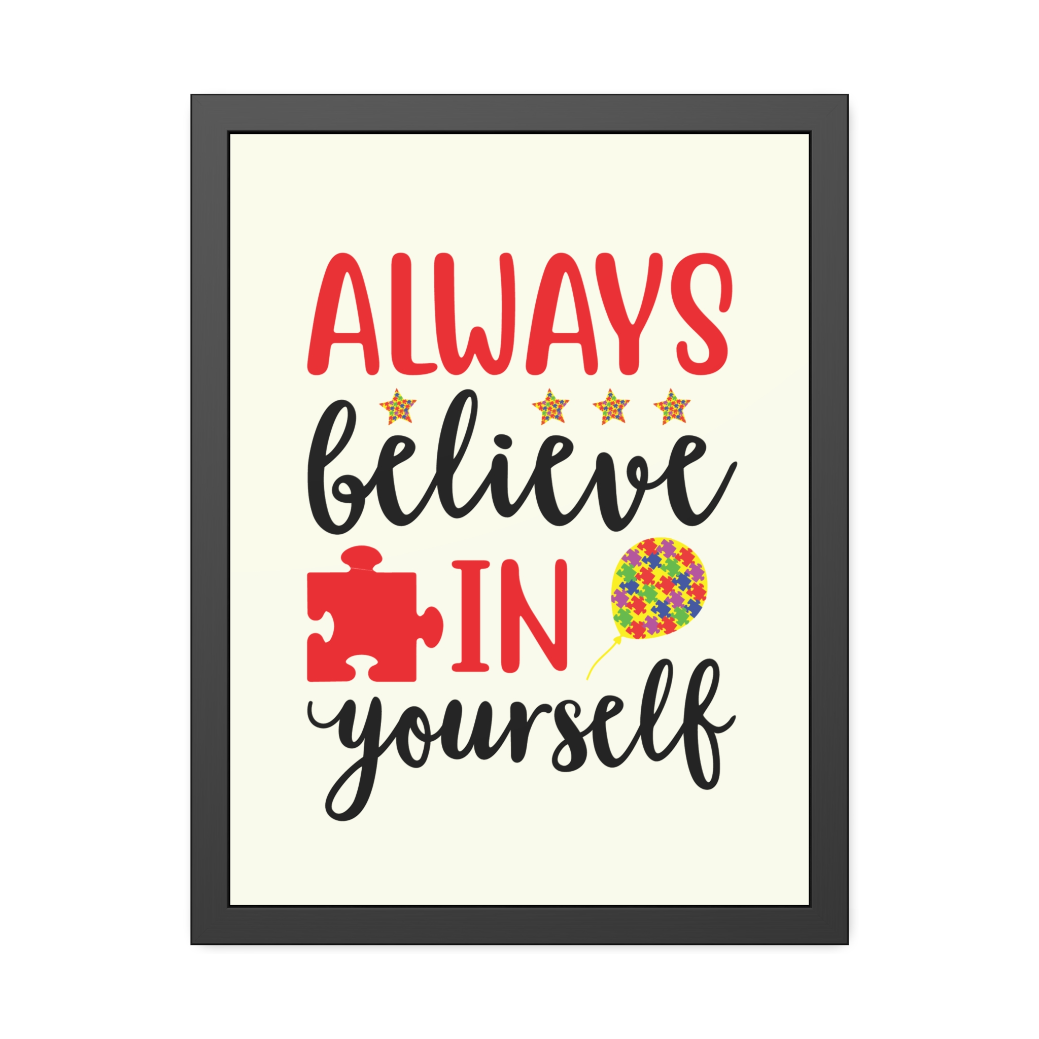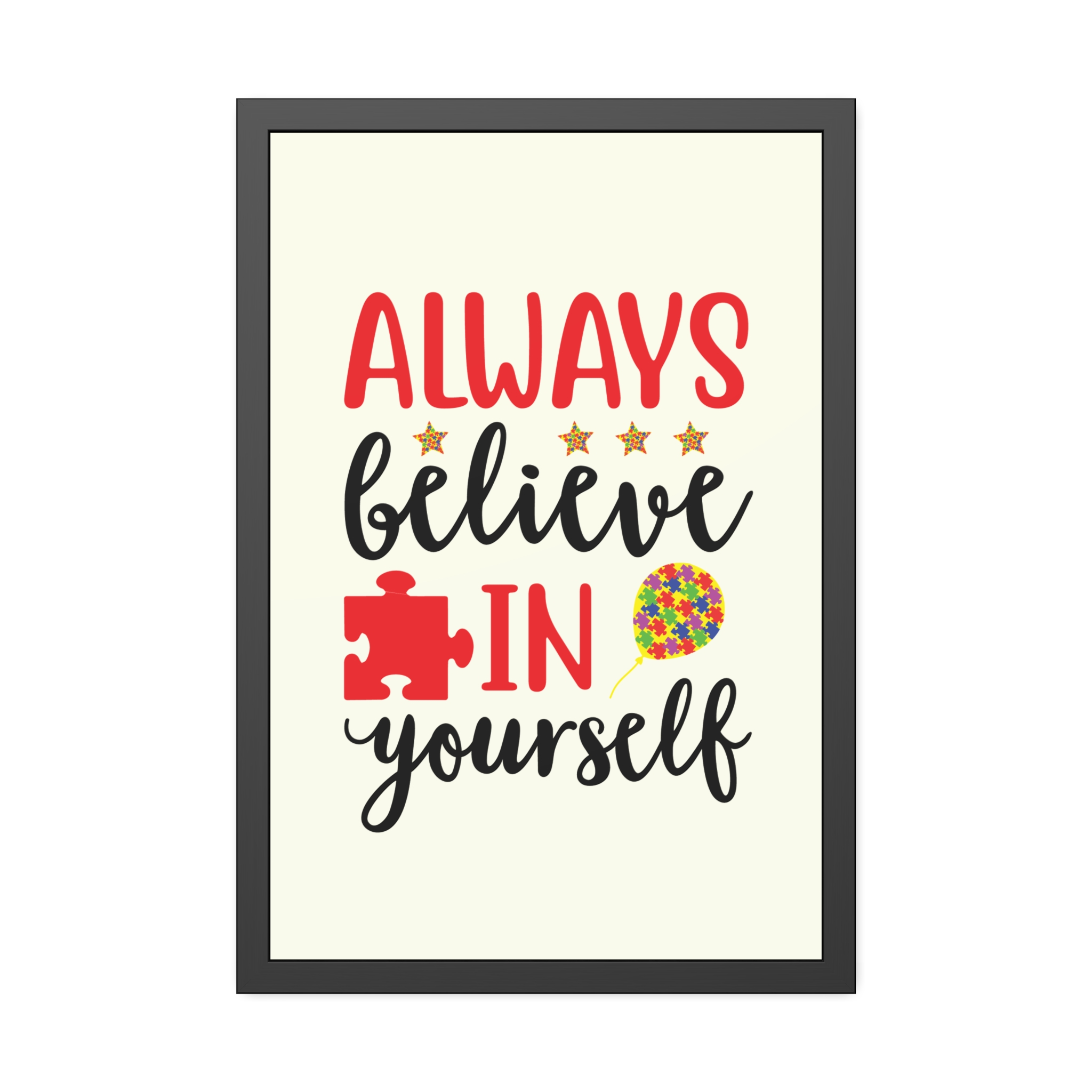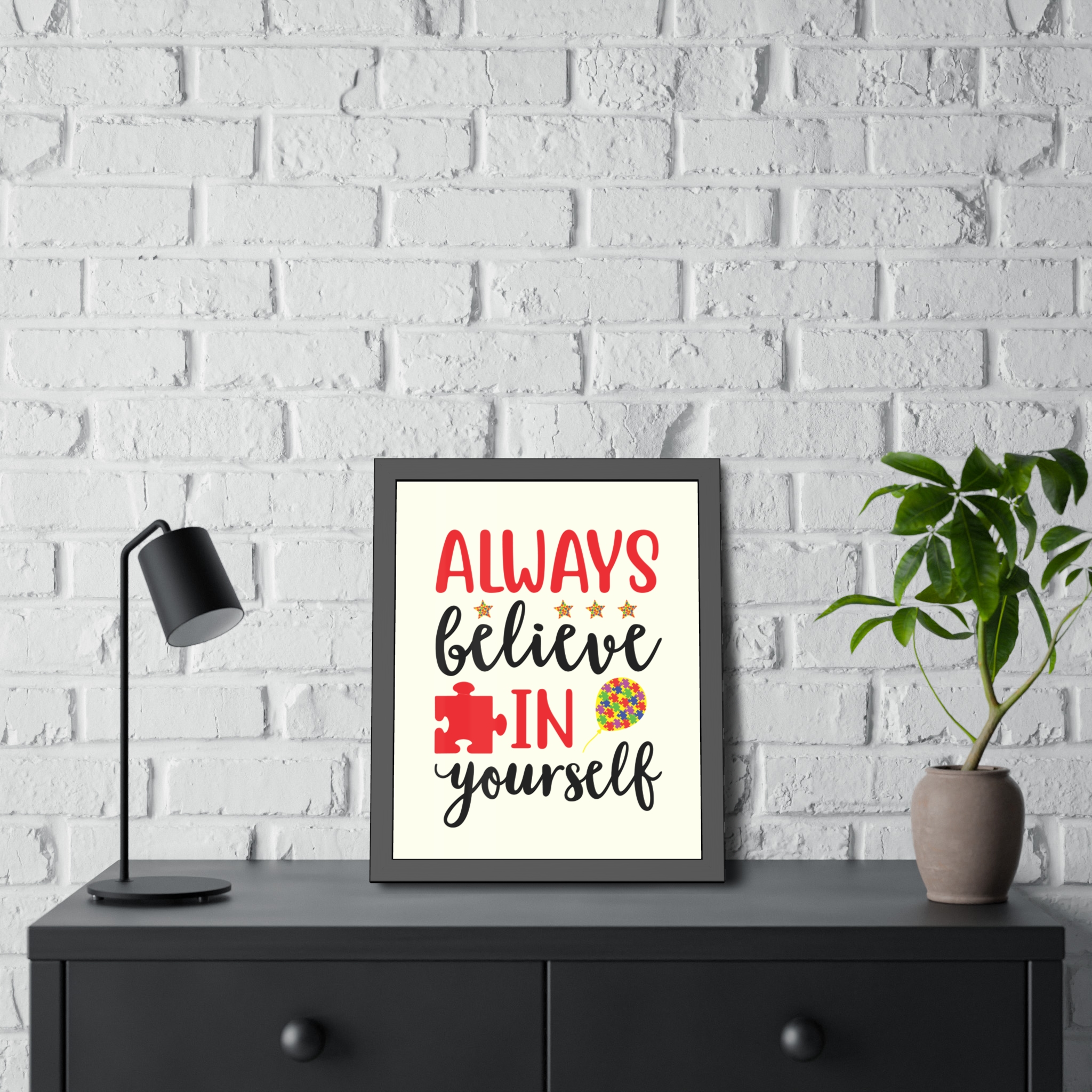 A warm, framed paper poster that speaks gently and clearly: “Always believe in yourself.” Printed on your choice of fine art or semi-gloss paper, the design combines playful script, a bold puzzle-piece motif, and a colorful confetti circle to celebrate perseverance and individuality. The print arrives ready to hang in a matte black pinewood frame with shatter-proof plexiglass and brown paper backing — a simple, polished presentation that brightens a classroom wall, therapy space, kid’s nook, or home office. The colors are vivid and durable, and the lightweight frame sits flat and secure thanks to pre-installed hardware and rubber bumpers. Choose orientation and size to fit a gallery wall or a small shelf display; assembled in the USA from globally sourced parts.