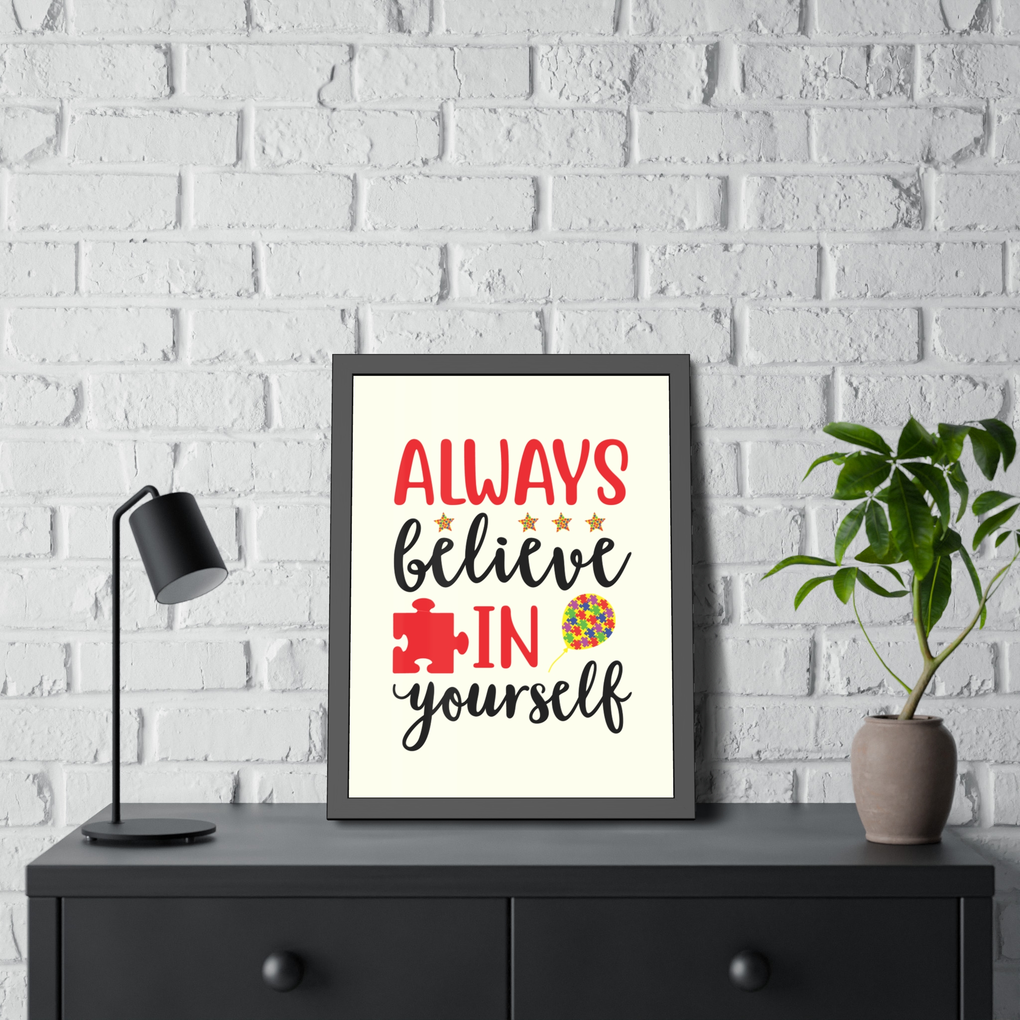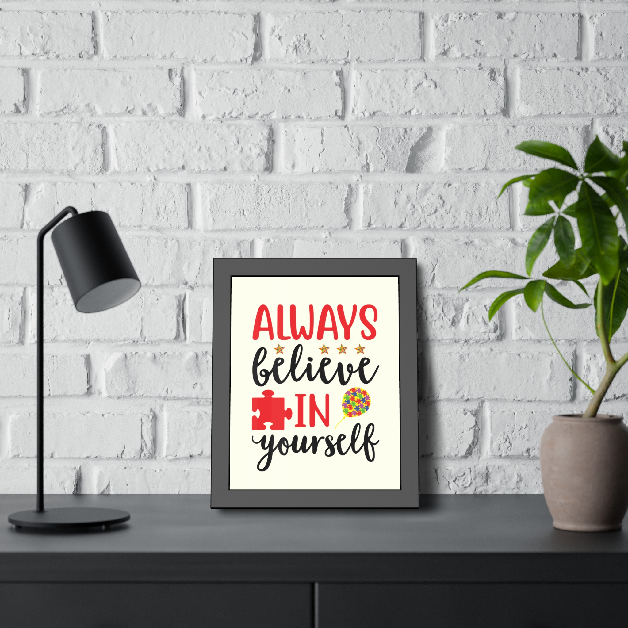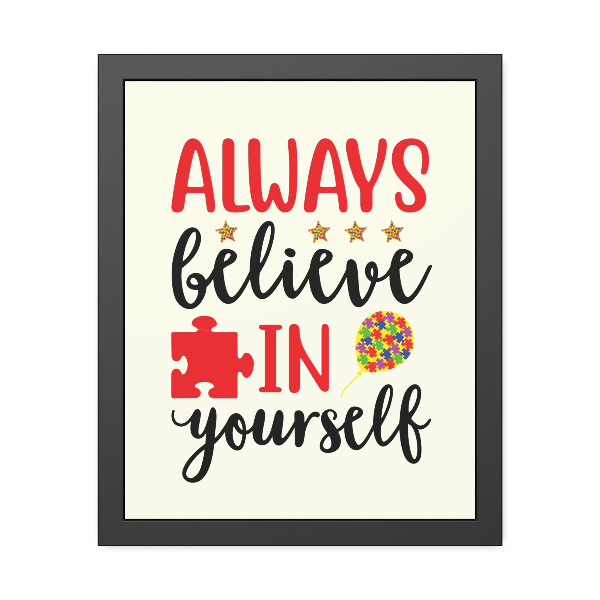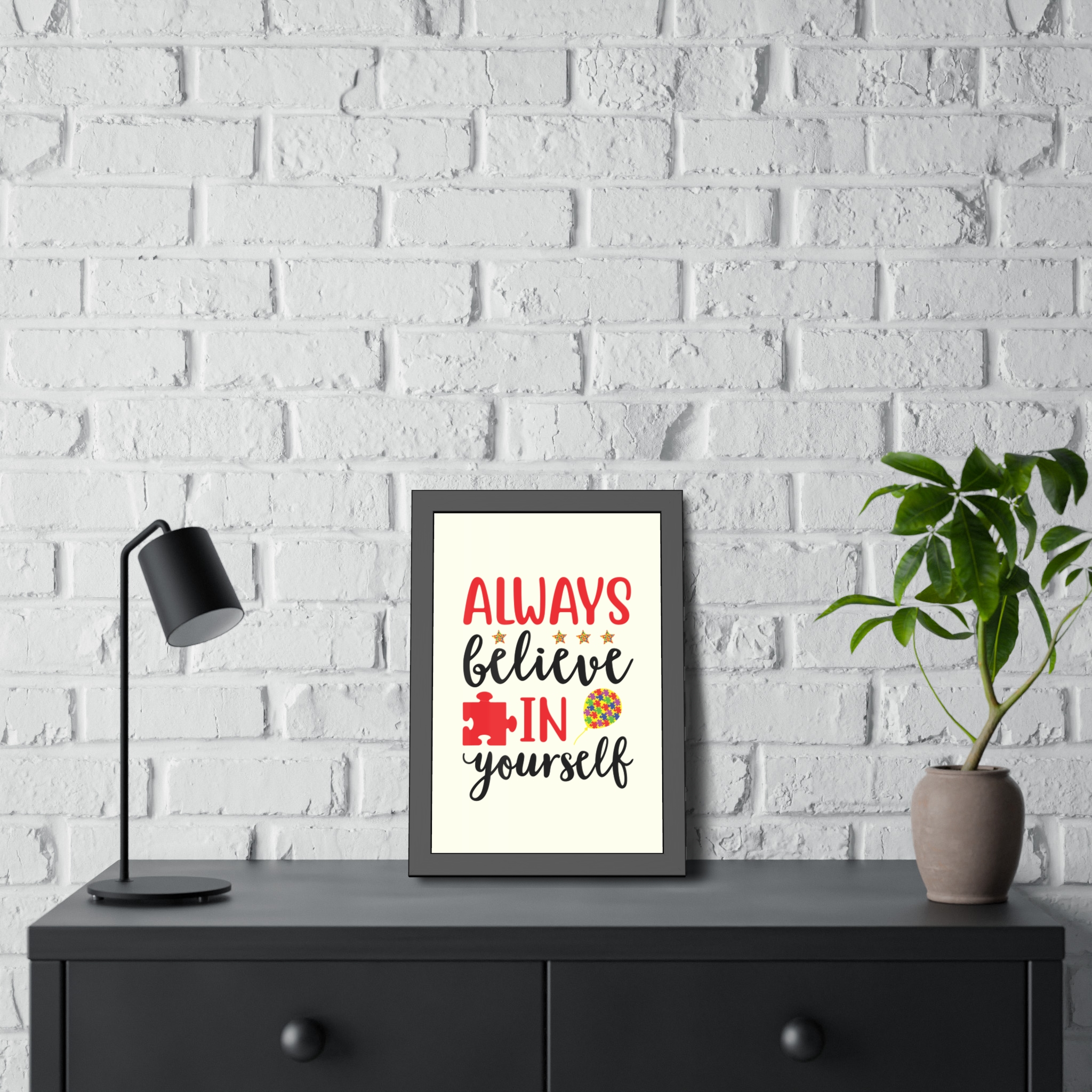 A warm, framed paper poster that speaks gently and clearly: “Always believe in yourself.” Printed on your choice of fine art or semi-gloss paper, the design combines playful script, a bold puzzle-piece motif, and a colorful confetti circle to celebrate perseverance and individuality. The print arrives ready to hang in a matte black pinewood frame with shatter-proof plexiglass and brown paper backing — a simple, polished presentation that brightens a classroom wall, therapy space, kid’s nook, or home office. The colors are vivid and durable, and the lightweight frame sits flat and secure thanks to pre-installed hardware and rubber bumpers. Choose orientation and size to fit a gallery wall or a small shelf display; assembled in the USA from globally sourced parts.