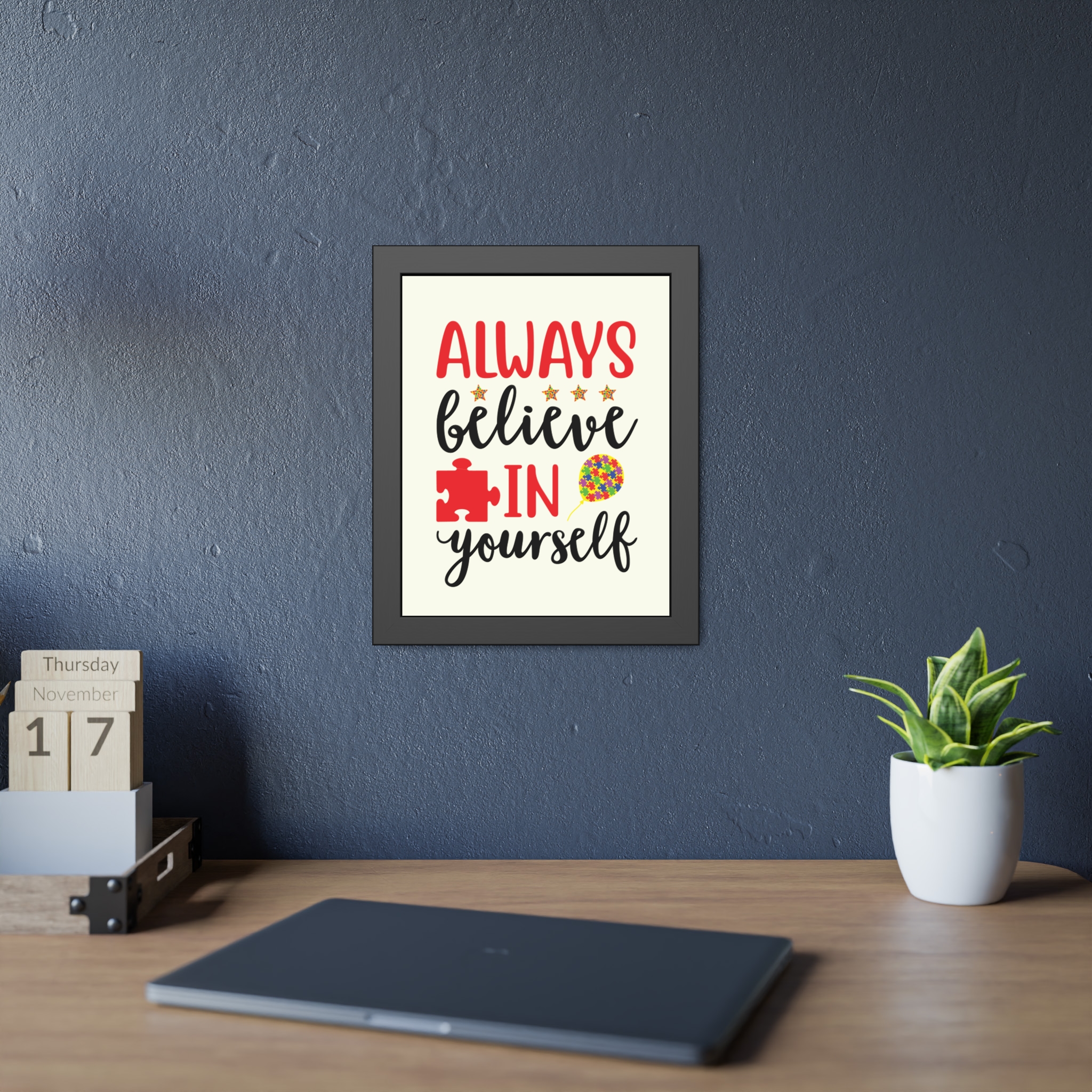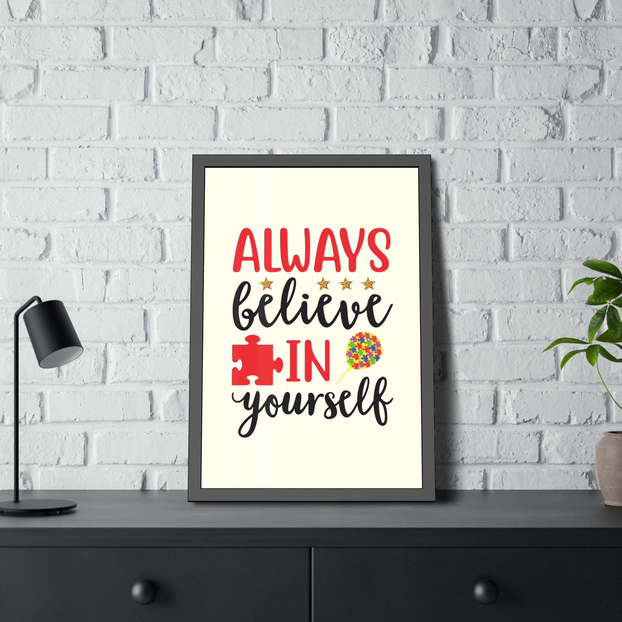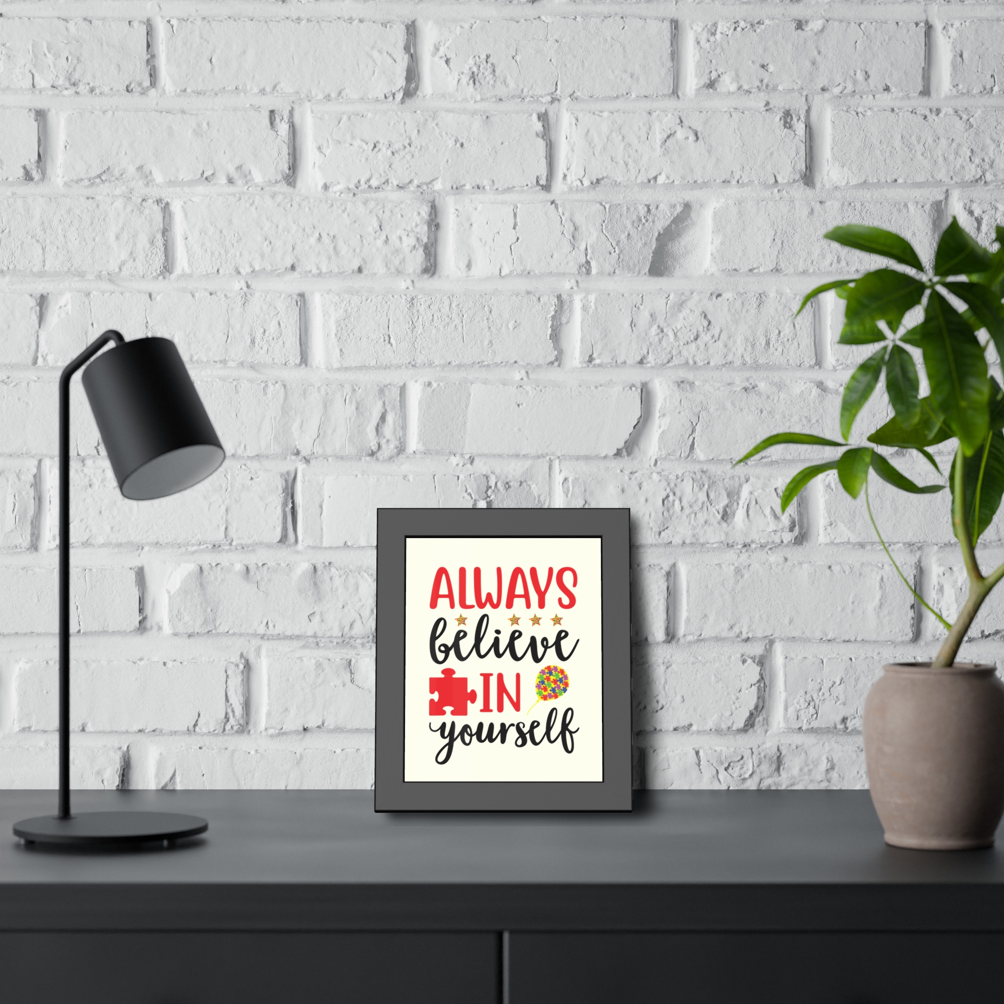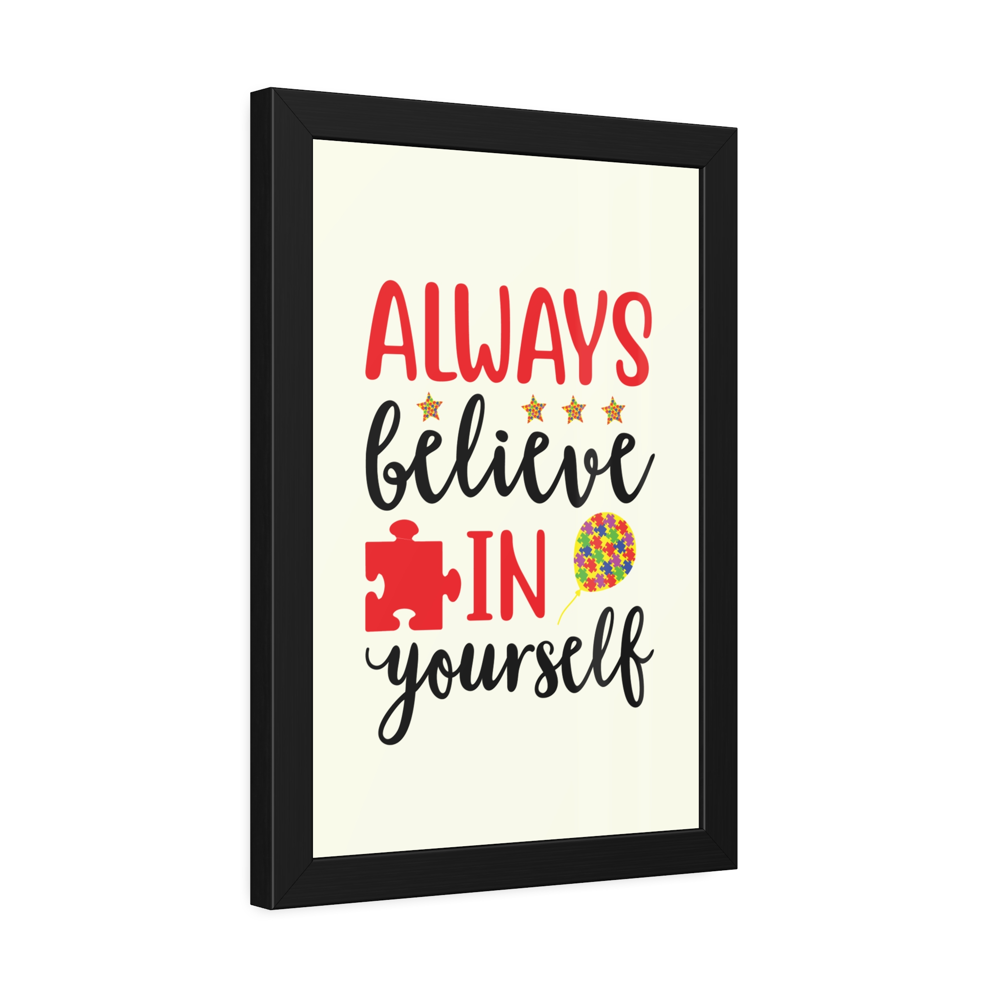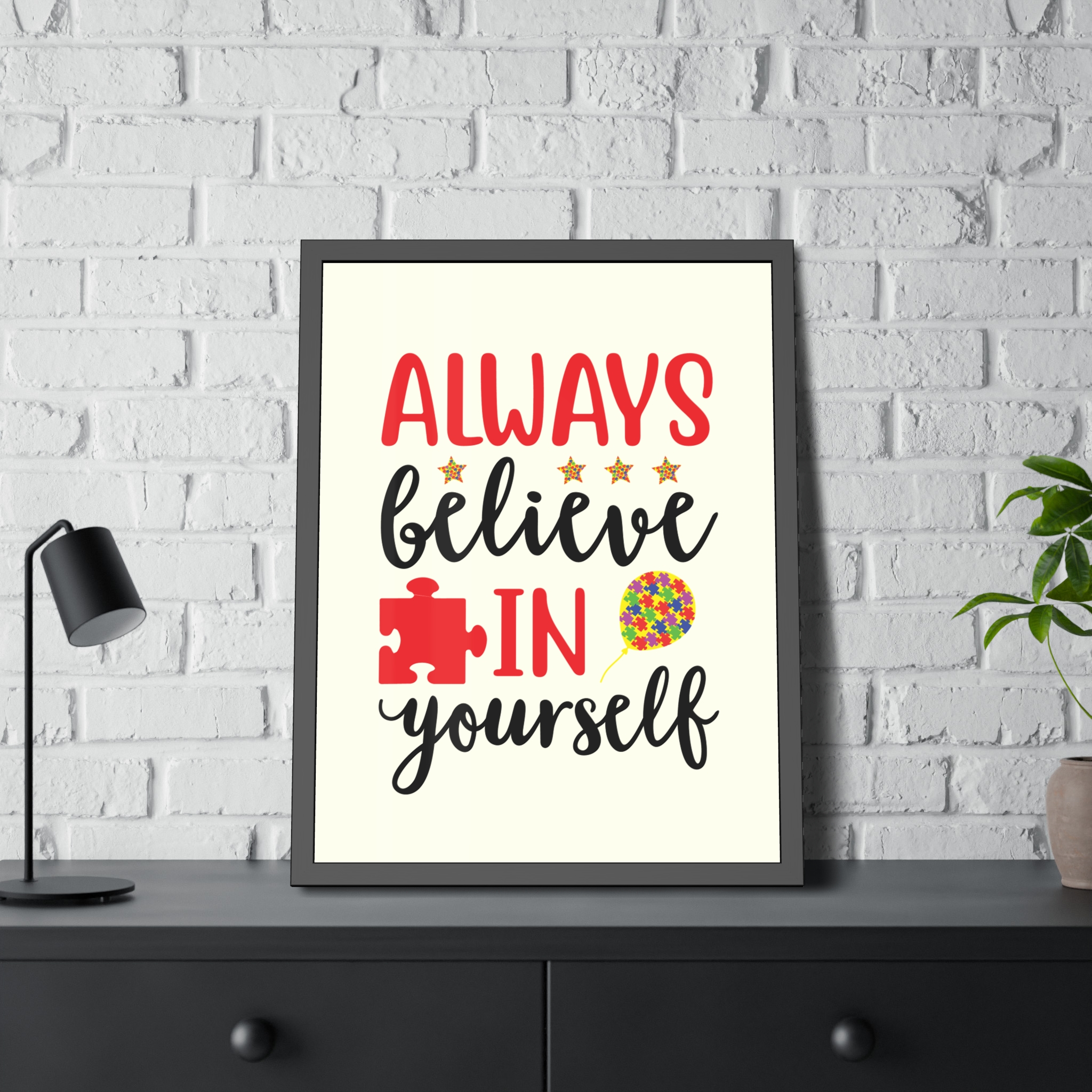 A warm, framed paper poster that speaks gently and clearly: “Always believe in yourself.” Printed on your choice of fine art or semi-gloss paper, the design combines playful script, a bold puzzle-piece motif, and a colorful confetti circle to celebrate perseverance and individuality. The print arrives ready to hang in a matte black pinewood frame with shatter-proof plexiglass and brown paper backing — a simple, polished presentation that brightens a classroom wall, therapy space, kid’s nook, or home office. The colors are vivid and durable, and the lightweight frame sits flat and secure thanks to pre-installed hardware and rubber bumpers. Choose orientation and size to fit a gallery wall or a small shelf display; assembled in the USA from globally sourced parts.