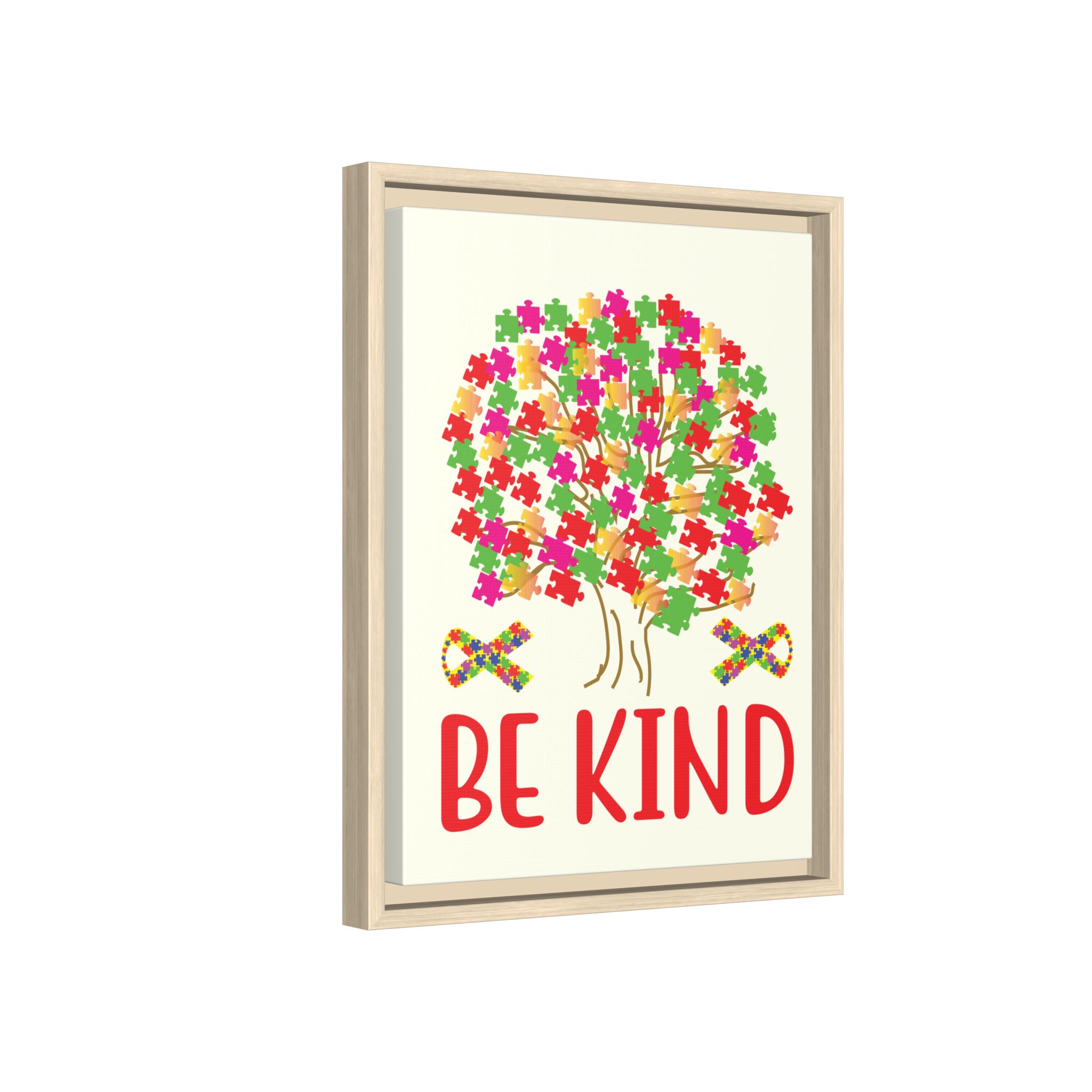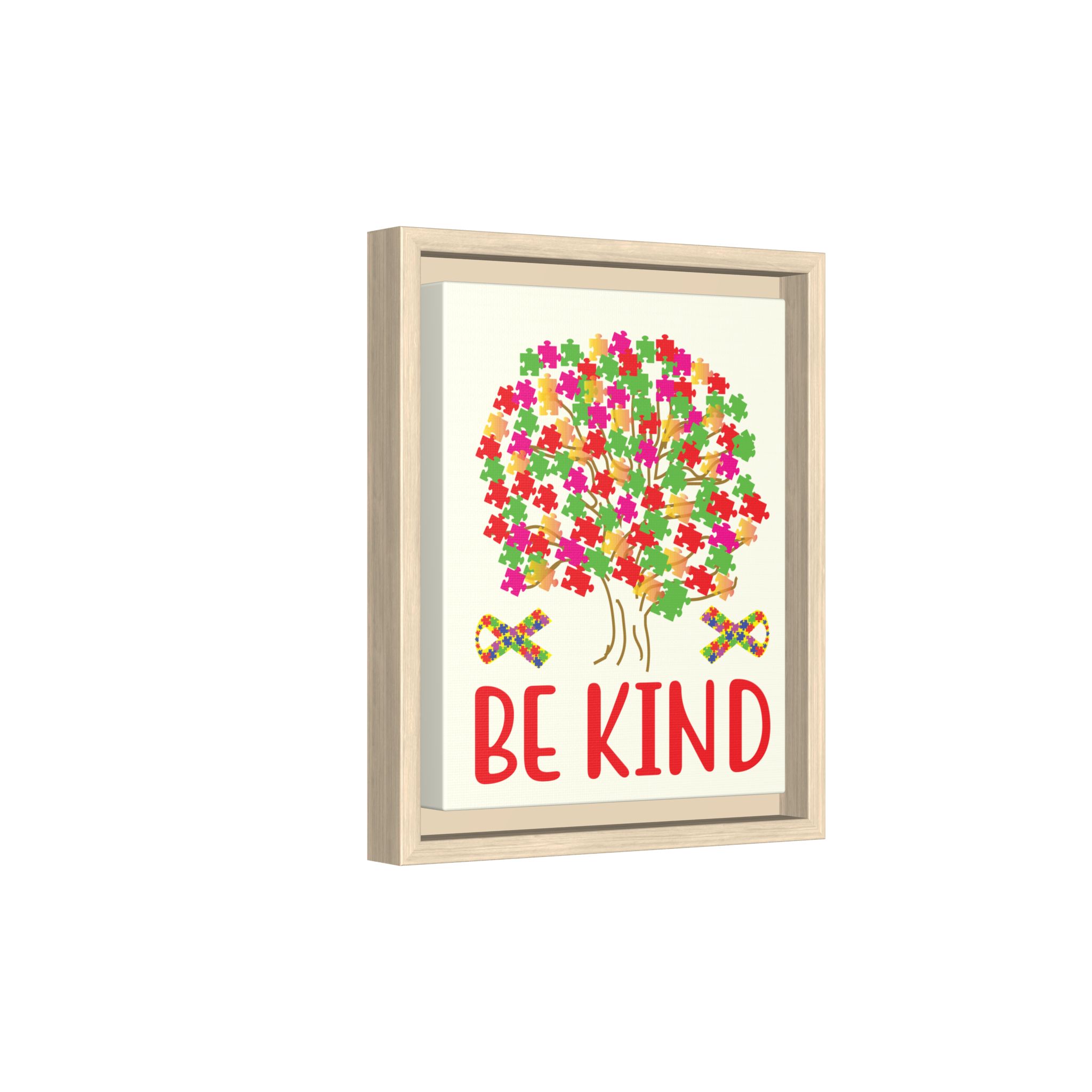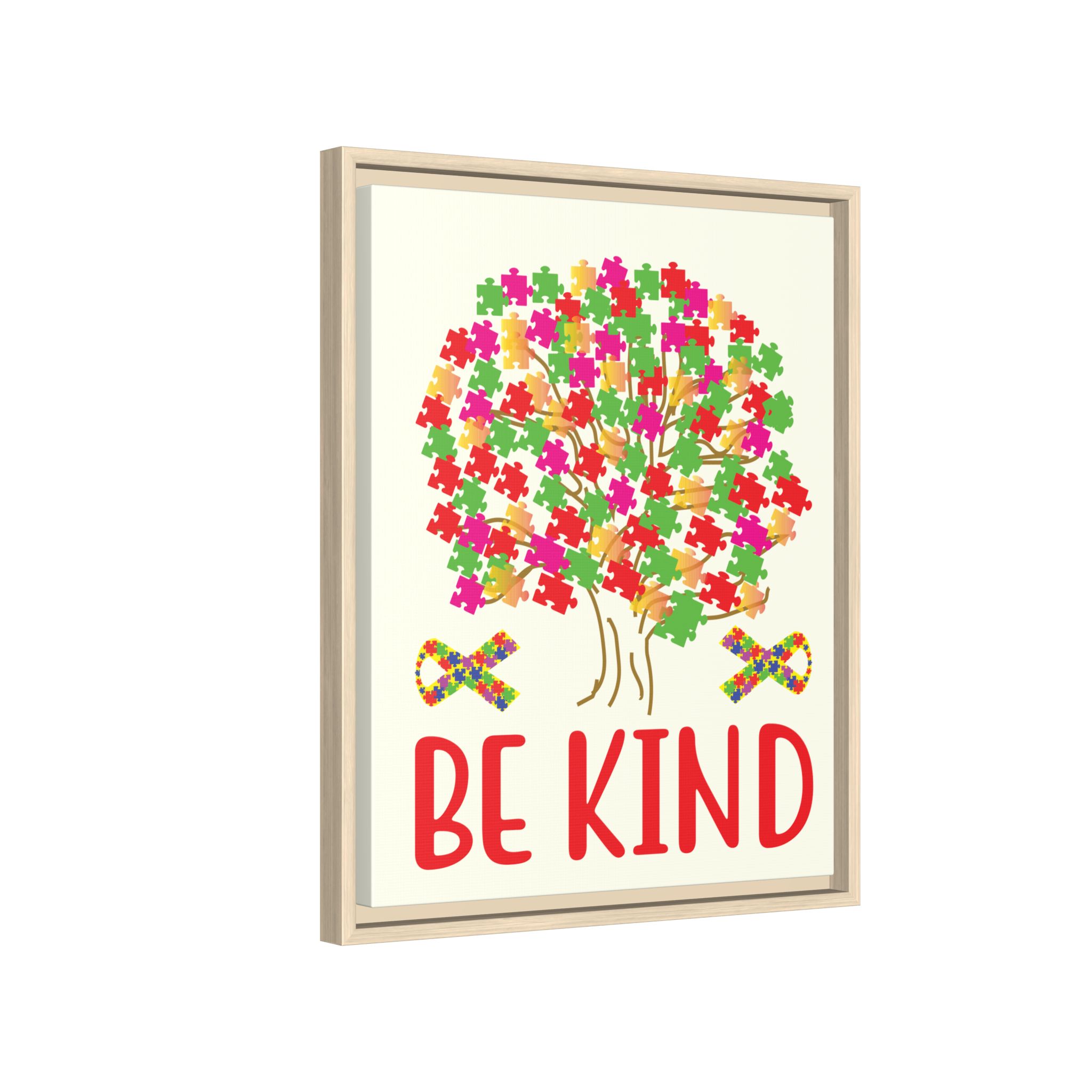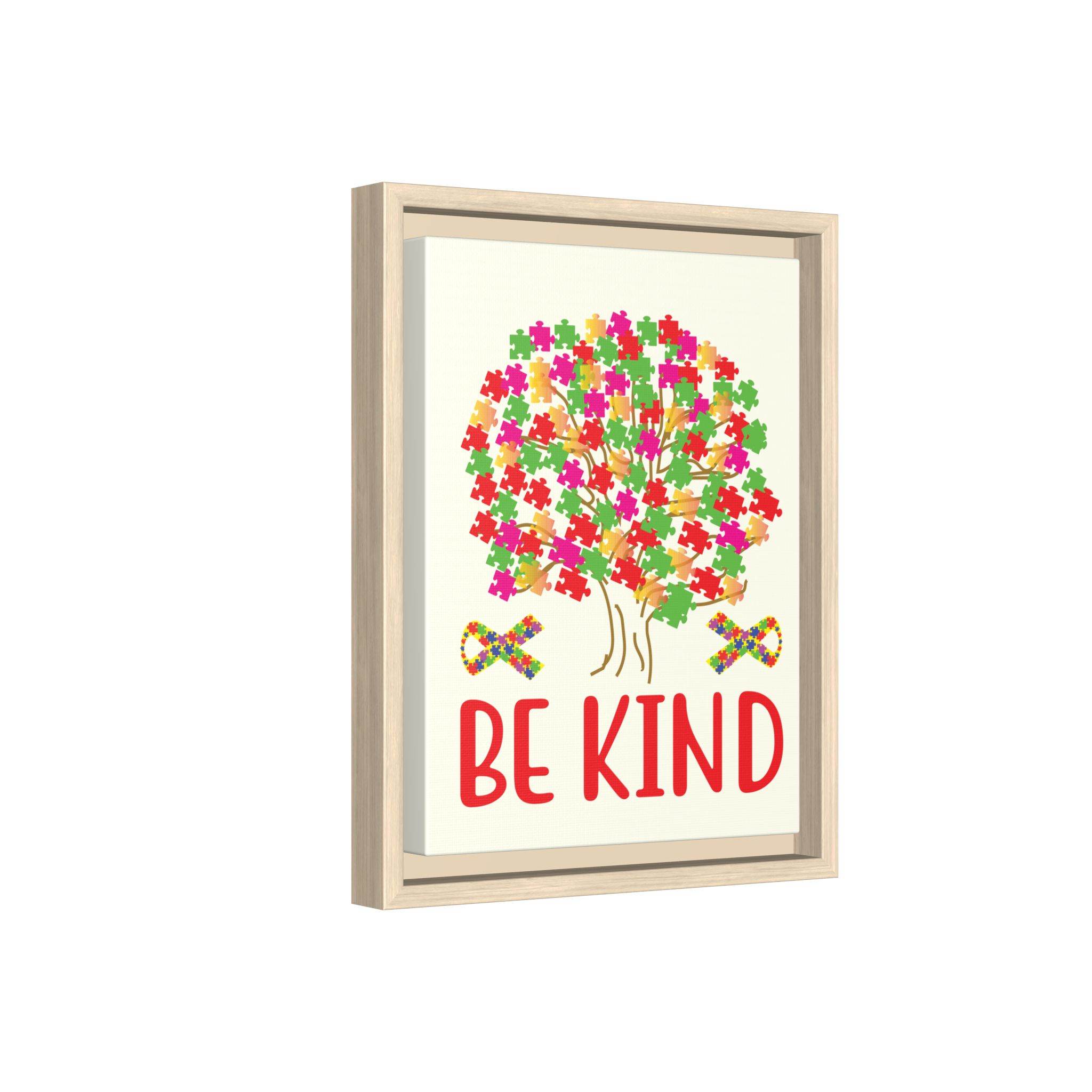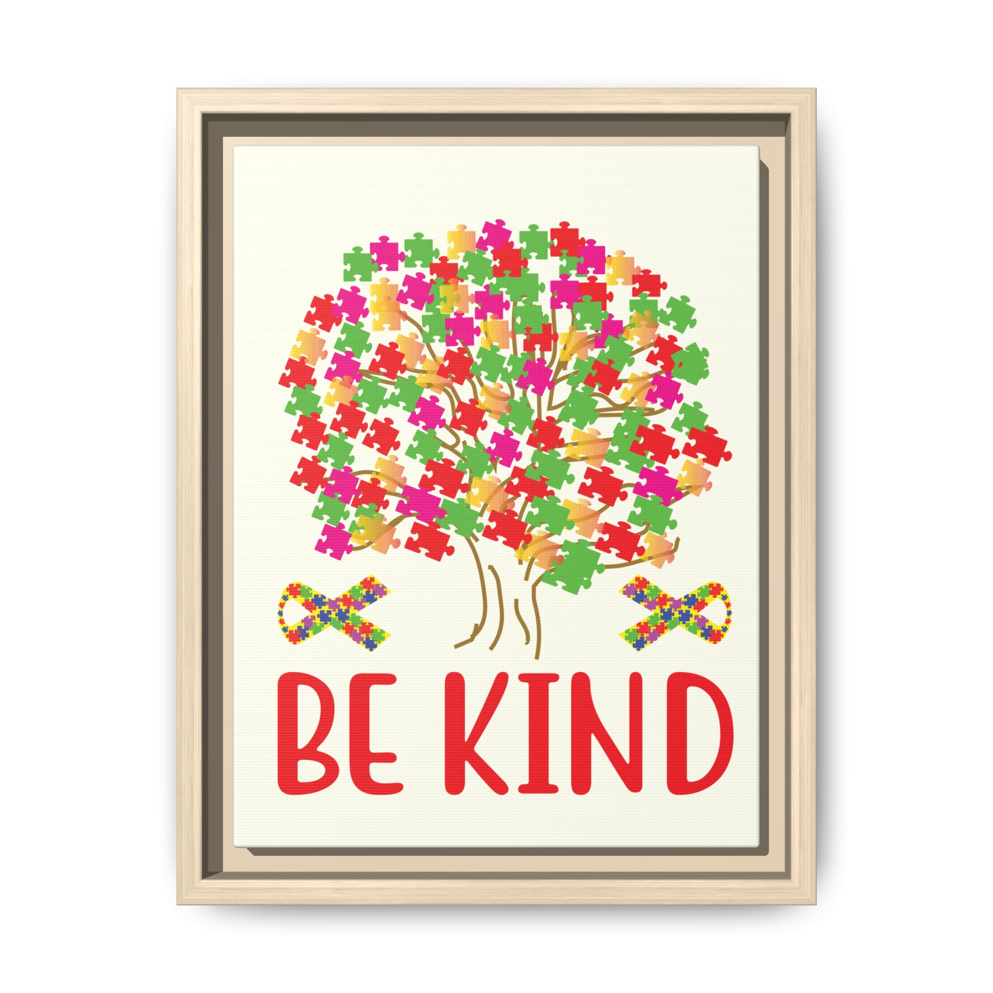 This matte canvas print framed in a slim pine profile brings warmth and intention to a room. The artwork — a colorful tree formed from puzzle-piece leaves with two ribbon motifs and the phrase “BE KIND” — reads clearly from a distance while offering bright, cheerful detail up close. The fine matte surface reduces glare and deepens color saturation, making the reds, greens, pinks and golds pop against a soft cream background. Lightweight but sturdily stretched on sustainably sourced pine, it arrives ready to hang with sawtooth hardware and a contemporary black or natural frame option that suits living rooms, classrooms, entryways, or quiet corners where a little reminder matters.