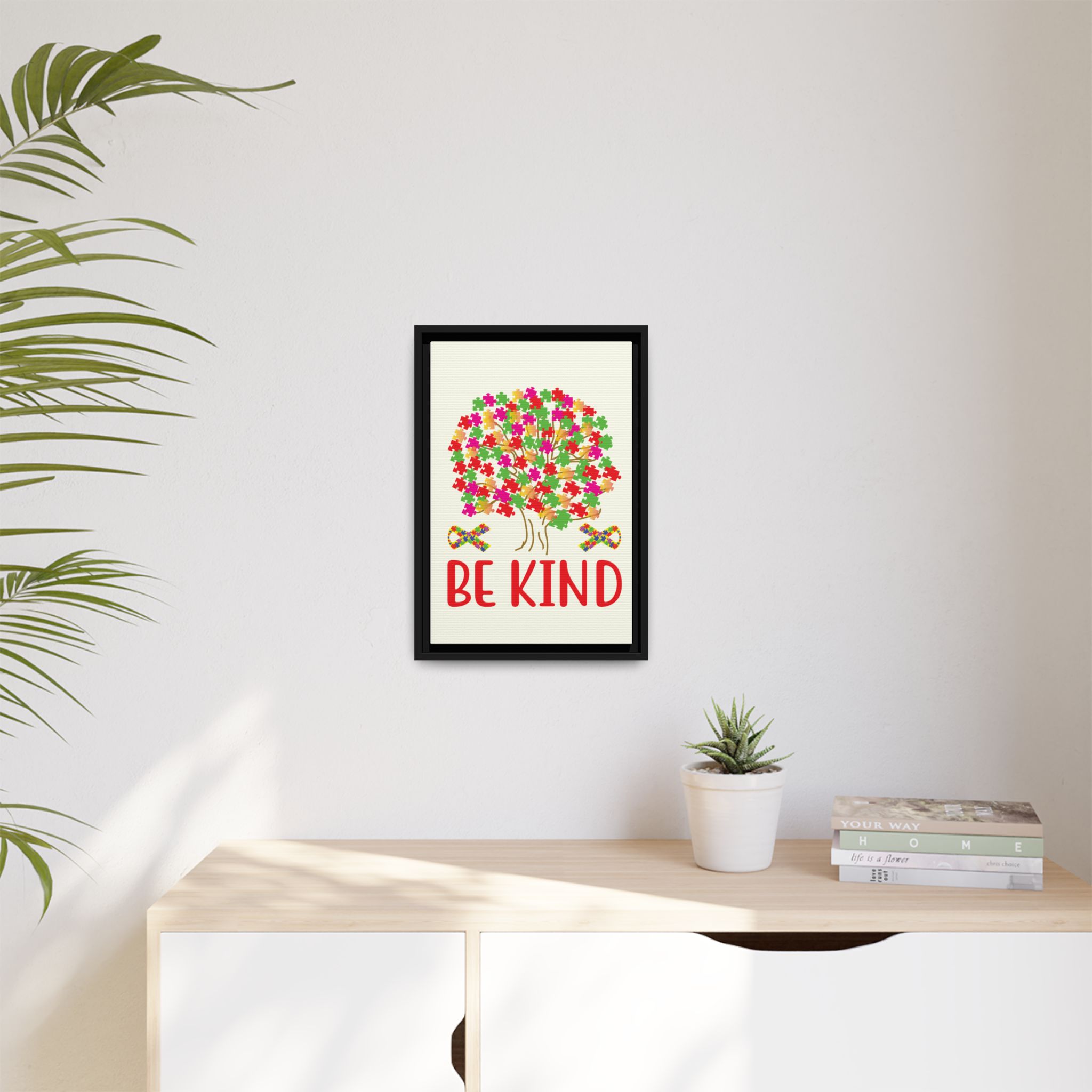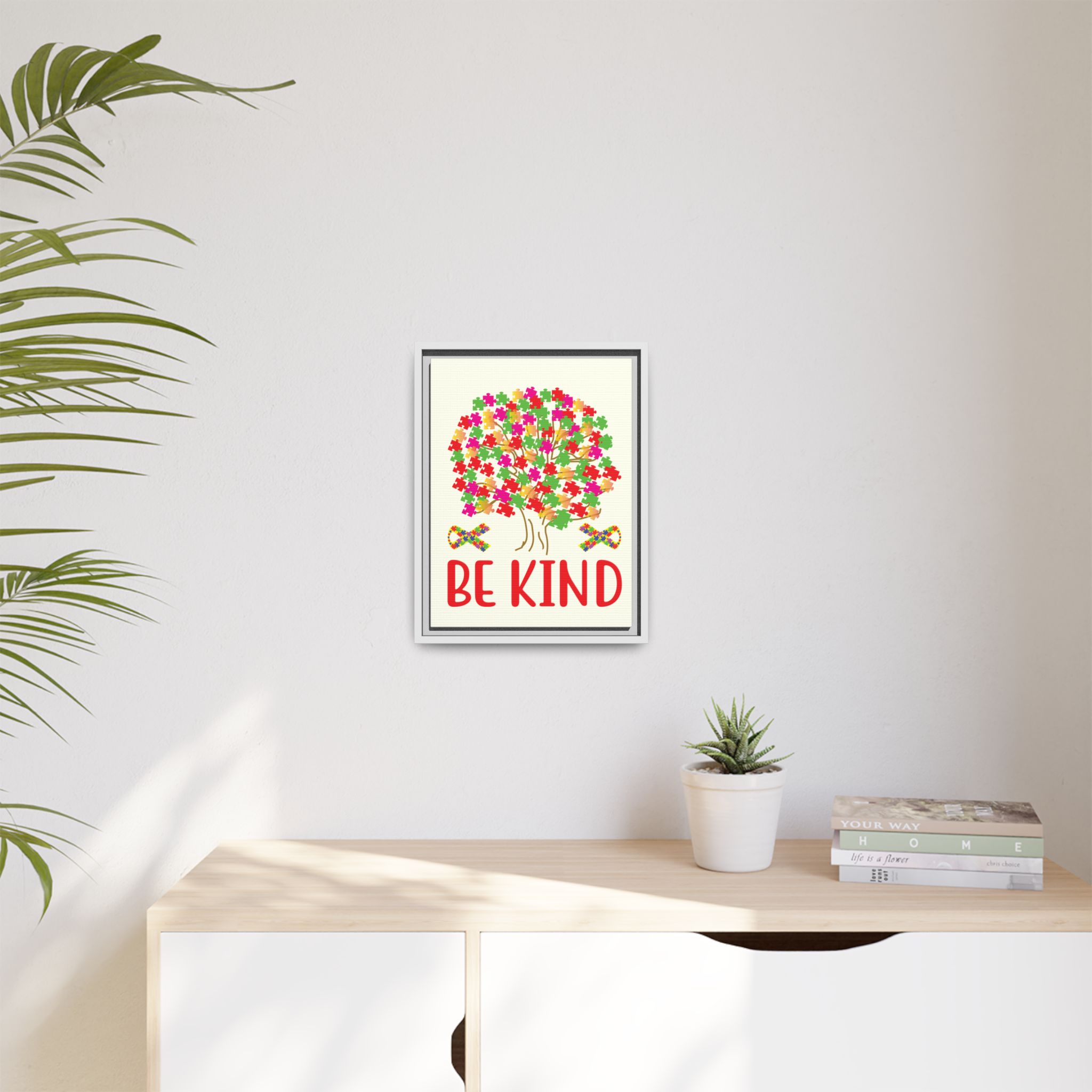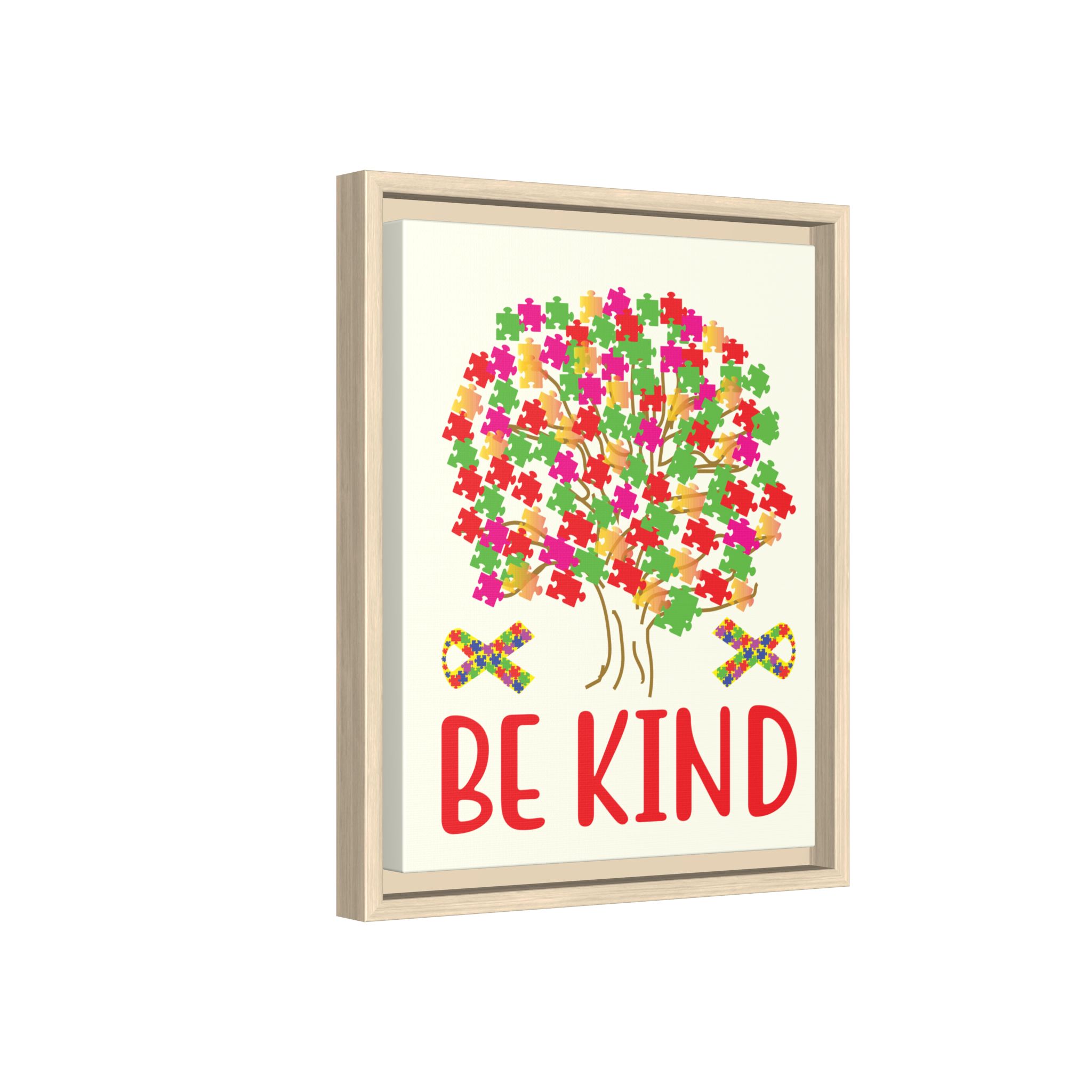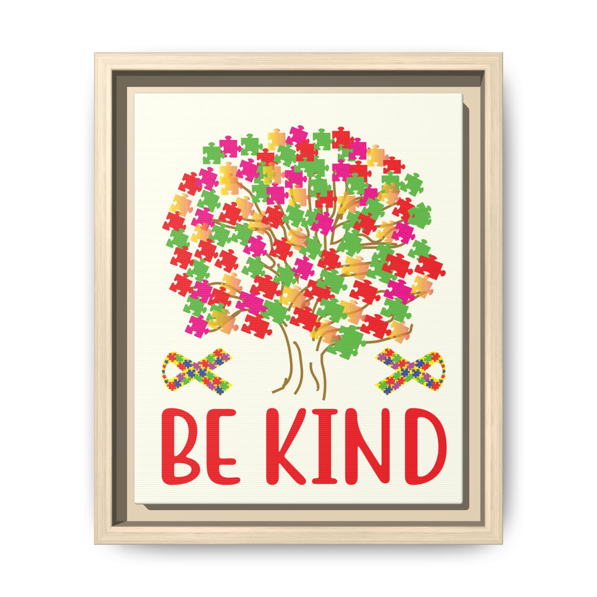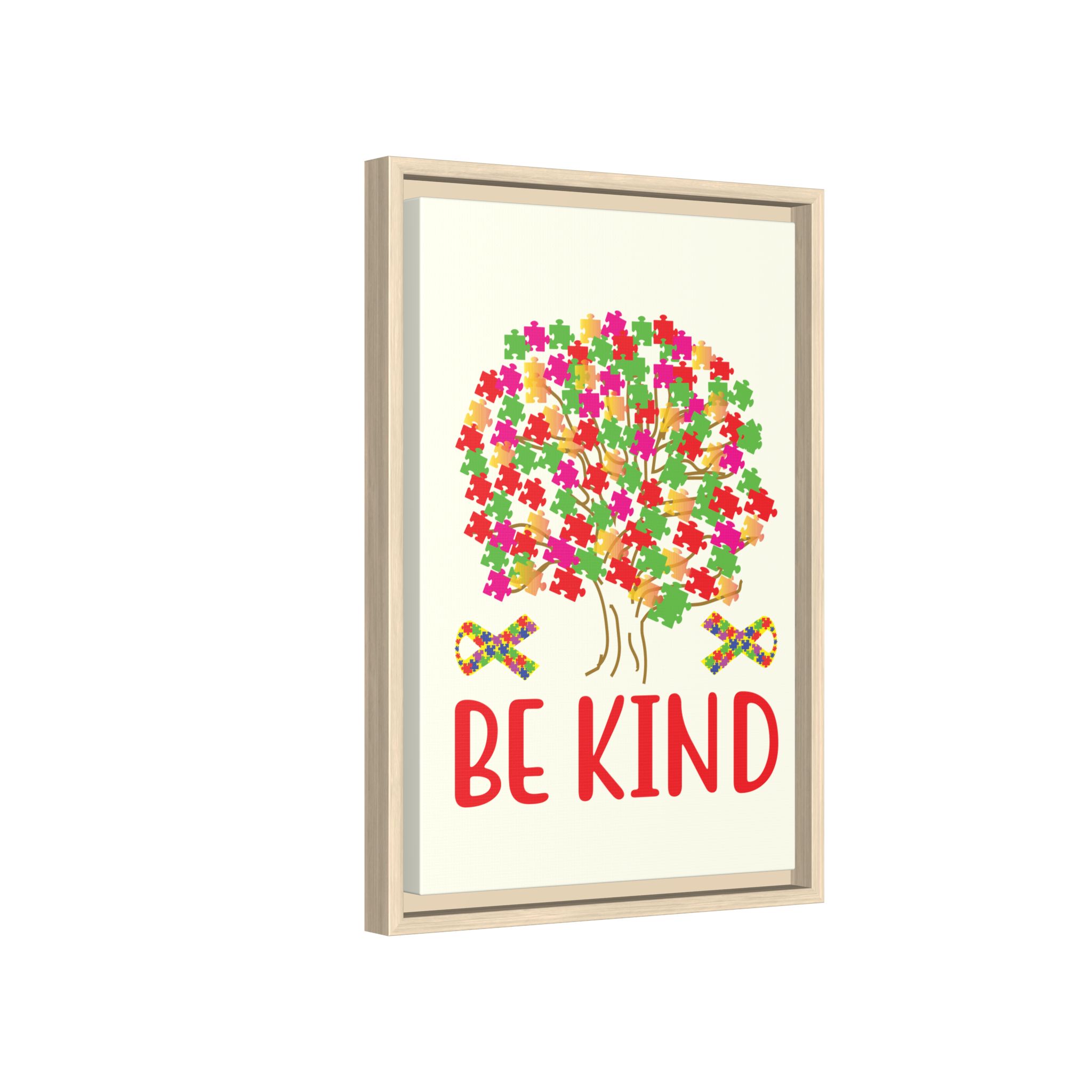 This matte canvas print framed in a slim pine profile brings warmth and intention to a room. The artwork — a colorful tree formed from puzzle-piece leaves with two ribbon motifs and the phrase “BE KIND” — reads clearly from a distance while offering bright, cheerful detail up close. The fine matte surface reduces glare and deepens color saturation, making the reds, greens, pinks and golds pop against a soft cream background. Lightweight but sturdily stretched on sustainably sourced pine, it arrives ready to hang with sawtooth hardware and a contemporary black or natural frame option that suits living rooms, classrooms, entryways, or quiet corners where a little reminder matters.