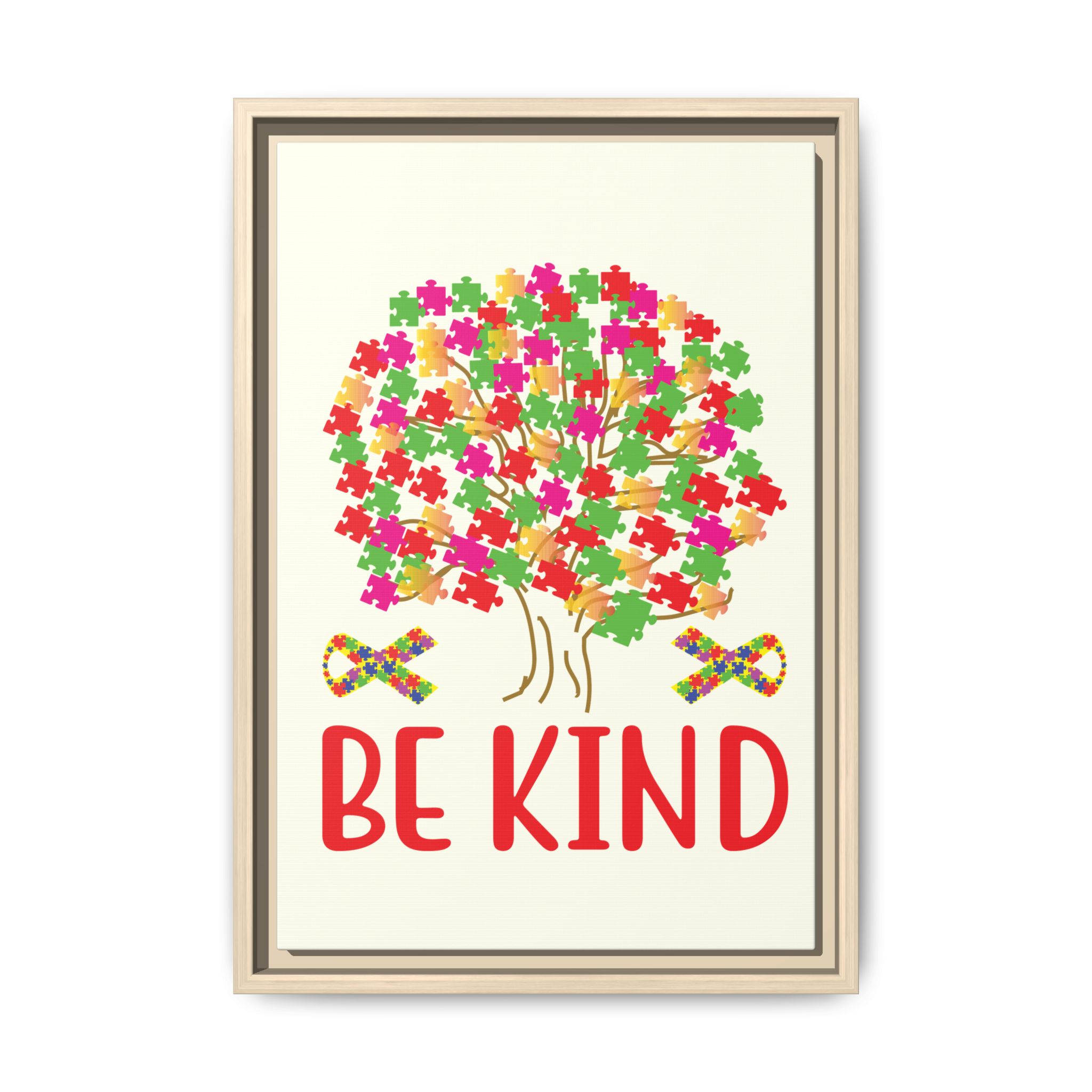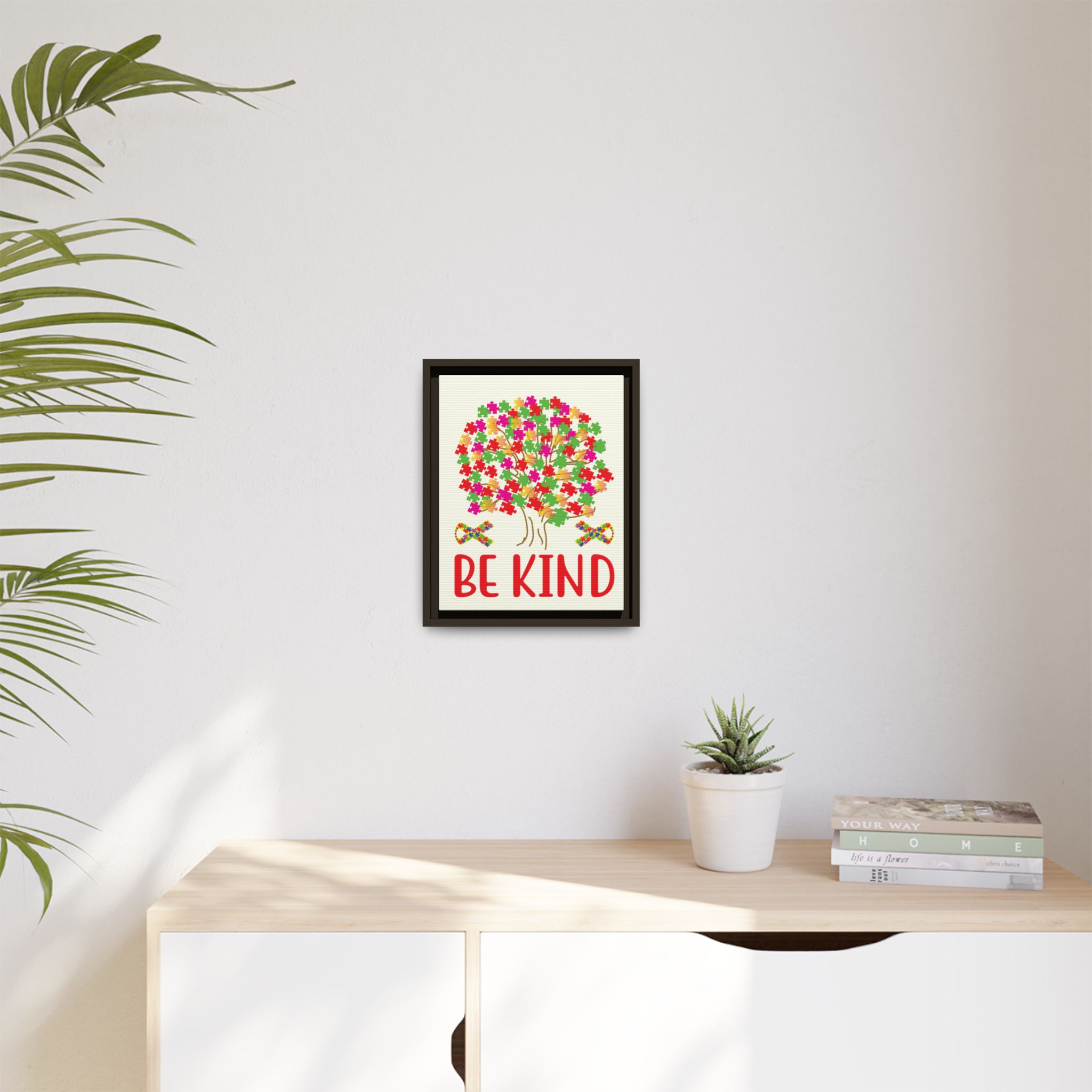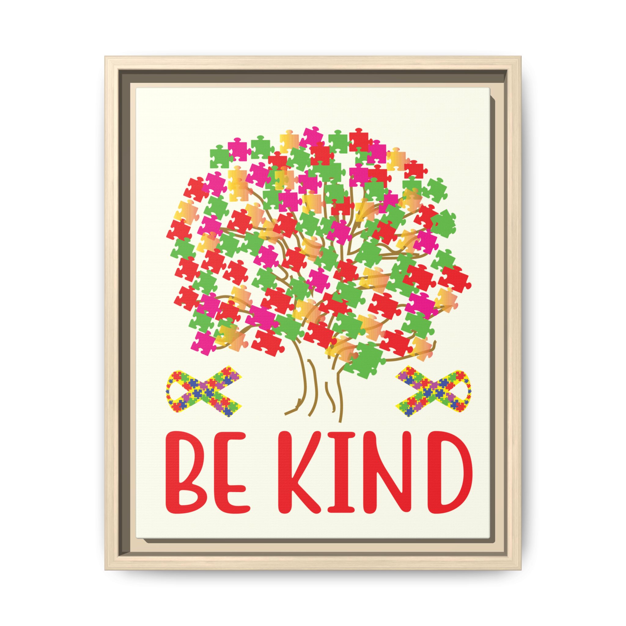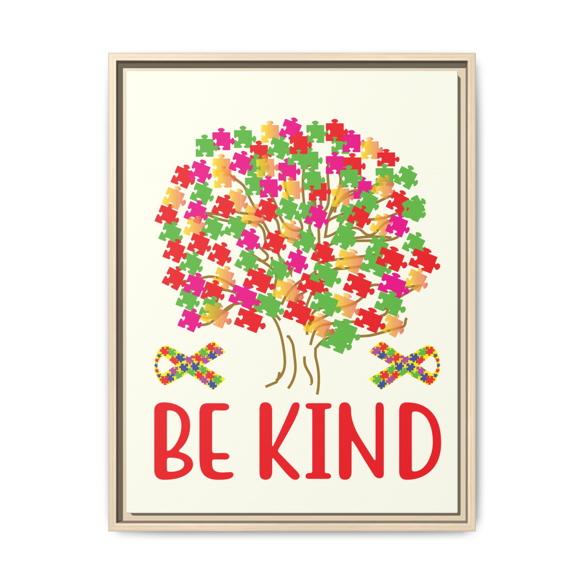 This matte canvas print framed in a slim pine profile brings warmth and intention to a room. The artwork — a colorful tree formed from puzzle-piece leaves with two ribbon motifs and the phrase “BE KIND” — reads clearly from a distance while offering bright, cheerful detail up close. The fine matte surface reduces glare and deepens color saturation, making the reds, greens, pinks and golds pop against a soft cream background. Lightweight but sturdily stretched on sustainably sourced pine, it arrives ready to hang with sawtooth hardware and a contemporary black or natural frame option that suits living rooms, classrooms, entryways, or quiet corners where a little reminder matters.