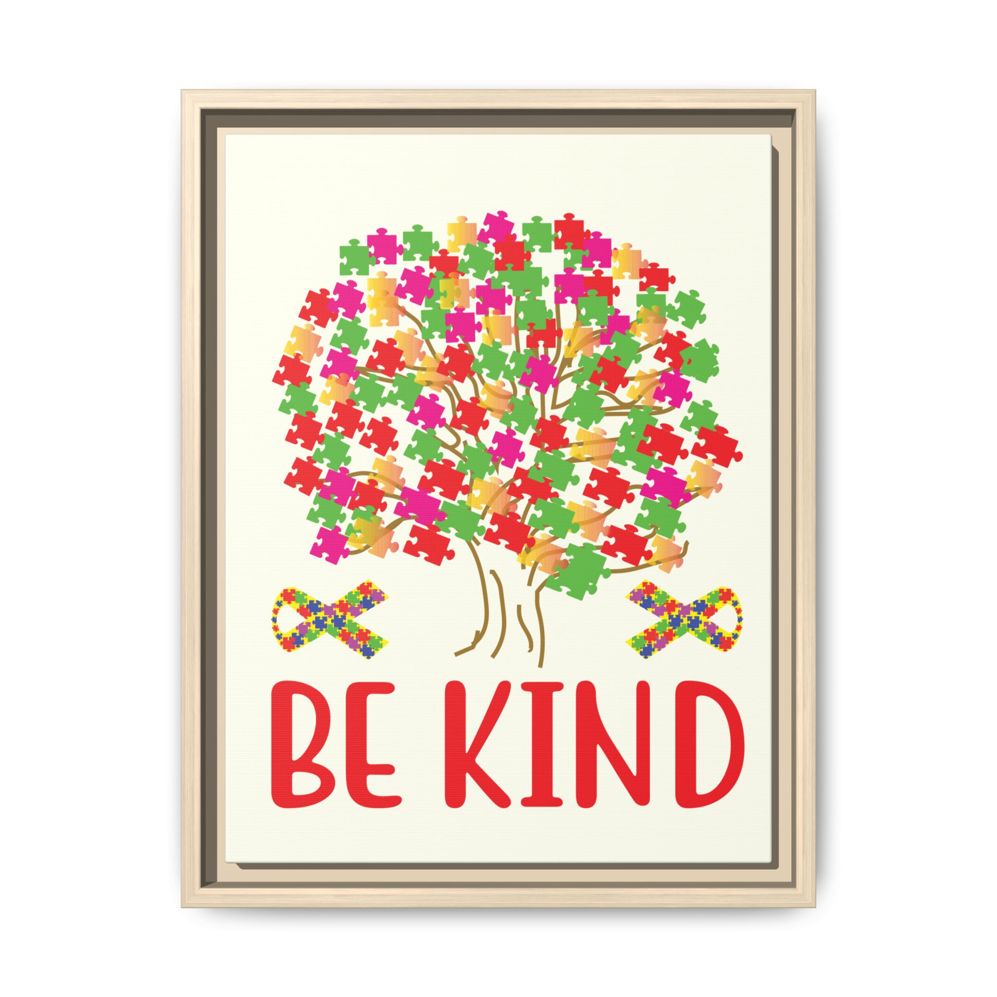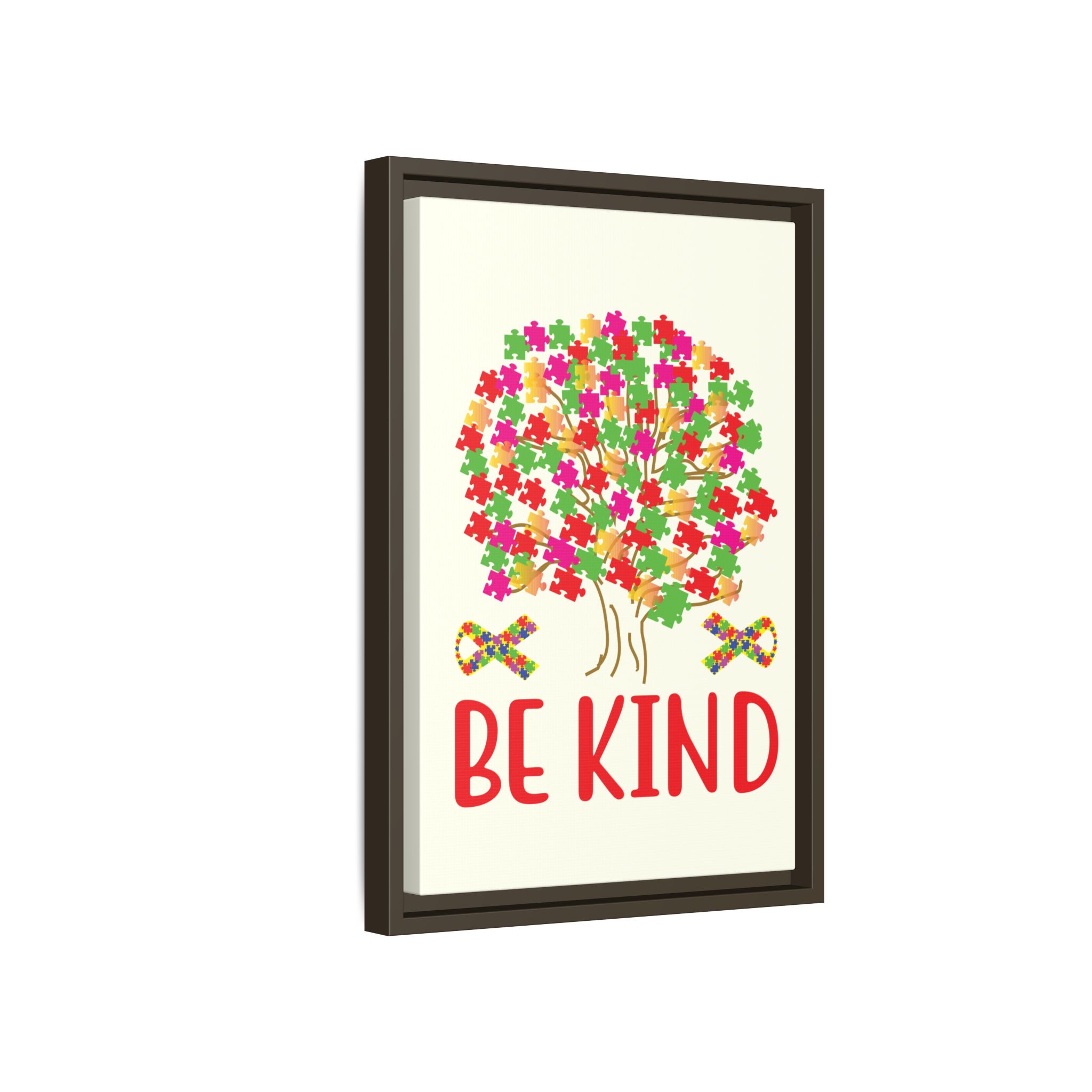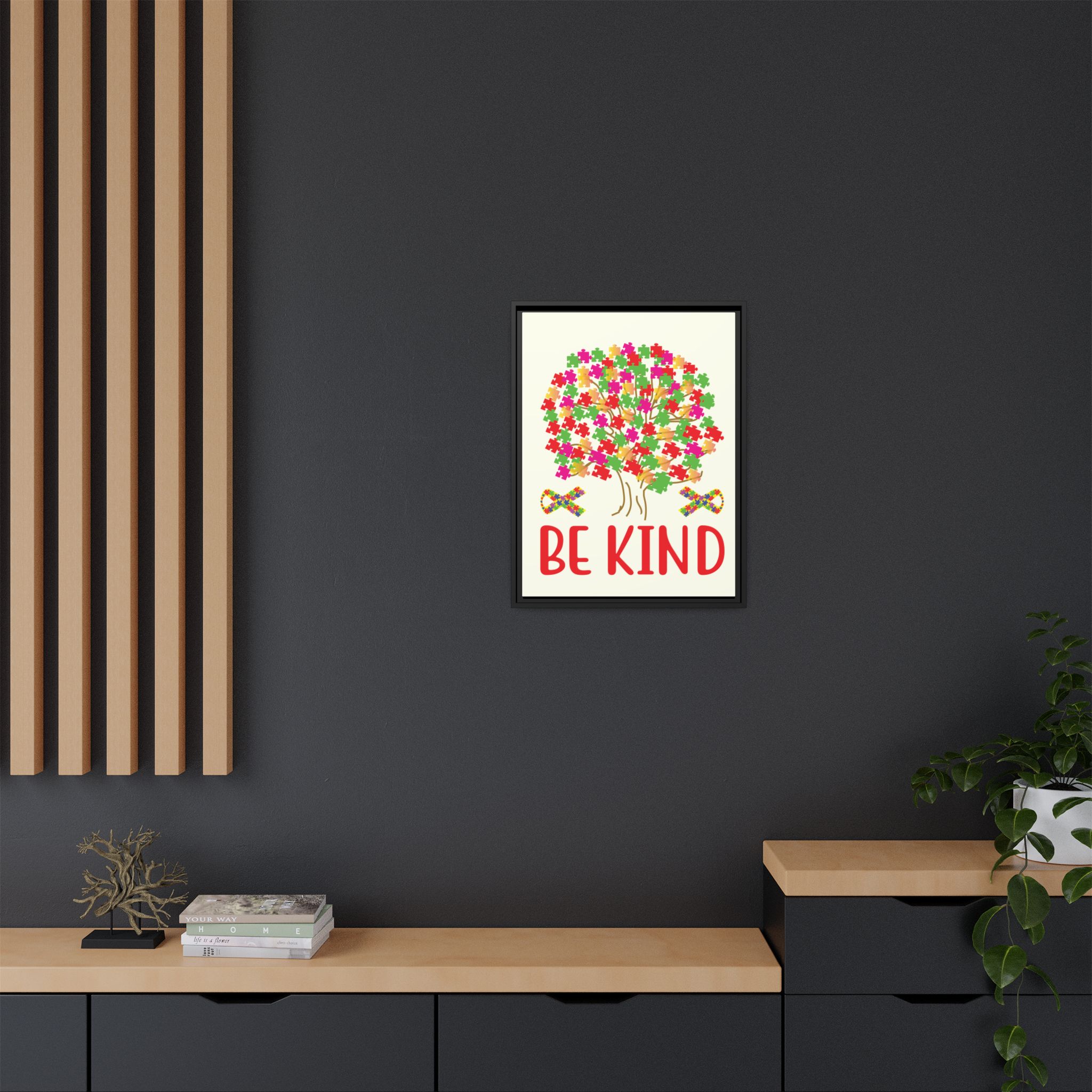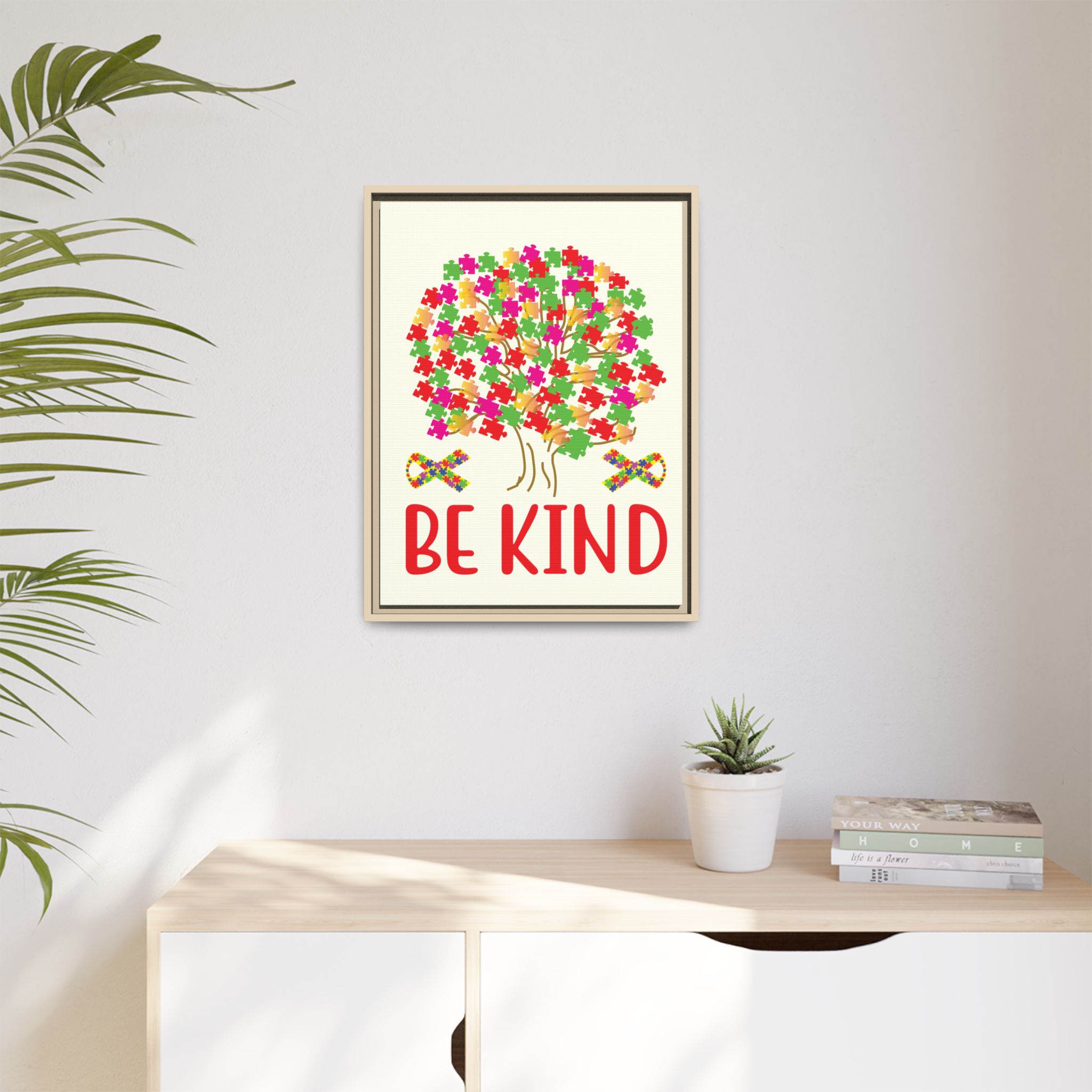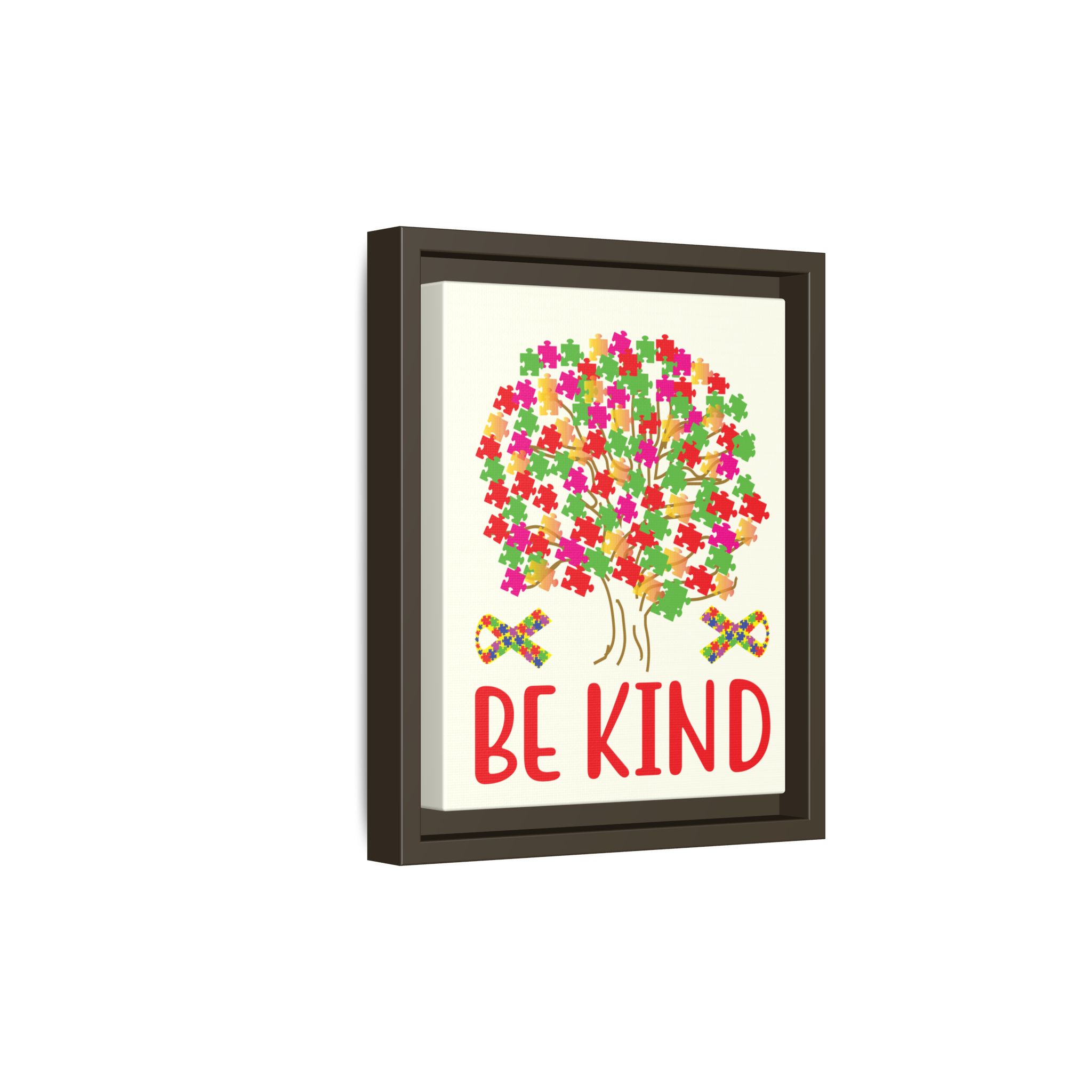 This matte canvas print framed in a slim pine profile brings warmth and intention to a room. The artwork — a colorful tree formed from puzzle-piece leaves with two ribbon motifs and the phrase “BE KIND” — reads clearly from a distance while offering bright, cheerful detail up close. The fine matte surface reduces glare and deepens color saturation, making the reds, greens, pinks and golds pop against a soft cream background. Lightweight but sturdily stretched on sustainably sourced pine, it arrives ready to hang with sawtooth hardware and a contemporary black or natural frame option that suits living rooms, classrooms, entryways, or quiet corners where a little reminder matters.