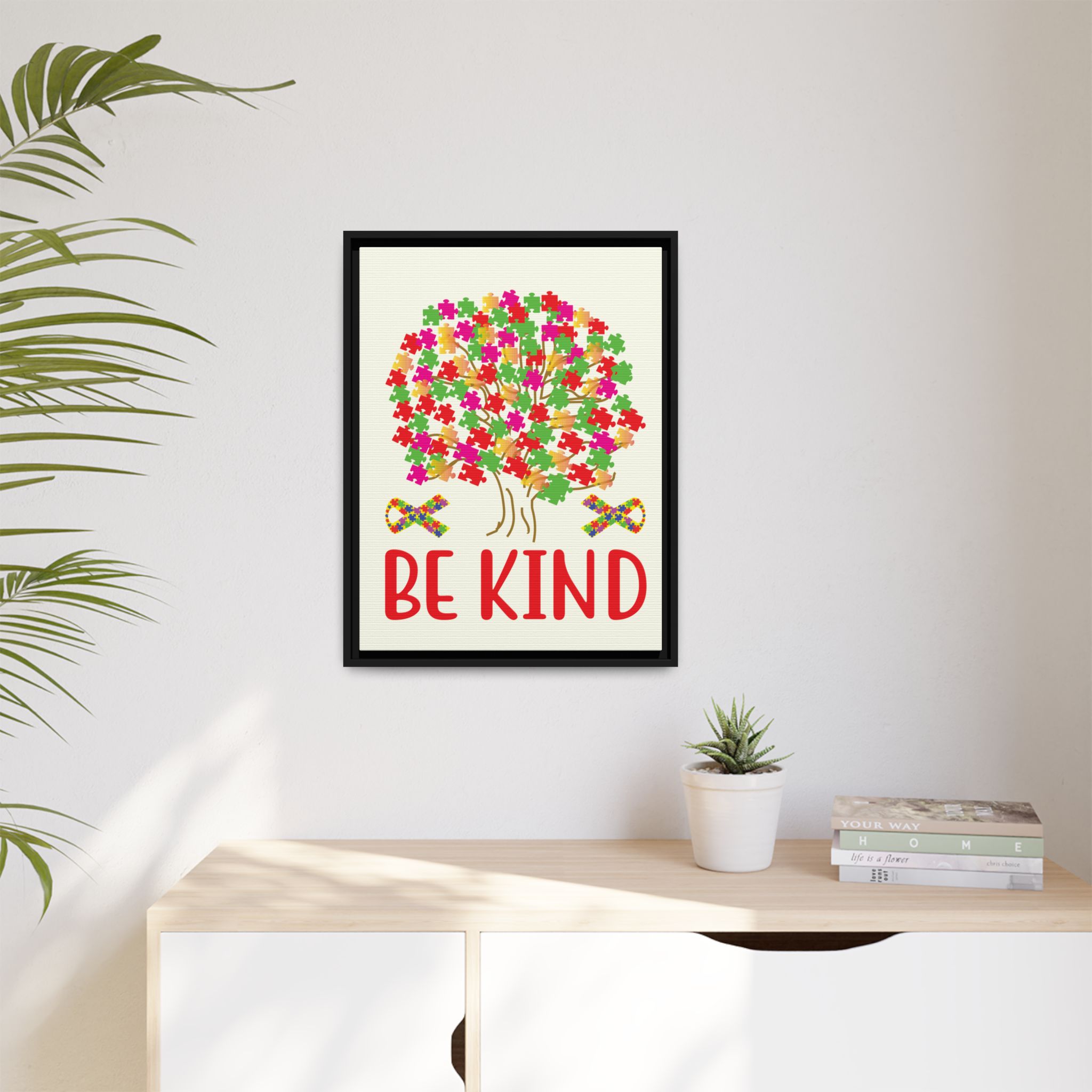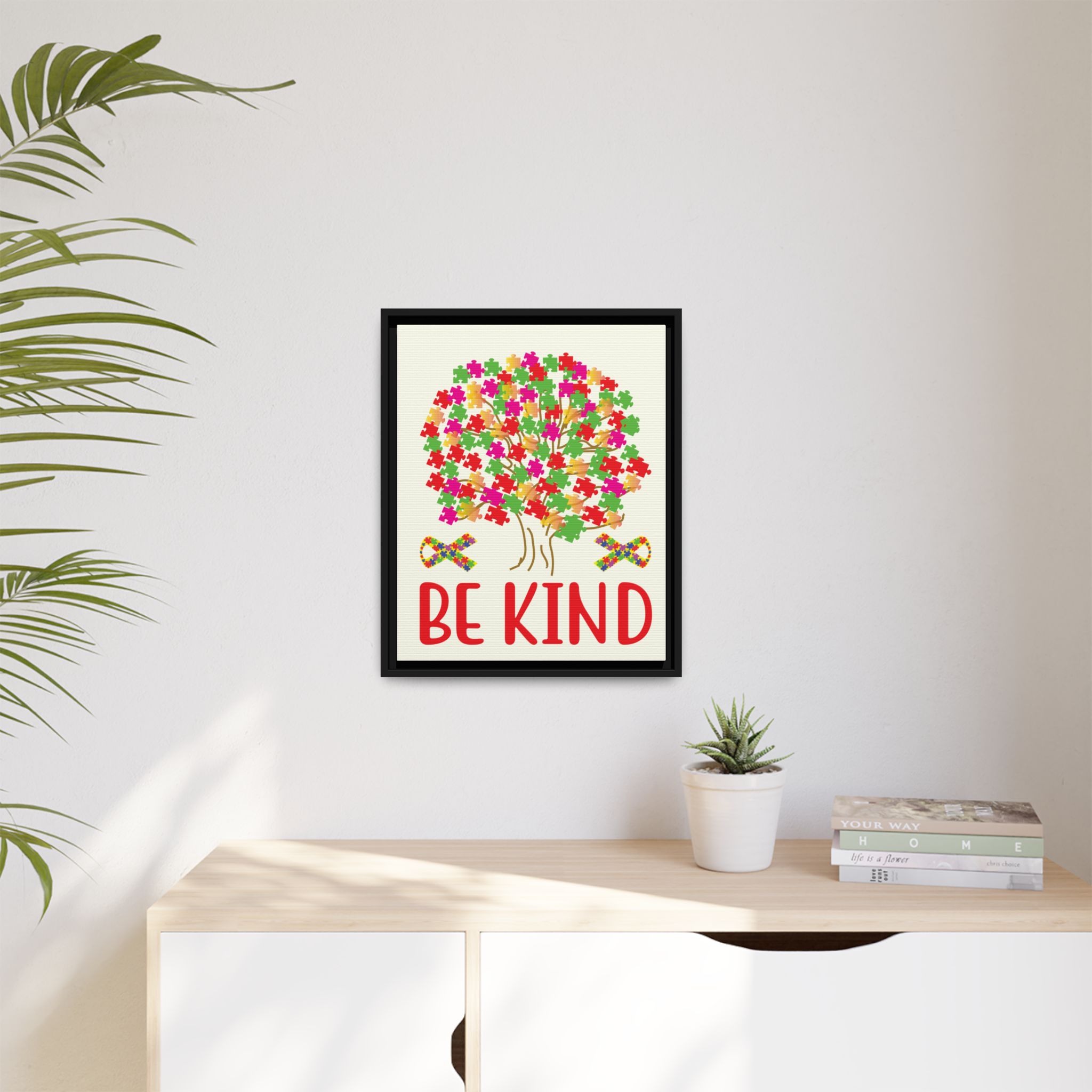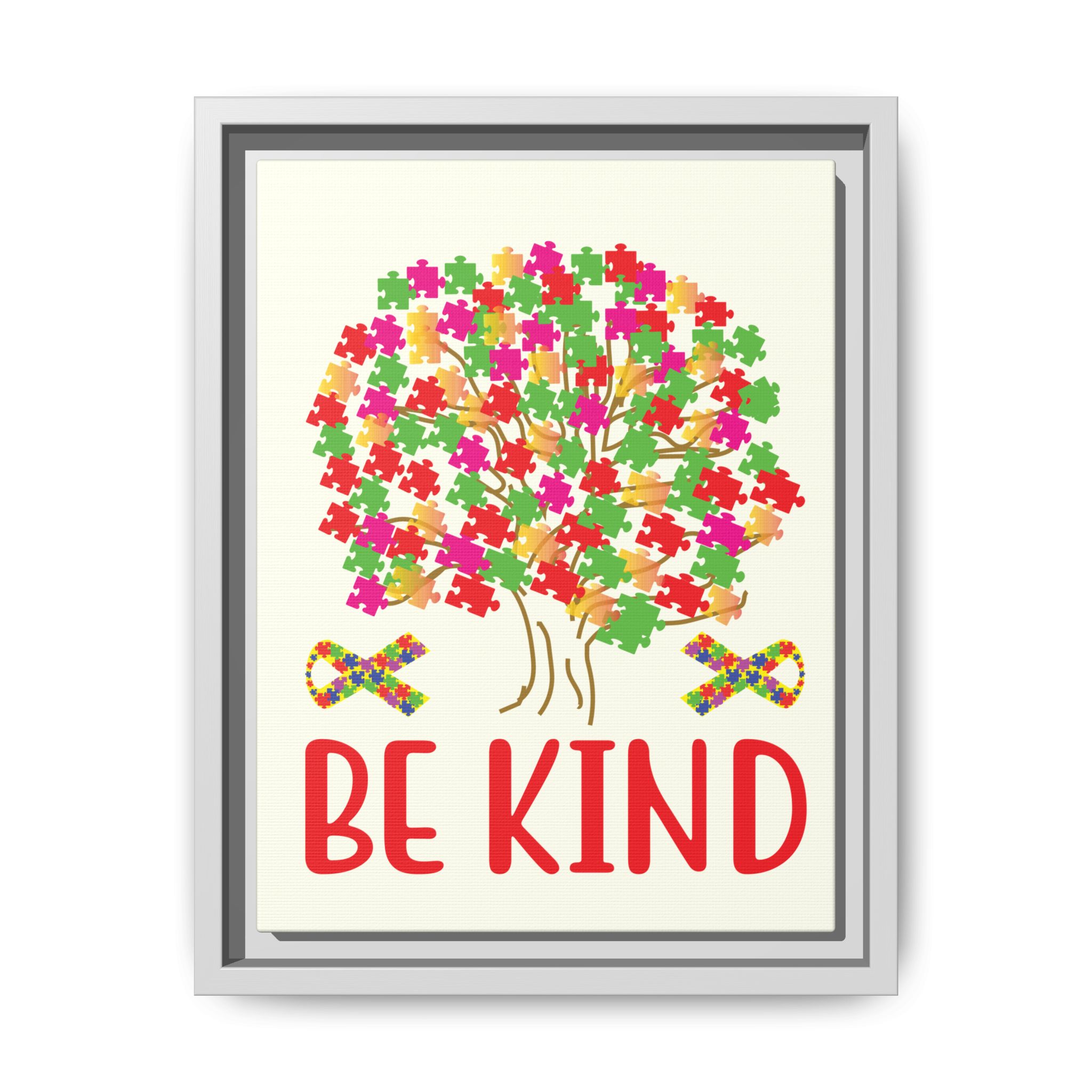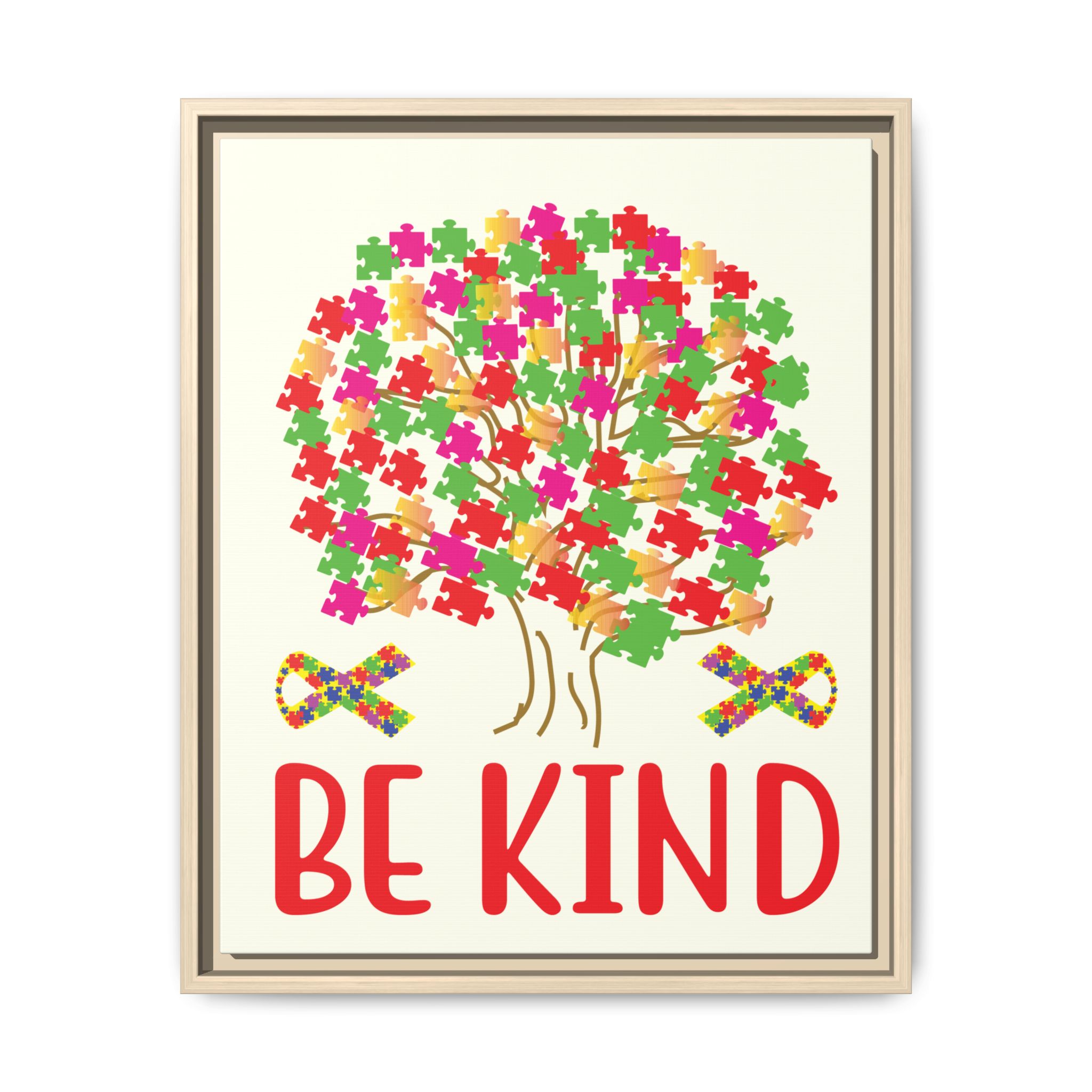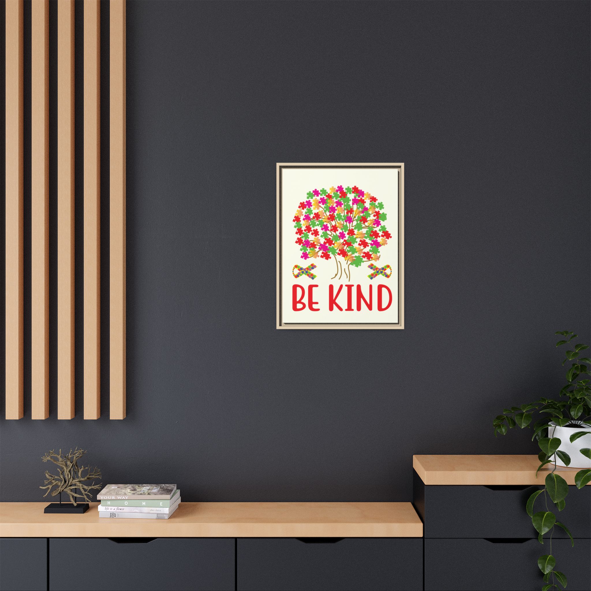 This matte canvas print framed in a slim pine profile brings warmth and intention to a room. The artwork — a colorful tree formed from puzzle-piece leaves with two ribbon motifs and the phrase “BE KIND” — reads clearly from a distance while offering bright, cheerful detail up close. The fine matte surface reduces glare and deepens color saturation, making the reds, greens, pinks and golds pop against a soft cream background. Lightweight but sturdily stretched on sustainably sourced pine, it arrives ready to hang with sawtooth hardware and a contemporary black or natural frame option that suits living rooms, classrooms, entryways, or quiet corners where a little reminder matters.
