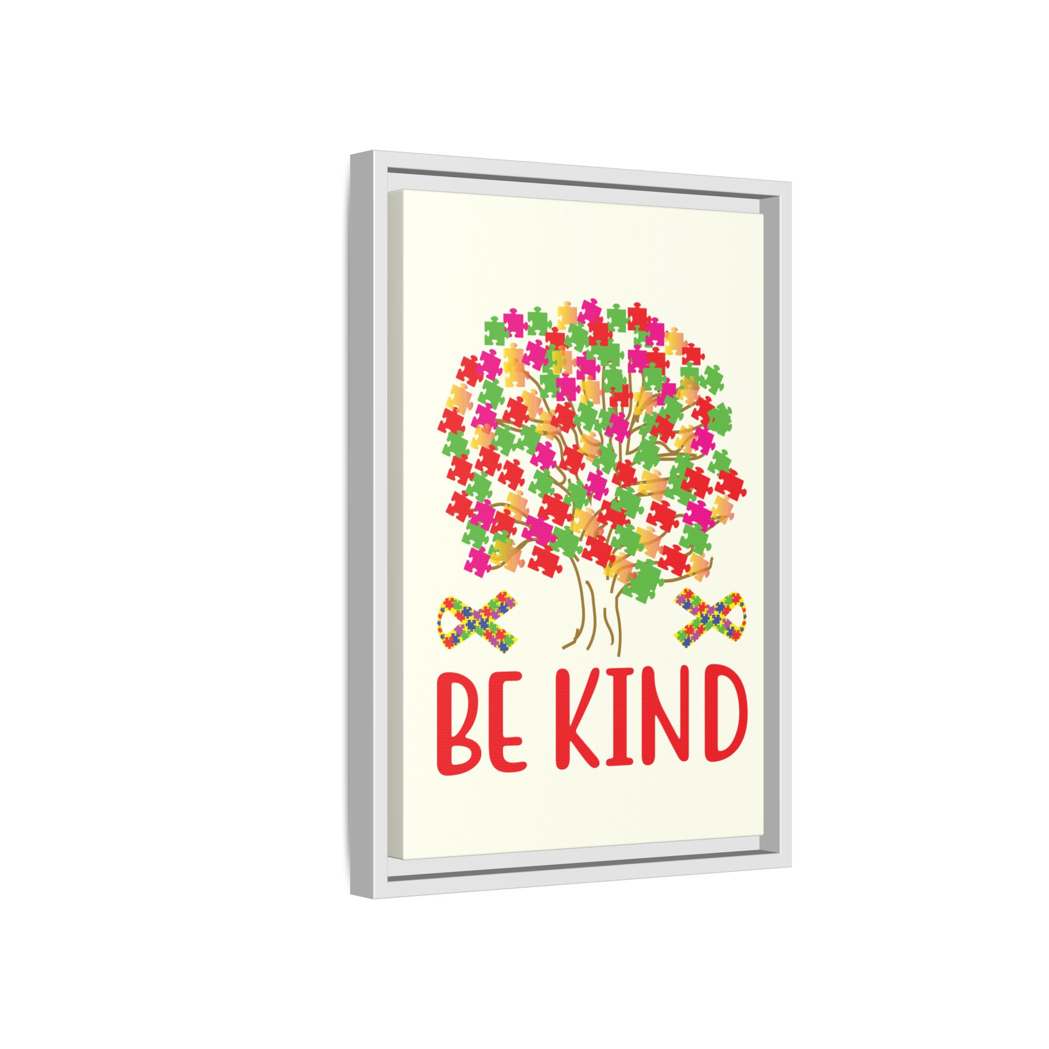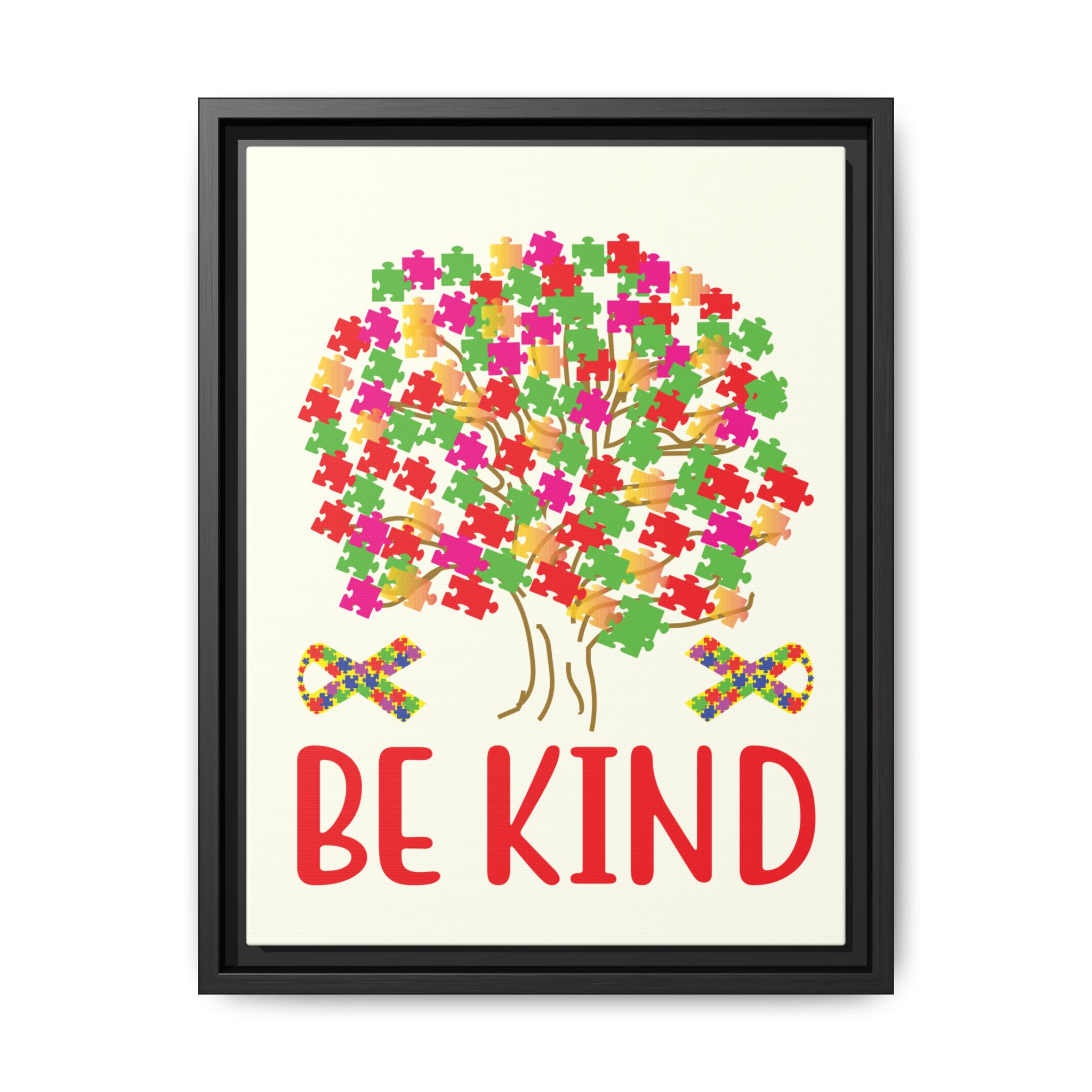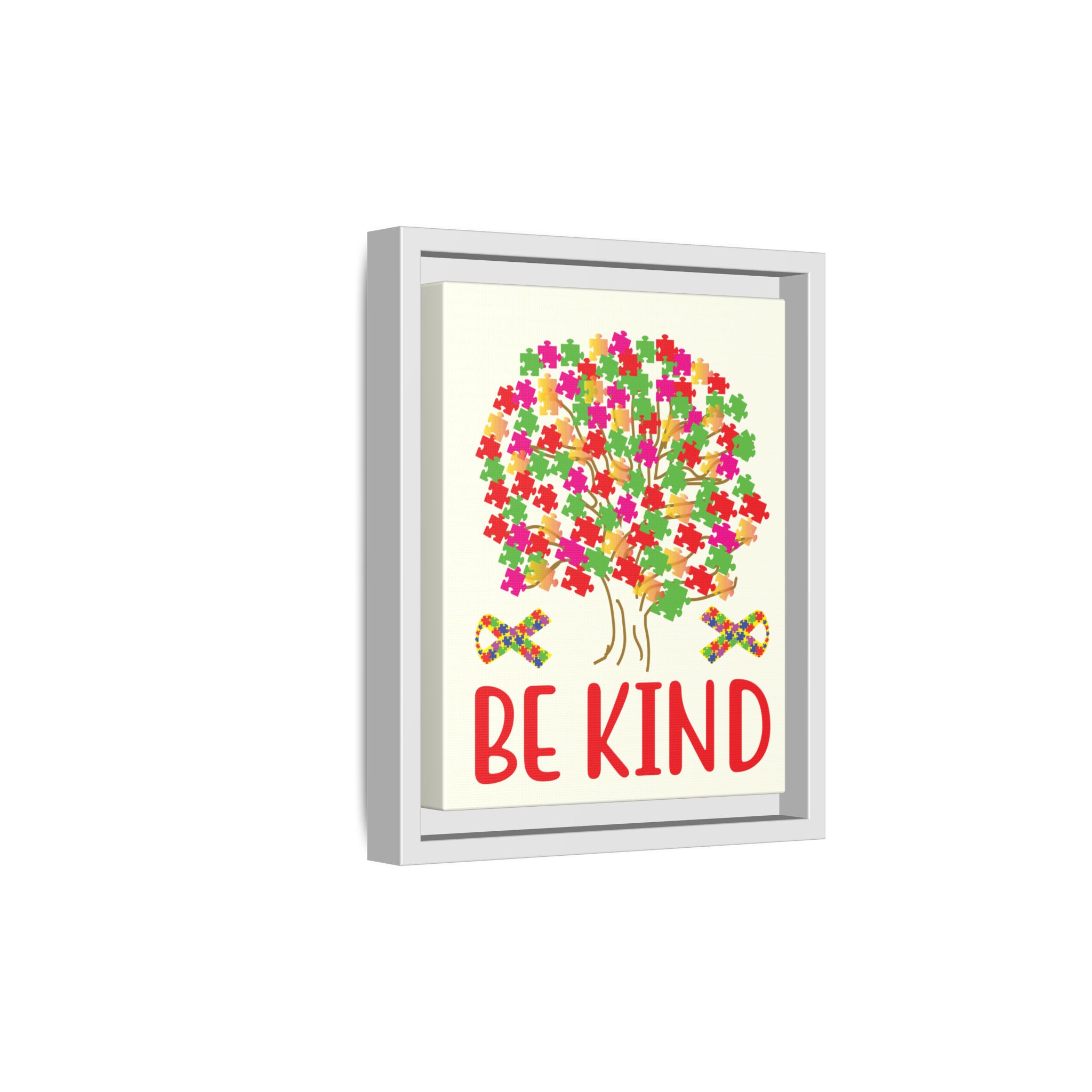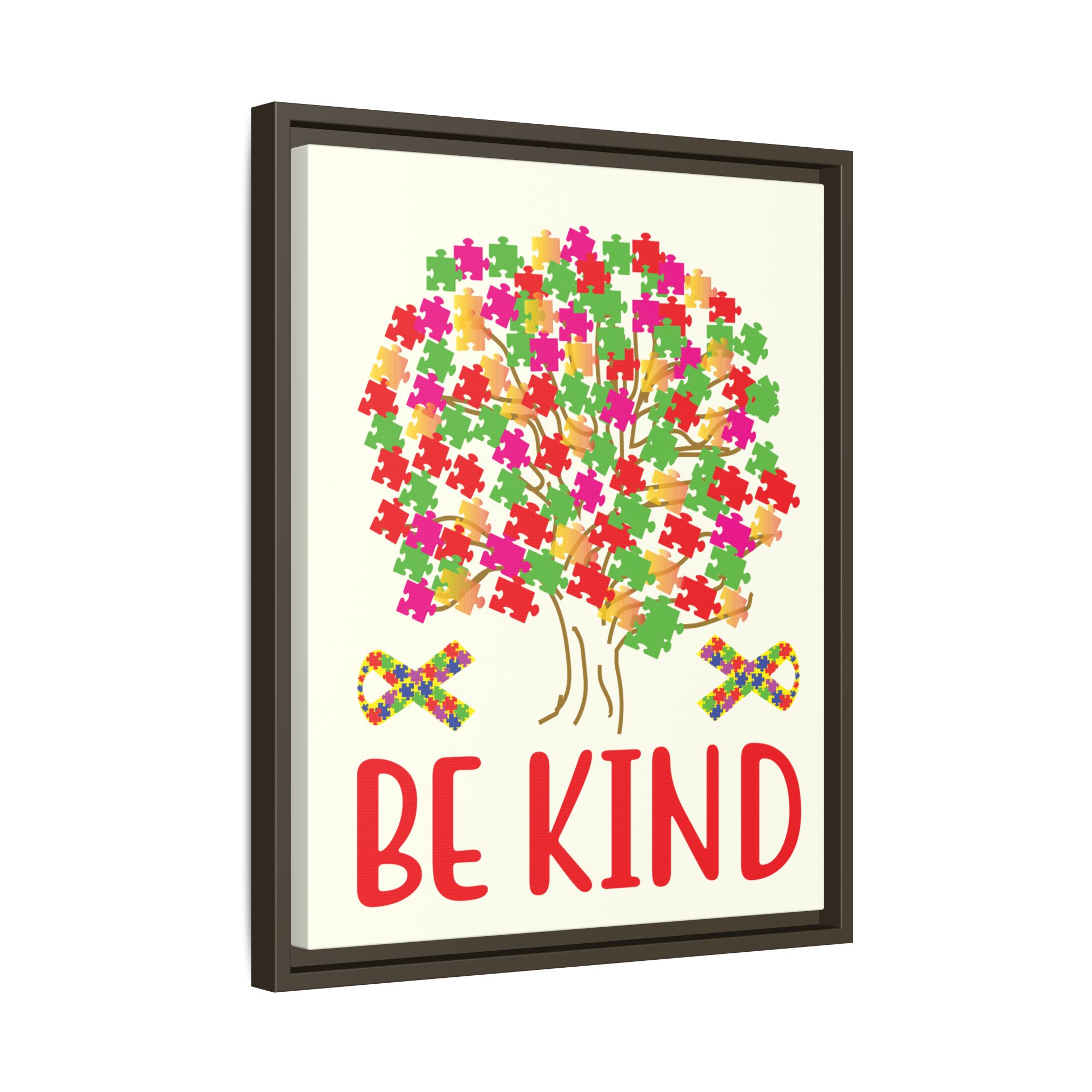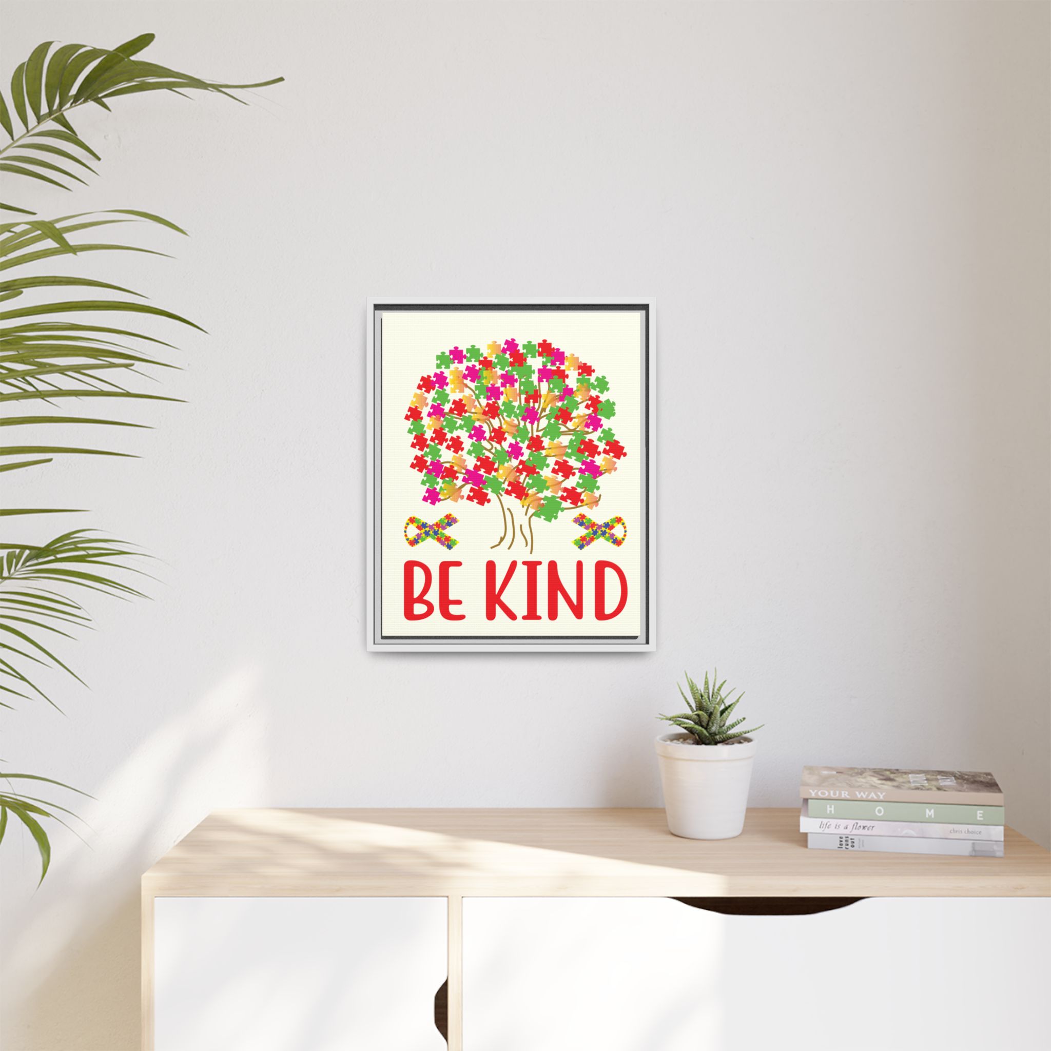 This matte canvas print framed in a slim pine profile brings warmth and intention to a room. The artwork — a colorful tree formed from puzzle-piece leaves with two ribbon motifs and the phrase “BE KIND” — reads clearly from a distance while offering bright, cheerful detail up close. The fine matte surface reduces glare and deepens color saturation, making the reds, greens, pinks and golds pop against a soft cream background. Lightweight but sturdily stretched on sustainably sourced pine, it arrives ready to hang with sawtooth hardware and a contemporary black or natural frame option that suits living rooms, classrooms, entryways, or quiet corners where a little reminder matters.