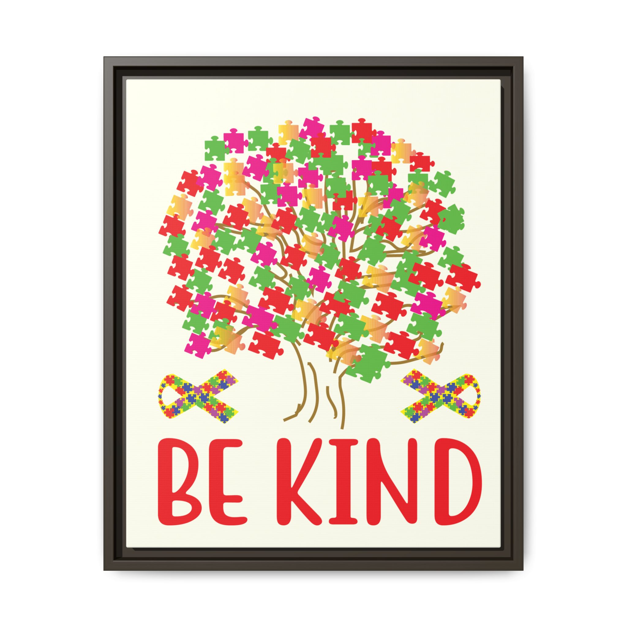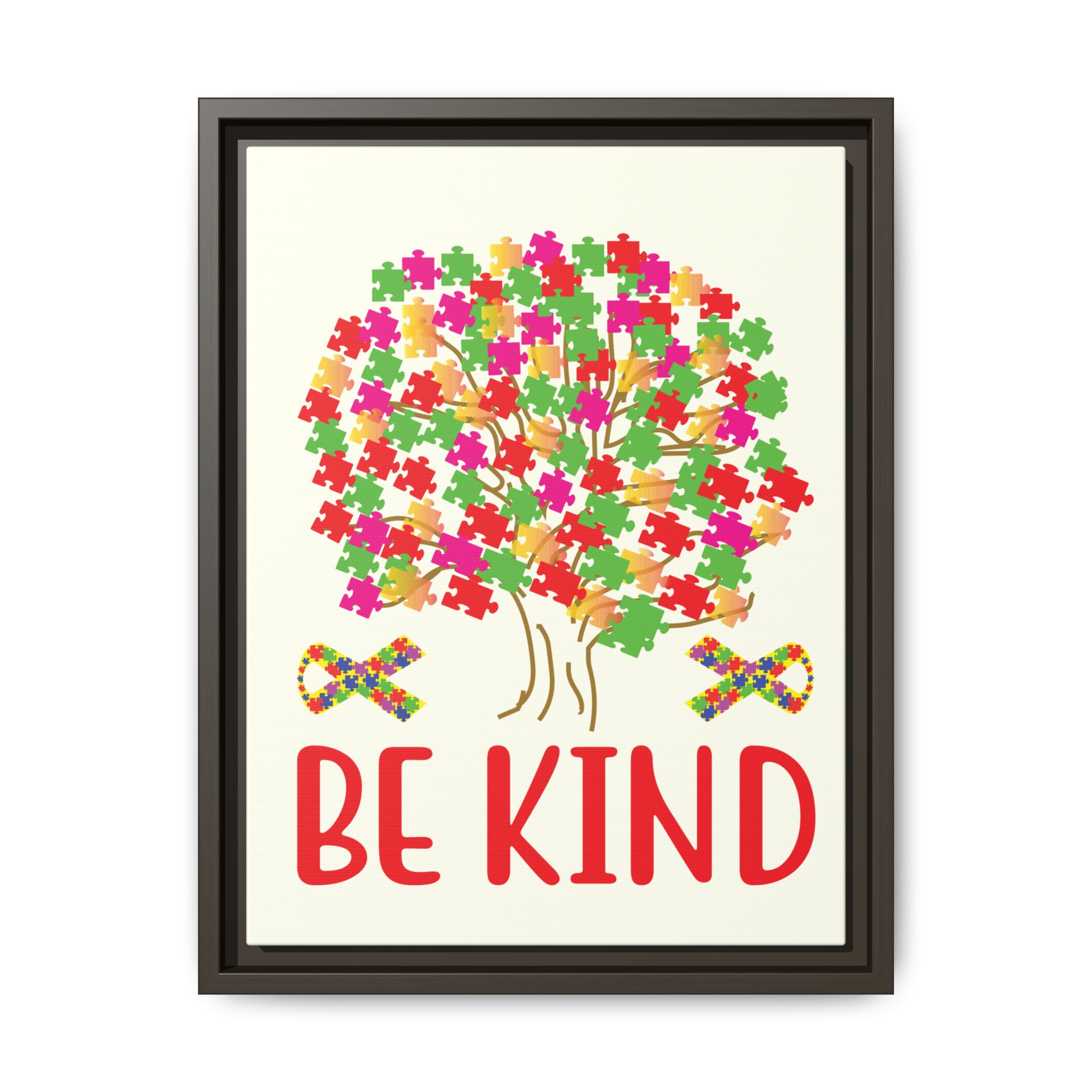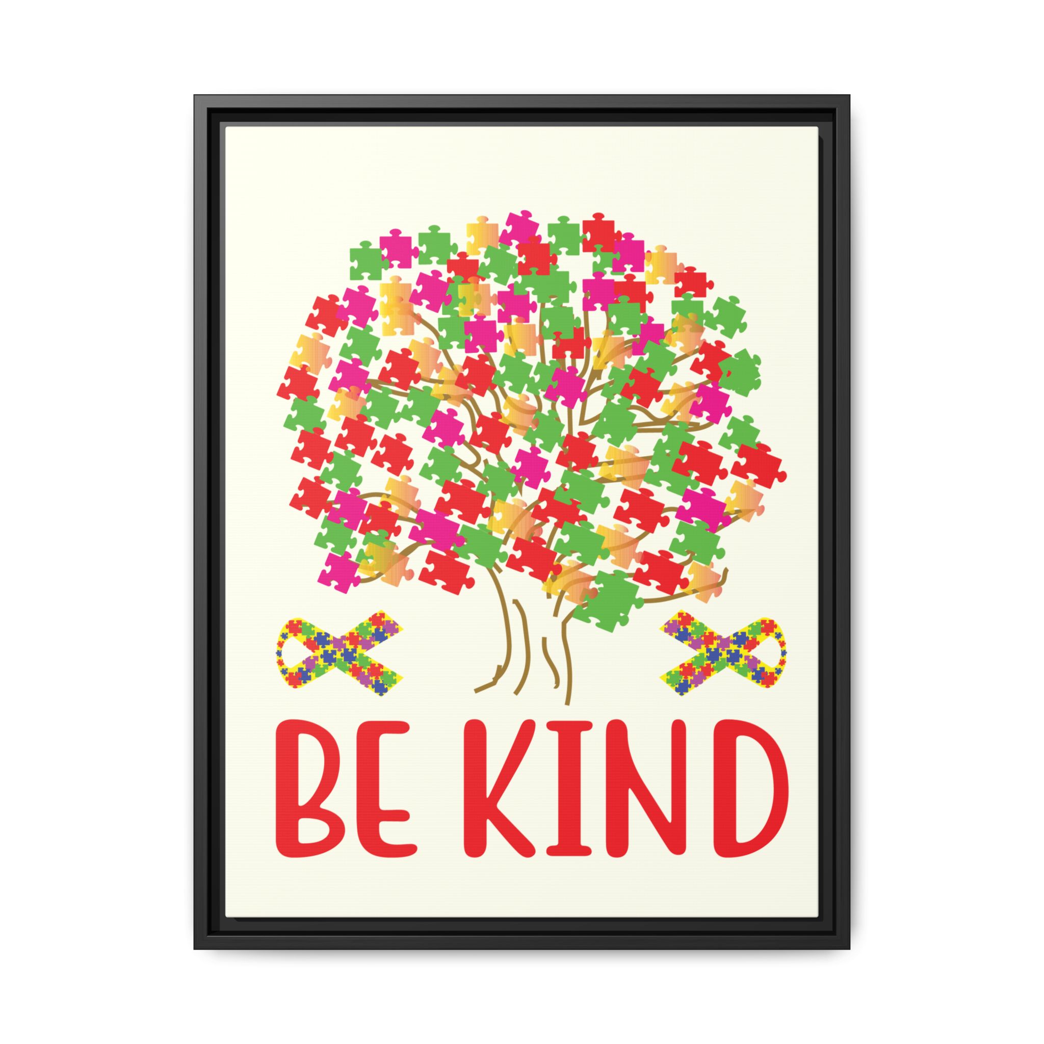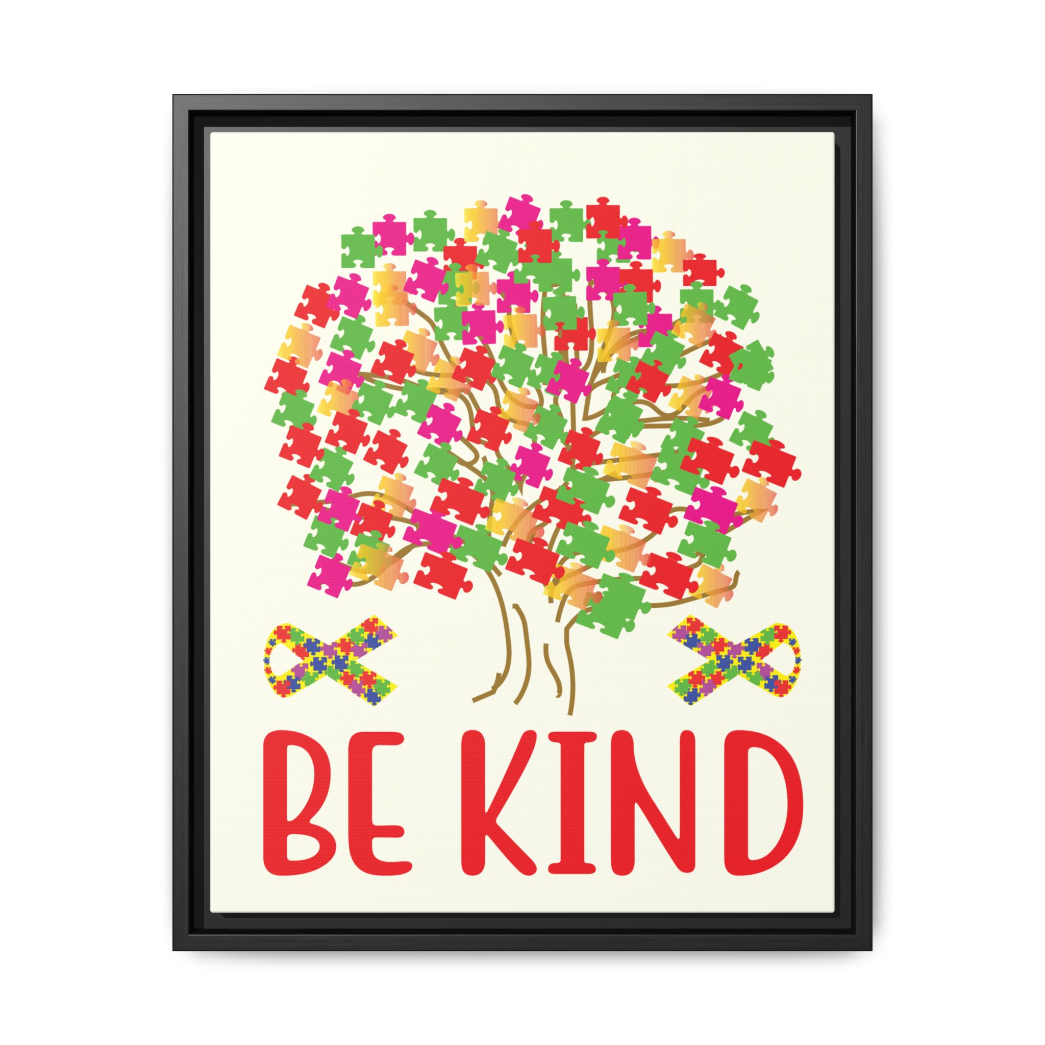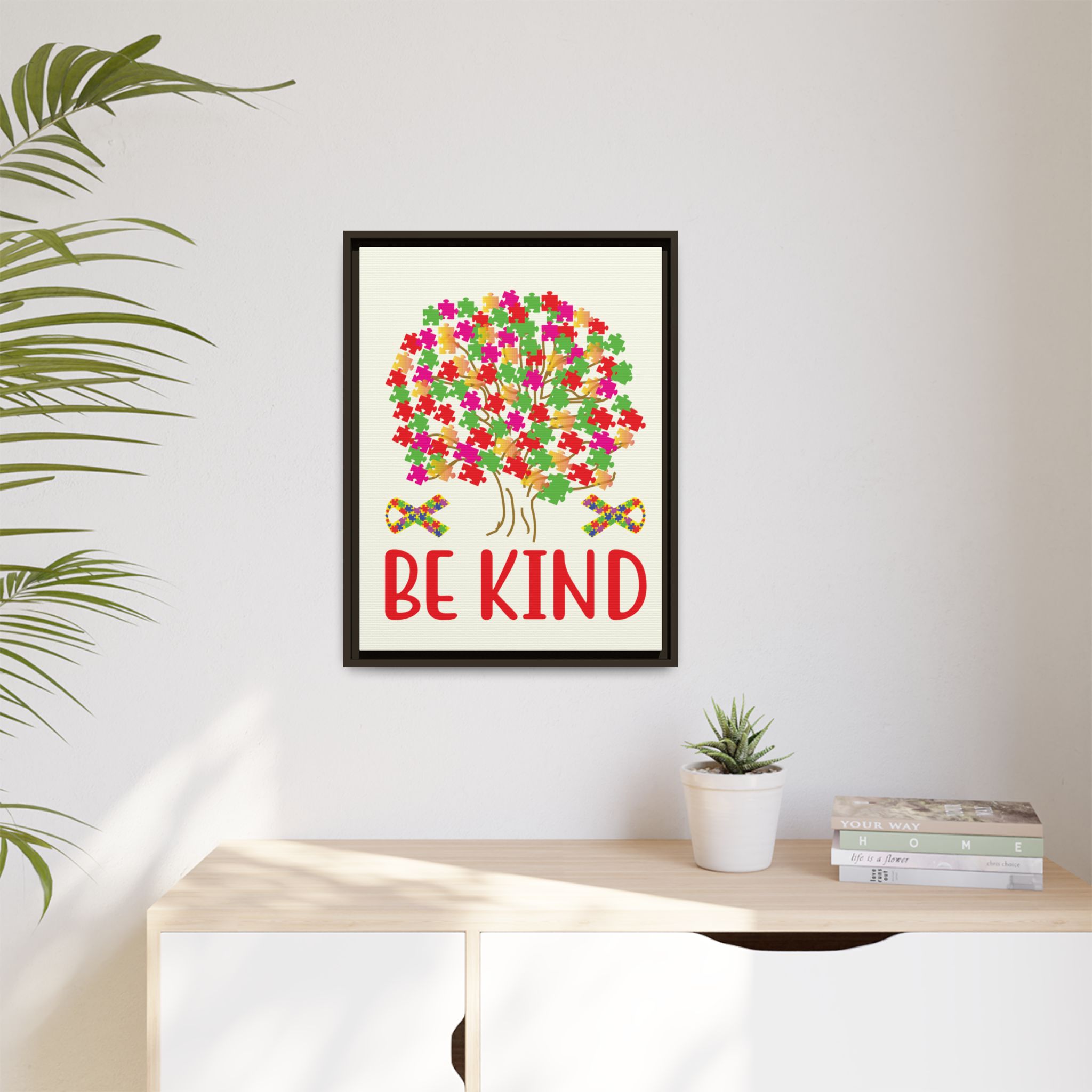 This matte canvas print framed in a slim pine profile brings warmth and intention to a room. The artwork — a colorful tree formed from puzzle-piece leaves with two ribbon motifs and the phrase “BE KIND” — reads clearly from a distance while offering bright, cheerful detail up close. The fine matte surface reduces glare and deepens color saturation, making the reds, greens, pinks and golds pop against a soft cream background. Lightweight but sturdily stretched on sustainably sourced pine, it arrives ready to hang with sawtooth hardware and a contemporary black or natural frame option that suits living rooms, classrooms, entryways, or quiet corners where a little reminder matters.