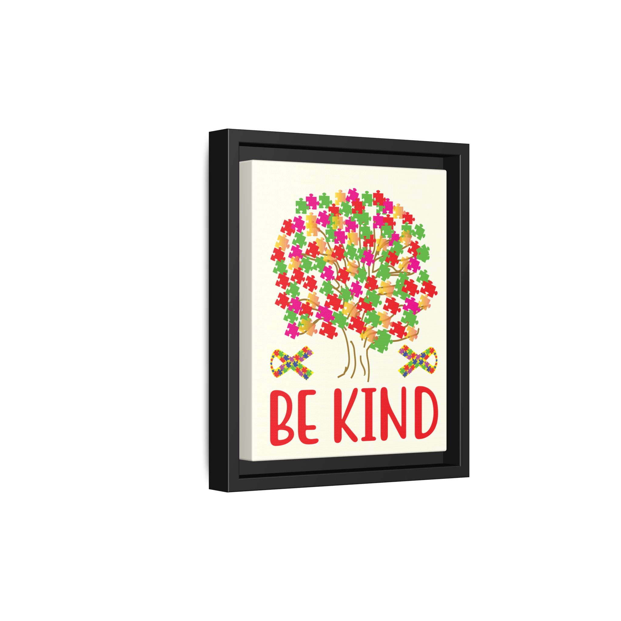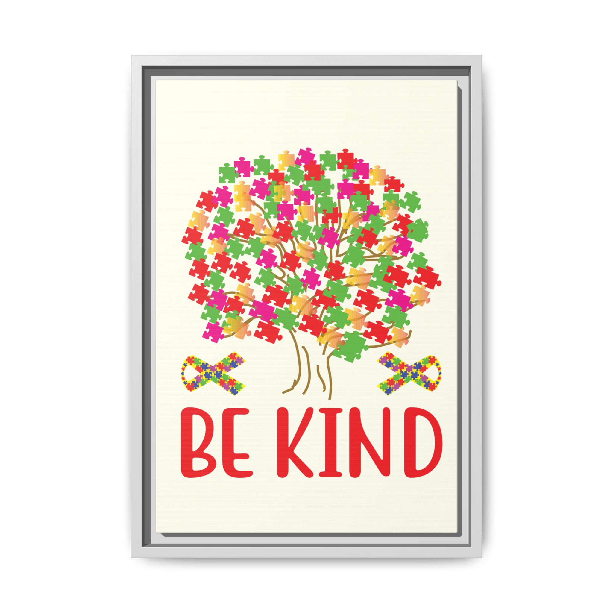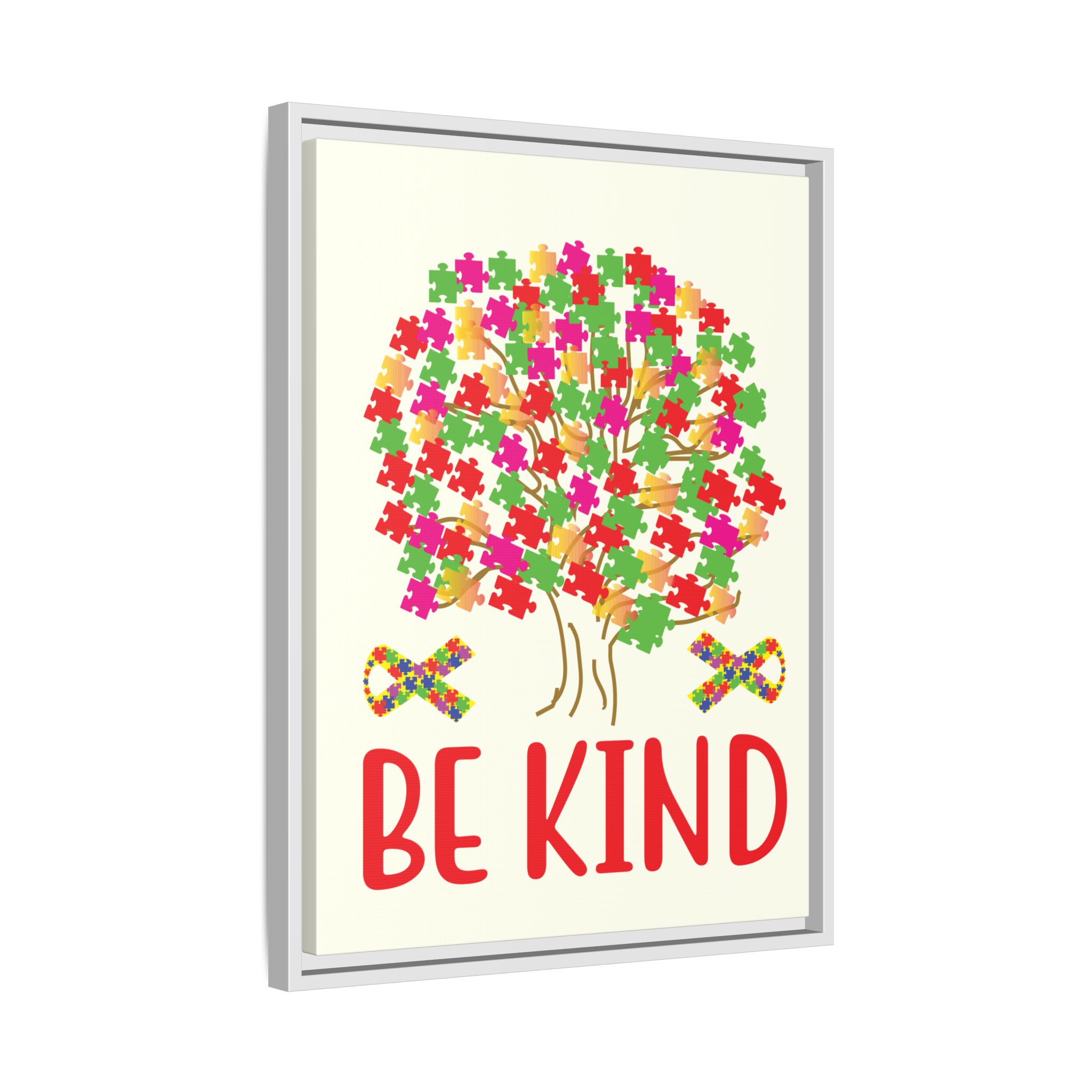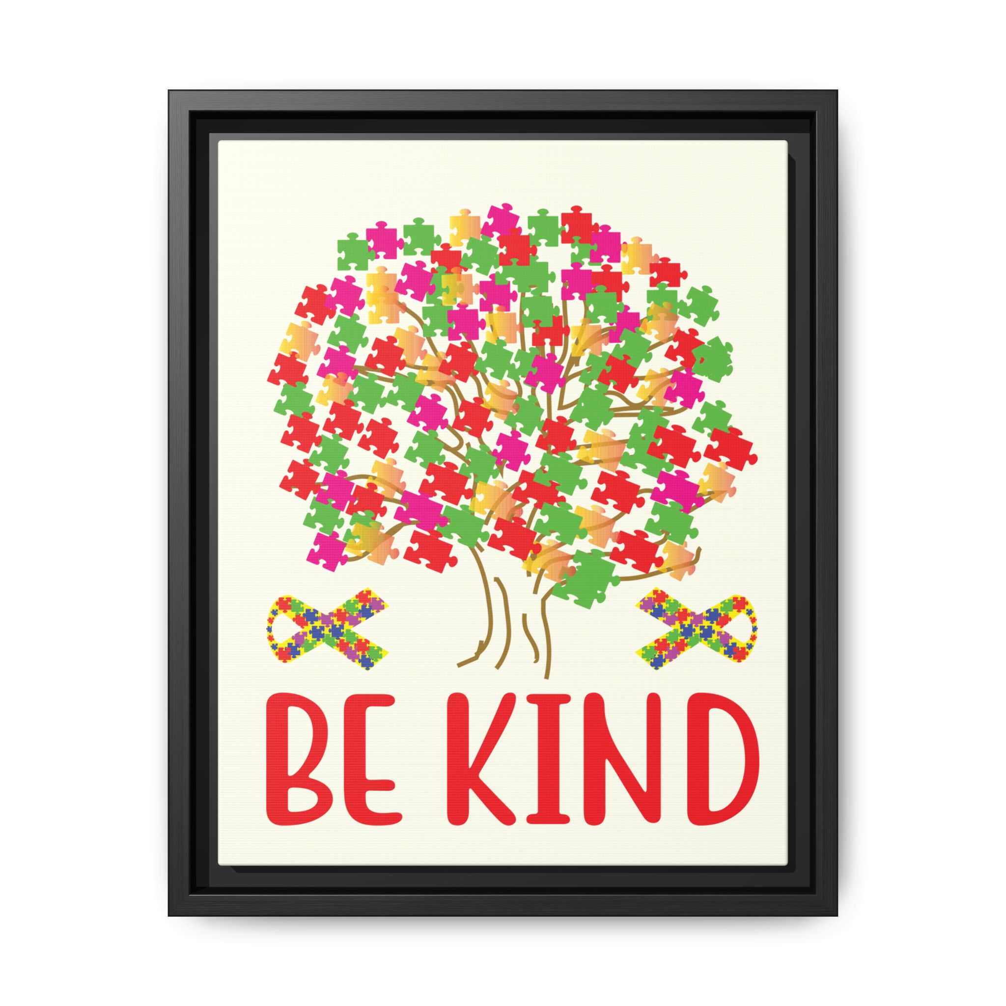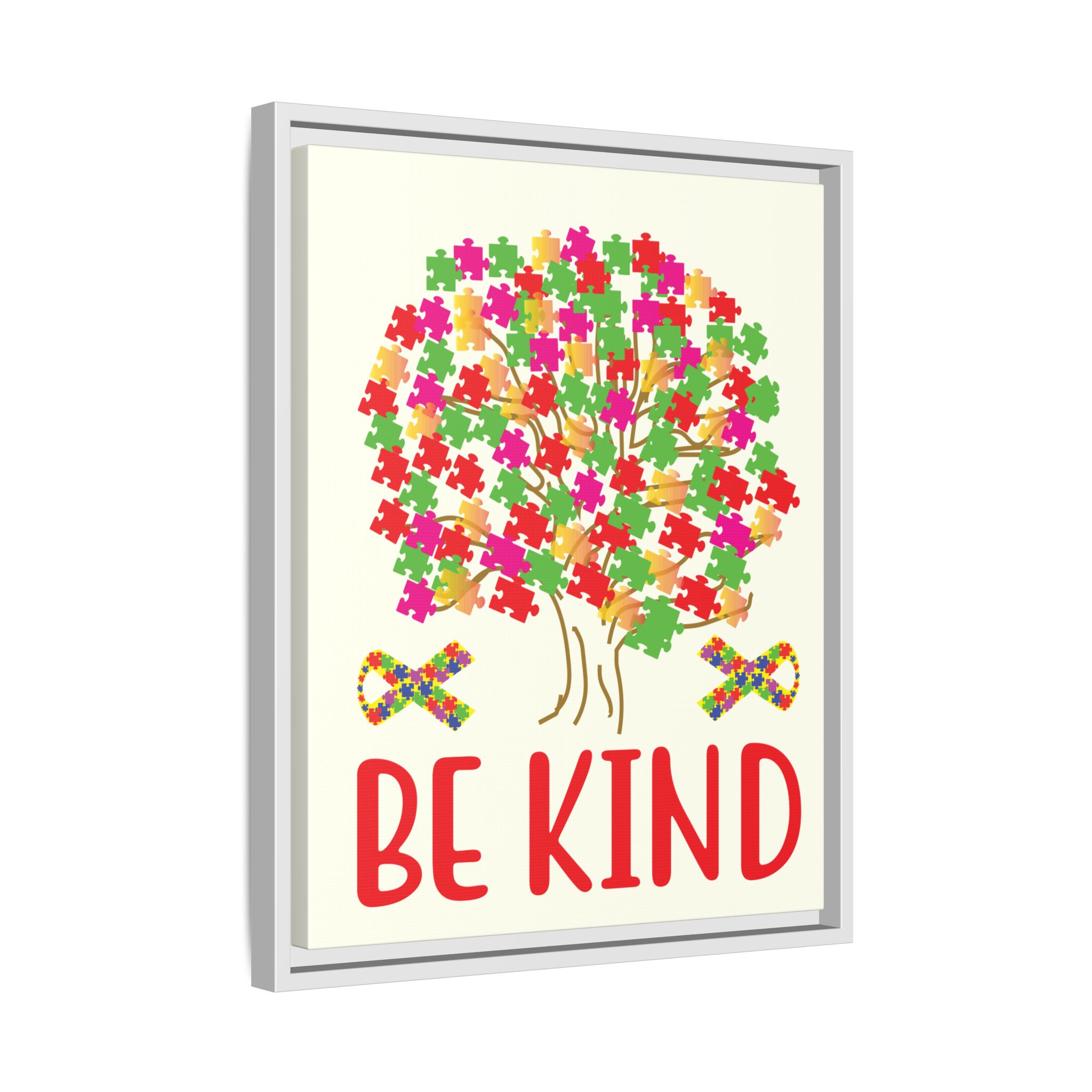 This matte canvas print framed in a slim pine profile brings warmth and intention to a room. The artwork — a colorful tree formed from puzzle-piece leaves with two ribbon motifs and the phrase “BE KIND” — reads clearly from a distance while offering bright, cheerful detail up close. The fine matte surface reduces glare and deepens color saturation, making the reds, greens, pinks and golds pop against a soft cream background. Lightweight but sturdily stretched on sustainably sourced pine, it arrives ready to hang with sawtooth hardware and a contemporary black or natural frame option that suits living rooms, classrooms, entryways, or quiet corners where a little reminder matters.