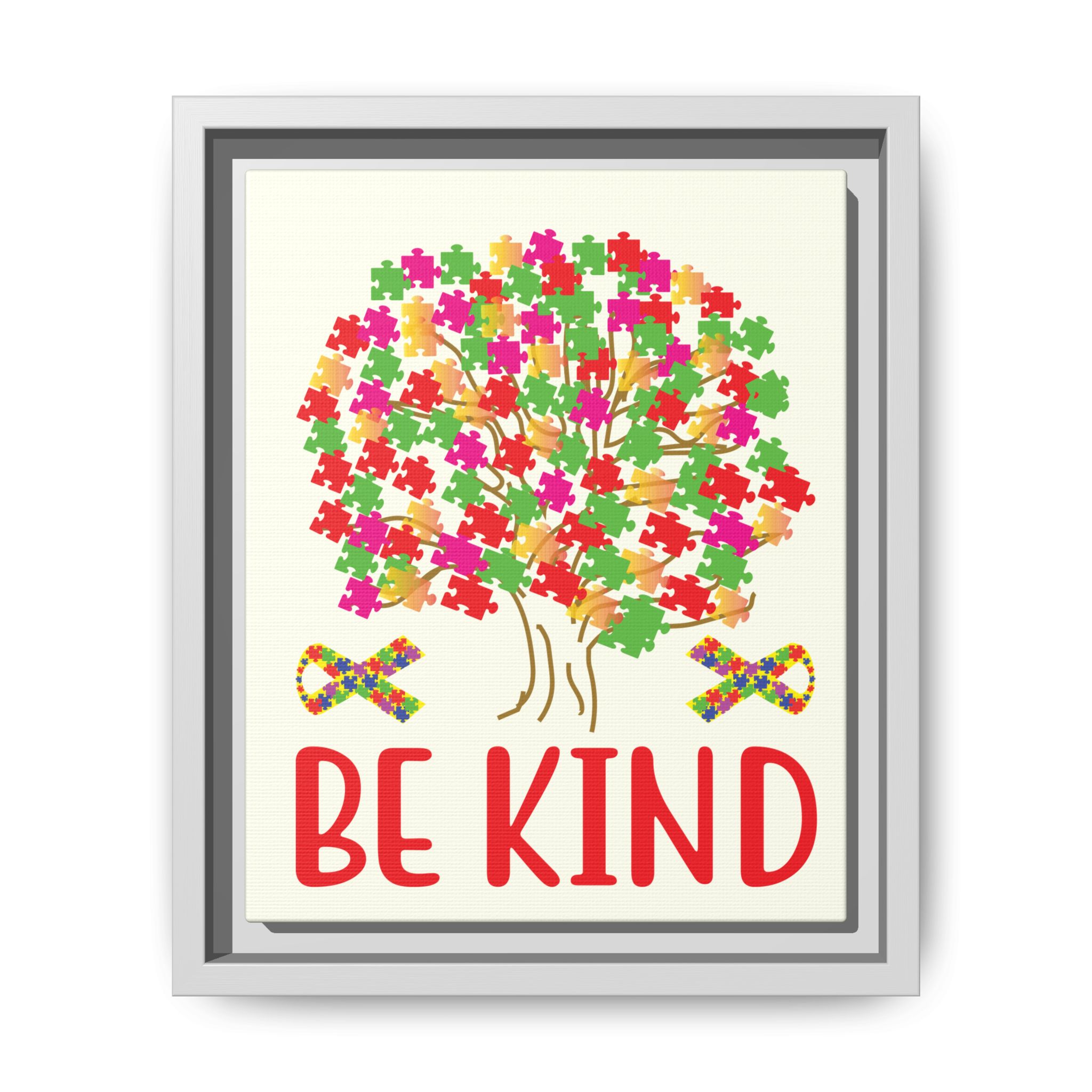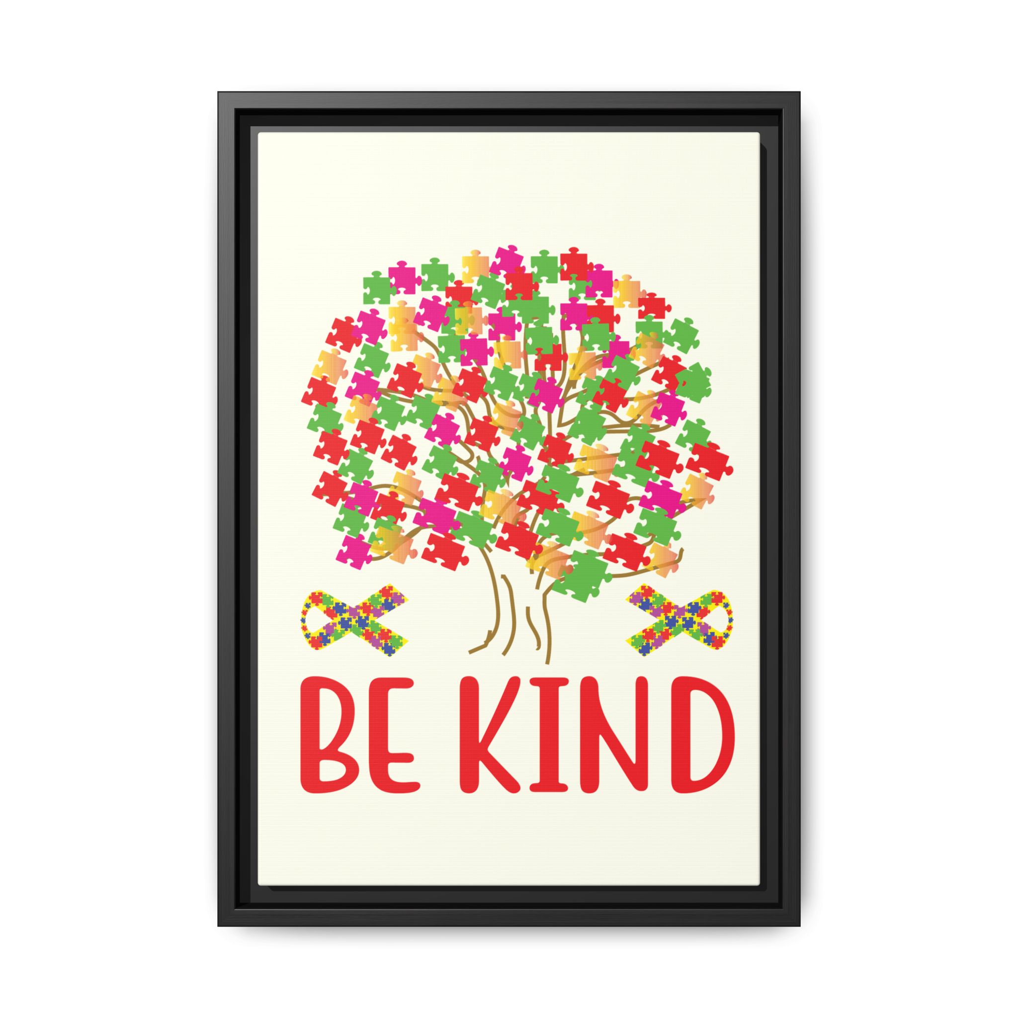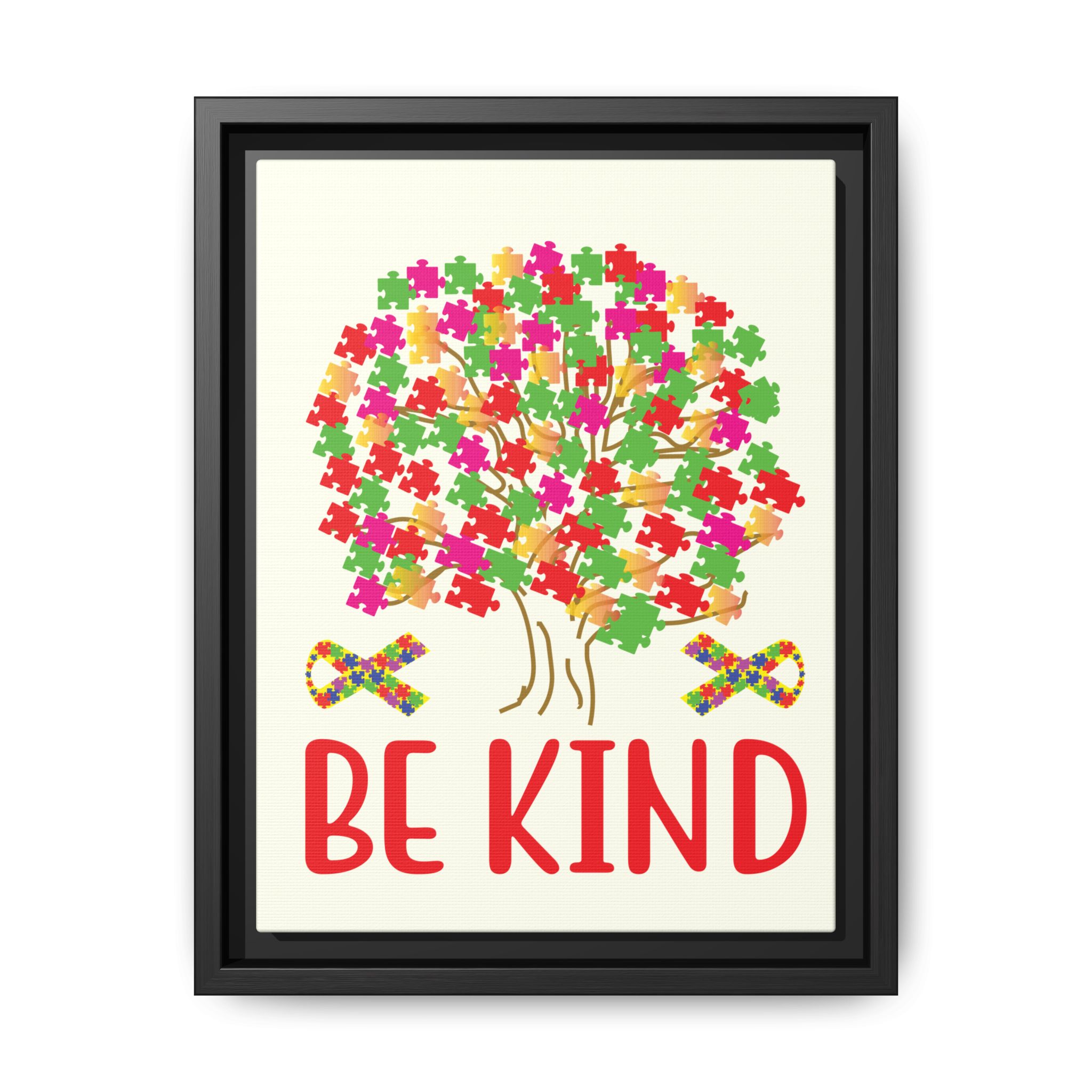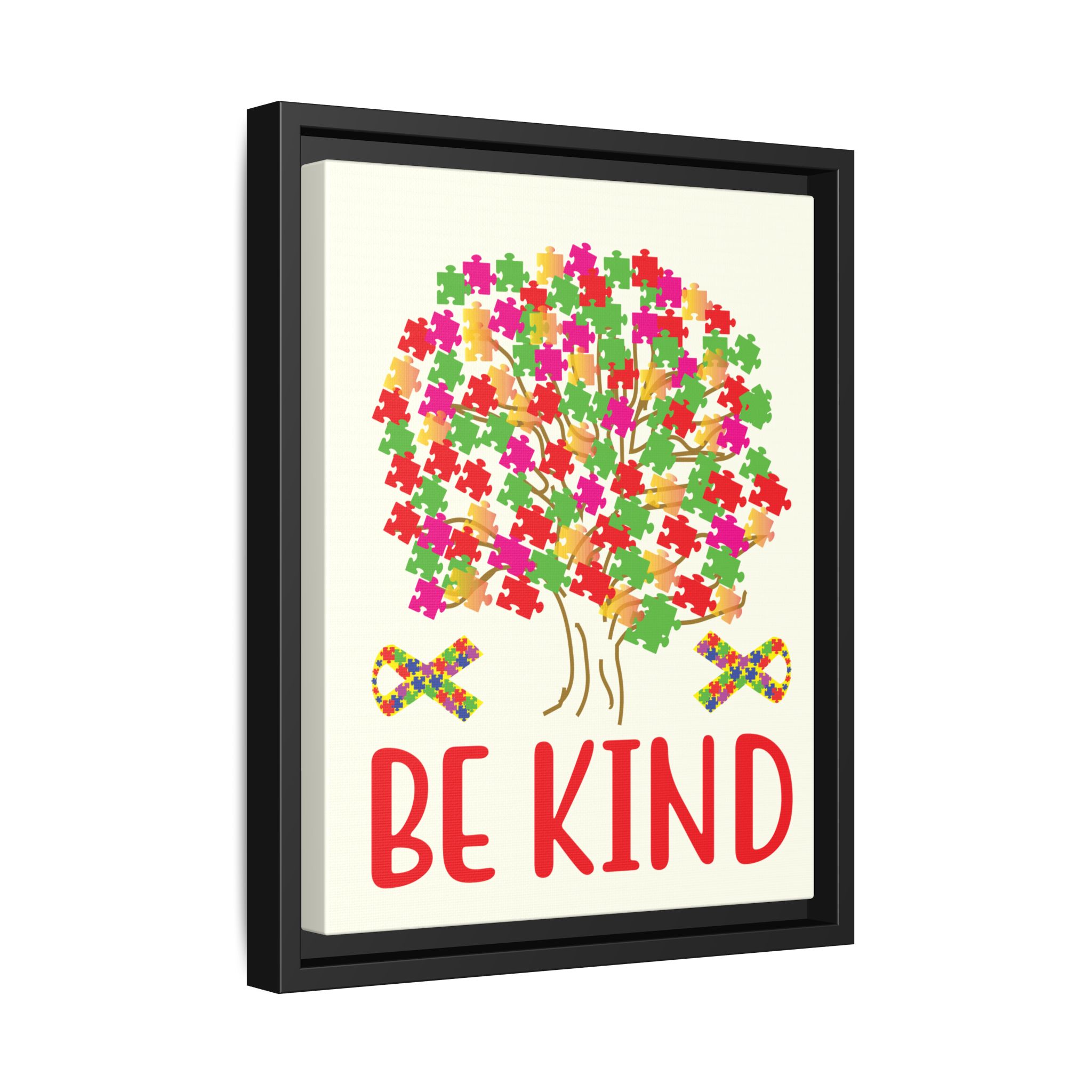 This matte canvas print framed in a slim pine profile brings warmth and intention to a room. The artwork — a colorful tree formed from puzzle-piece leaves with two ribbon motifs and the phrase “BE KIND” — reads clearly from a distance while offering bright, cheerful detail up close. The fine matte surface reduces glare and deepens color saturation, making the reds, greens, pinks and golds pop against a soft cream background. Lightweight but sturdily stretched on sustainably sourced pine, it arrives ready to hang with sawtooth hardware and a contemporary black or natural frame option that suits living rooms, classrooms, entryways, or quiet corners where a little reminder matters.