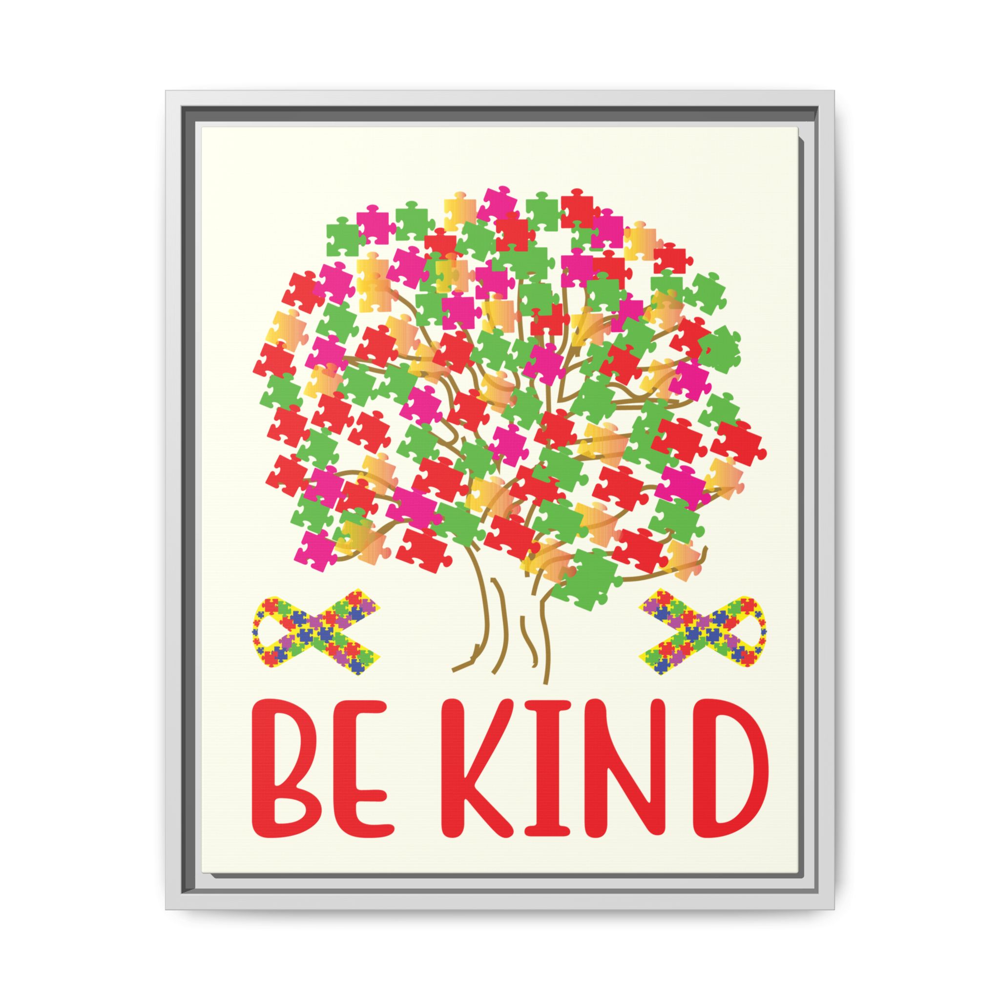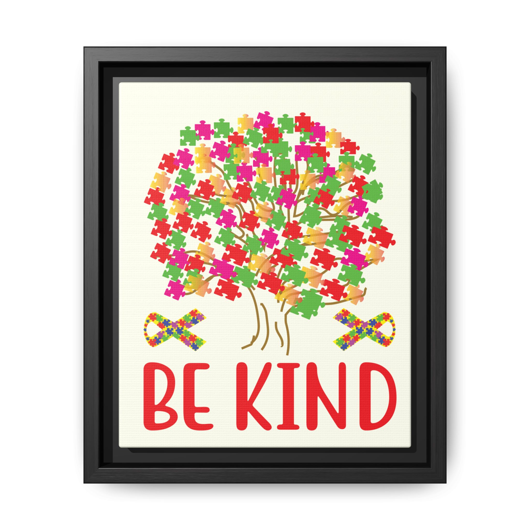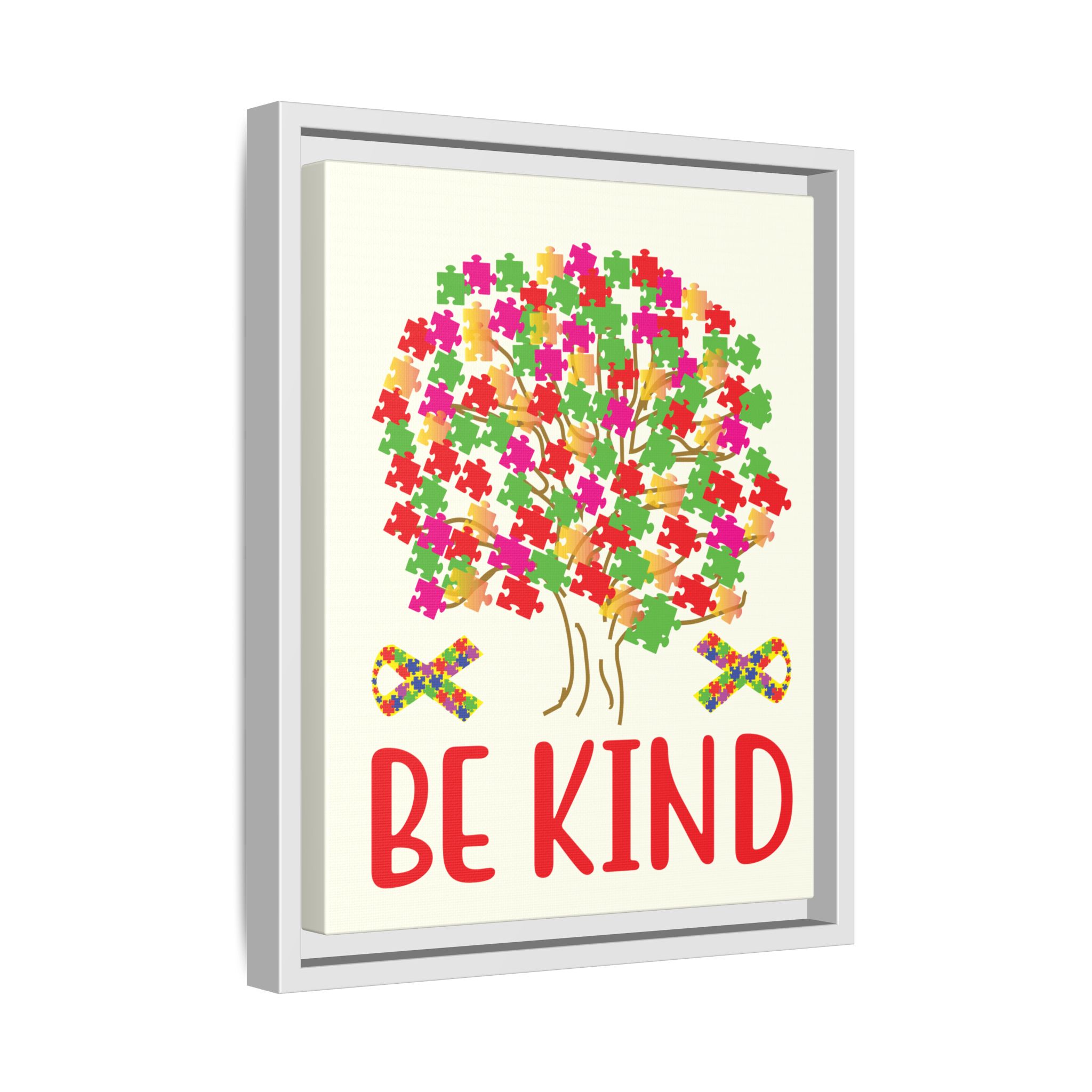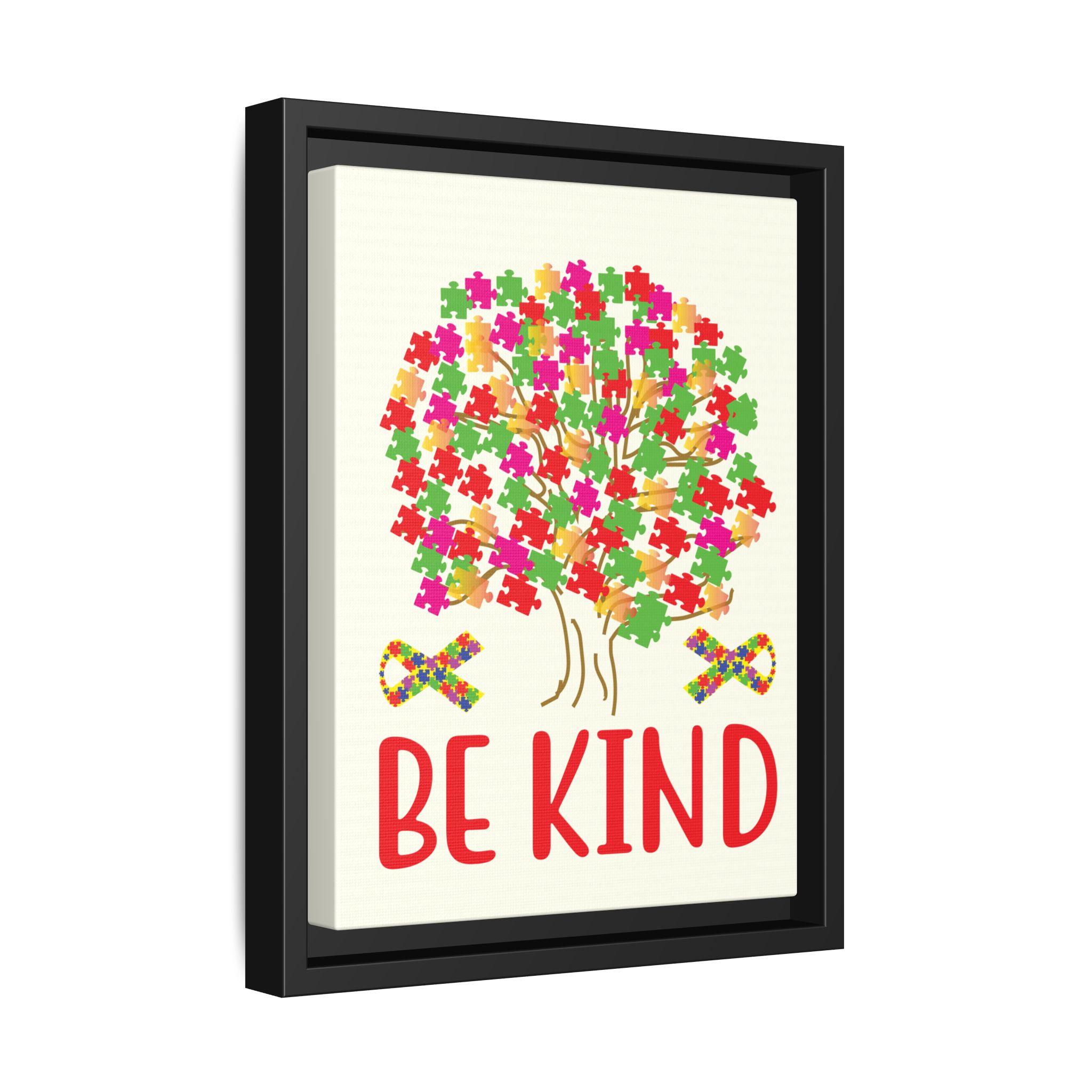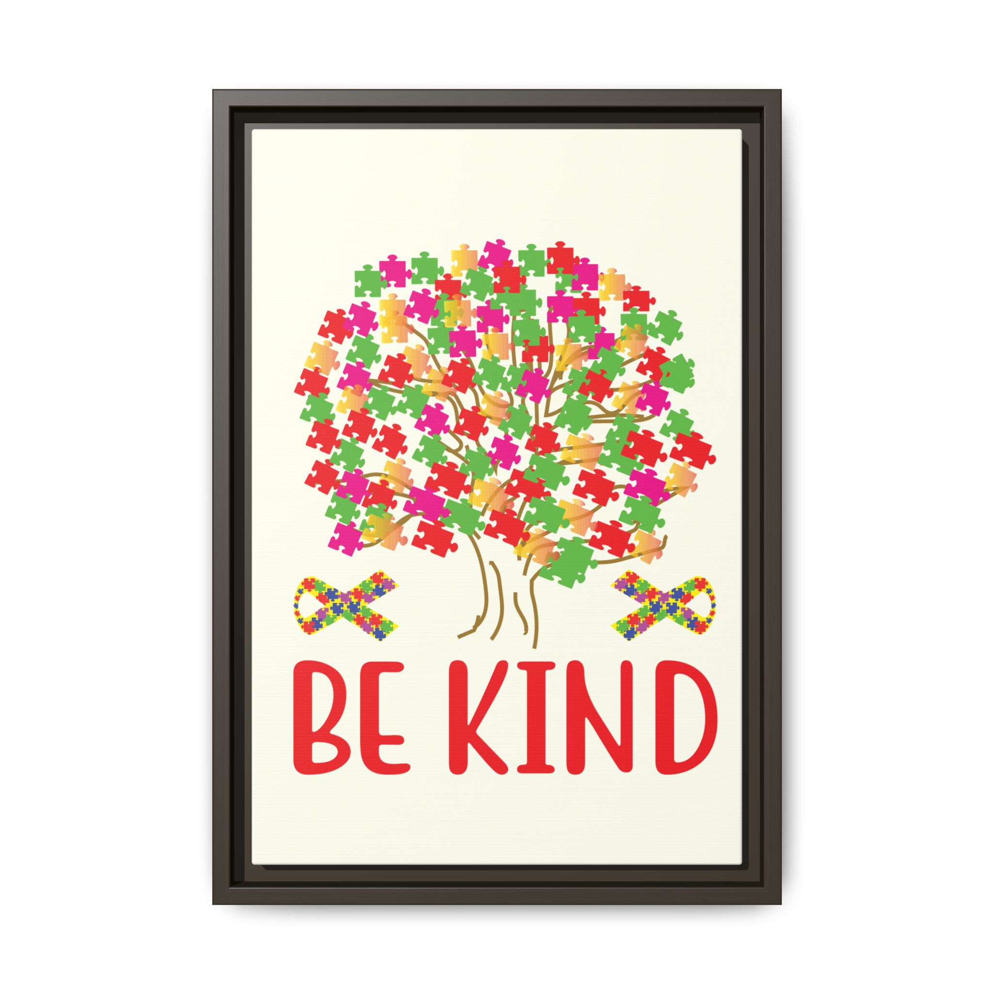 This matte canvas print framed in a slim pine profile brings warmth and intention to a room. The artwork — a colorful tree formed from puzzle-piece leaves with two ribbon motifs and the phrase “BE KIND” — reads clearly from a distance while offering bright, cheerful detail up close. The fine matte surface reduces glare and deepens color saturation, making the reds, greens, pinks and golds pop against a soft cream background. Lightweight but sturdily stretched on sustainably sourced pine, it arrives ready to hang with sawtooth hardware and a contemporary black or natural frame option that suits living rooms, classrooms, entryways, or quiet corners where a little reminder matters.
