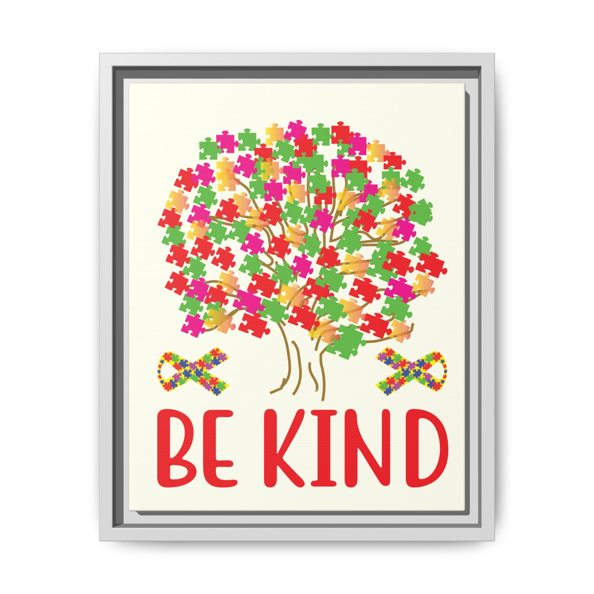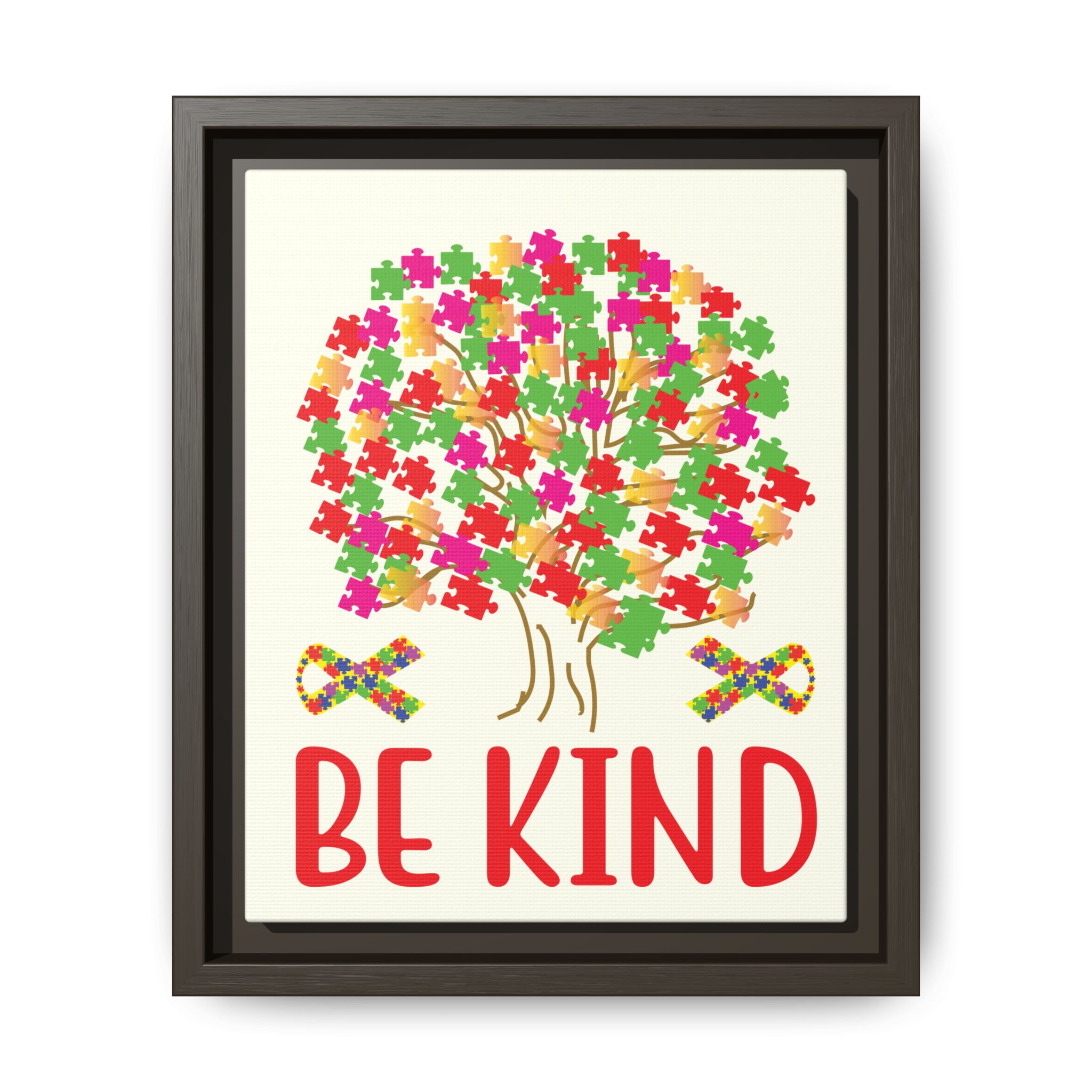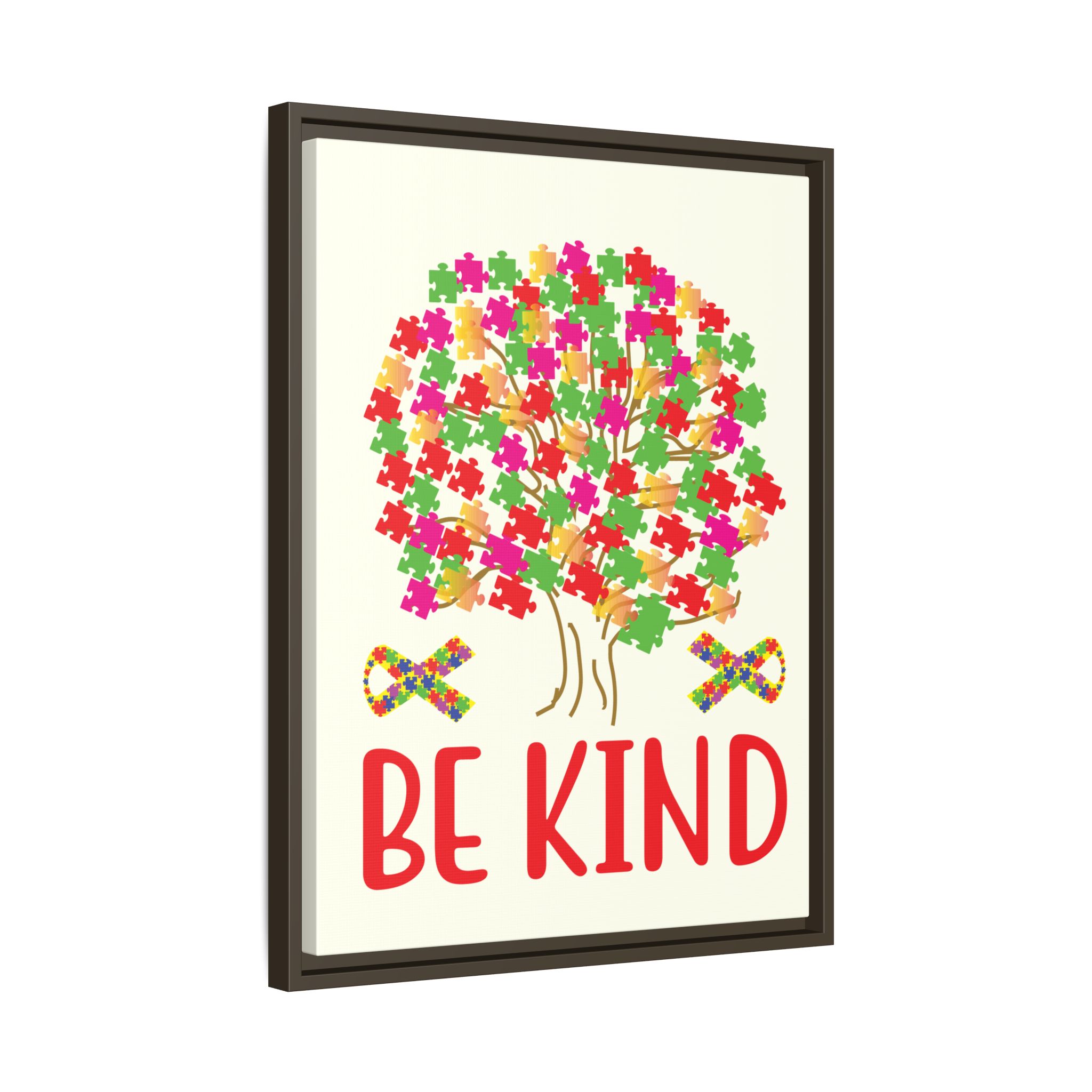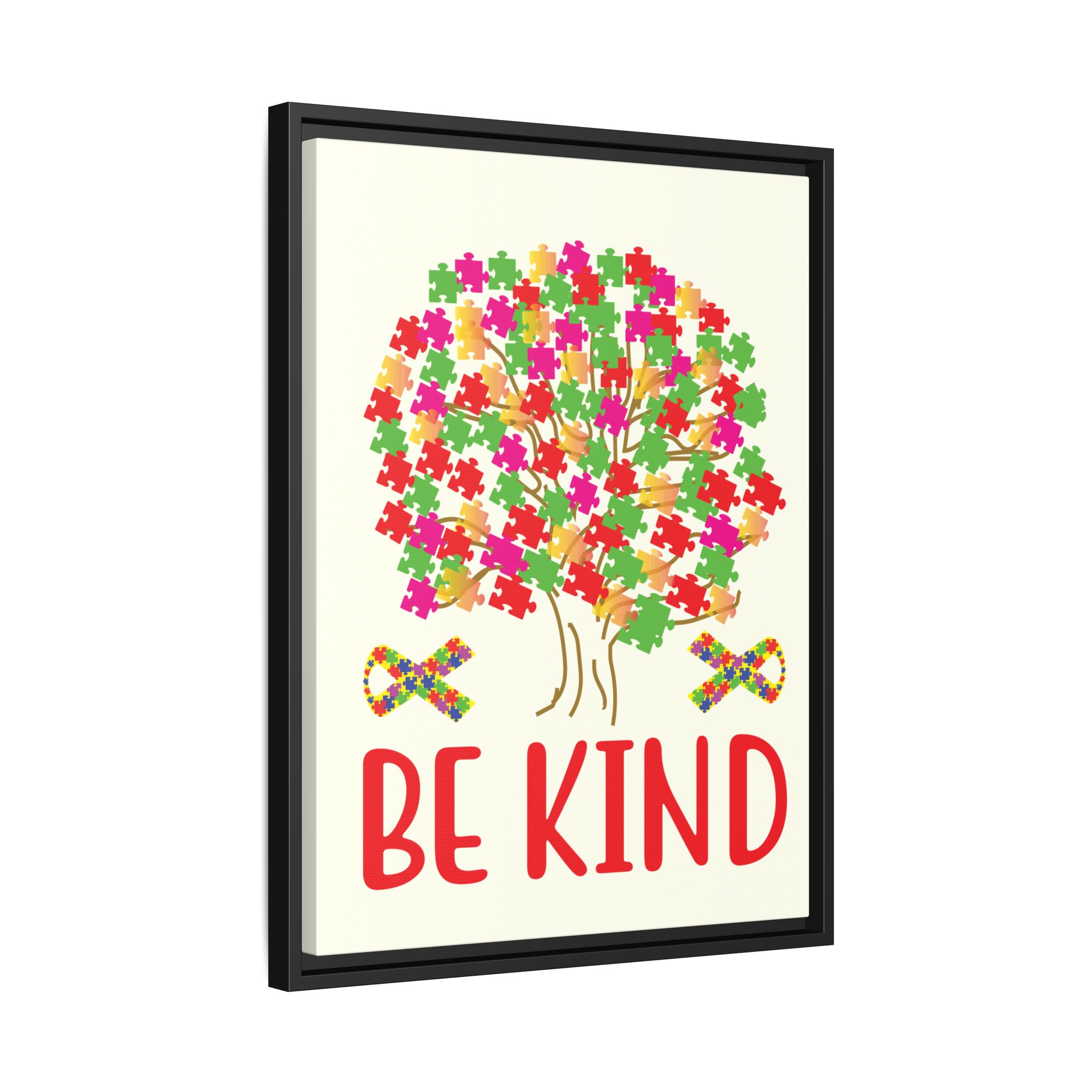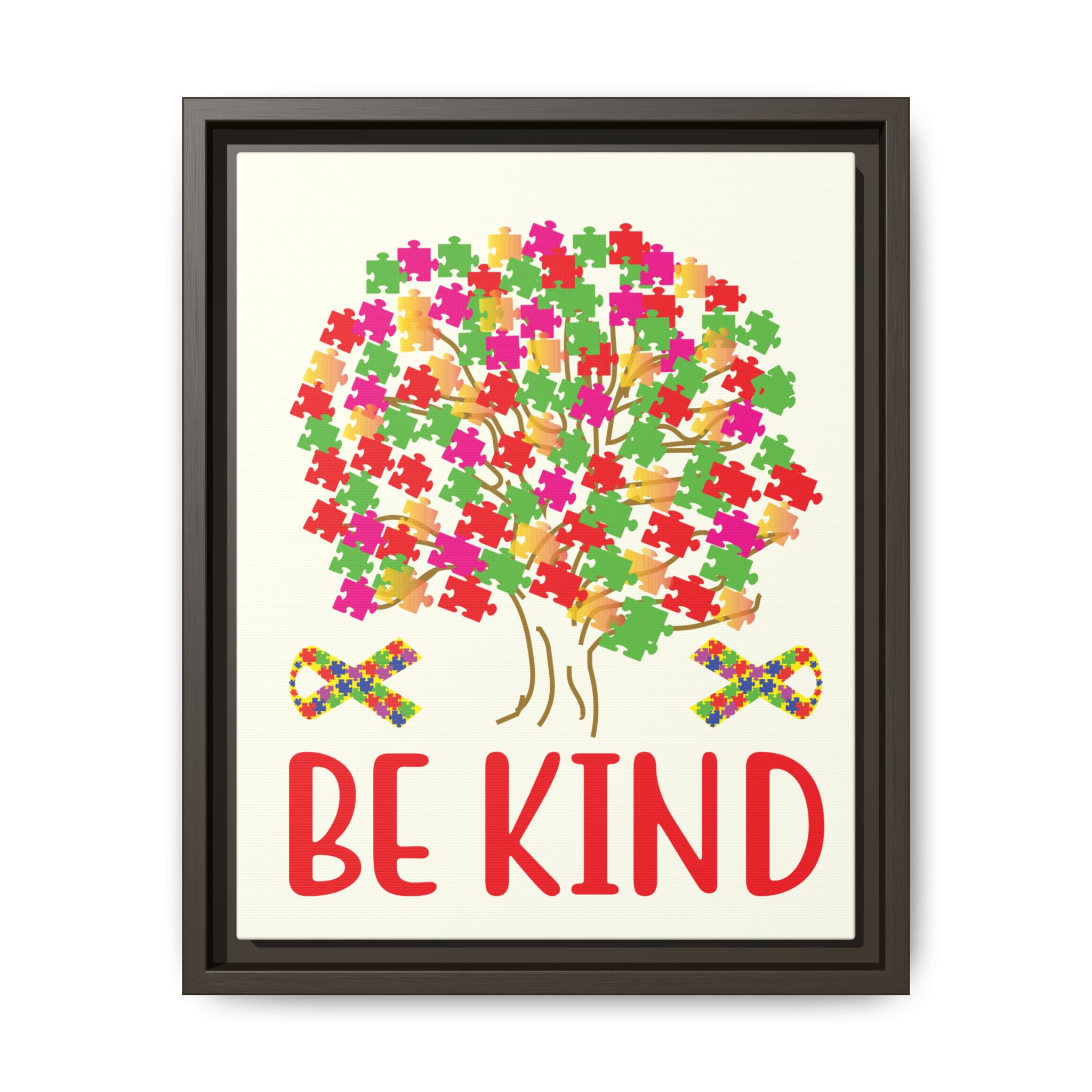 This matte canvas print framed in a slim pine profile brings warmth and intention to a room. The artwork — a colorful tree formed from puzzle-piece leaves with two ribbon motifs and the phrase “BE KIND” — reads clearly from a distance while offering bright, cheerful detail up close. The fine matte surface reduces glare and deepens color saturation, making the reds, greens, pinks and golds pop against a soft cream background. Lightweight but sturdily stretched on sustainably sourced pine, it arrives ready to hang with sawtooth hardware and a contemporary black or natural frame option that suits living rooms, classrooms, entryways, or quiet corners where a little reminder matters.