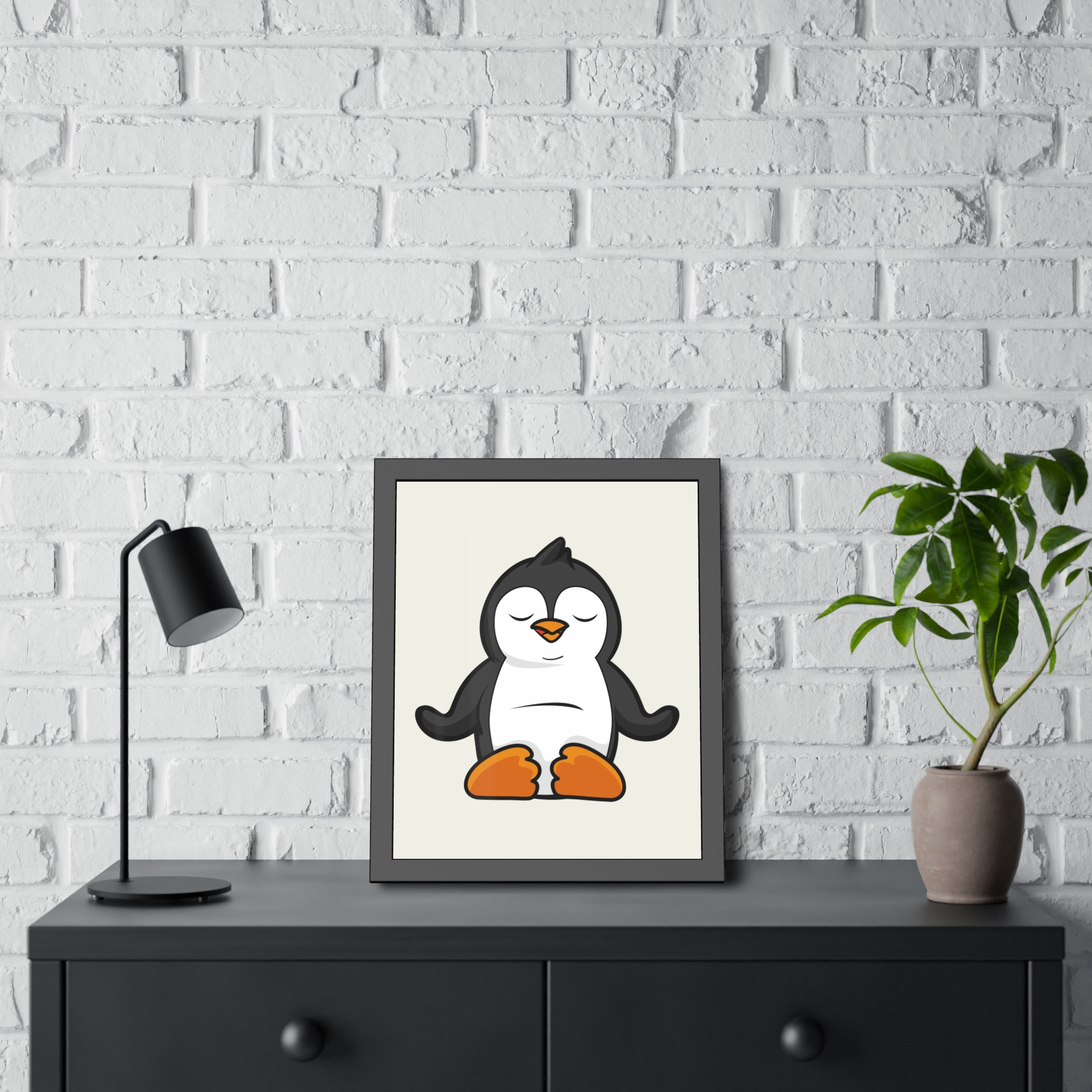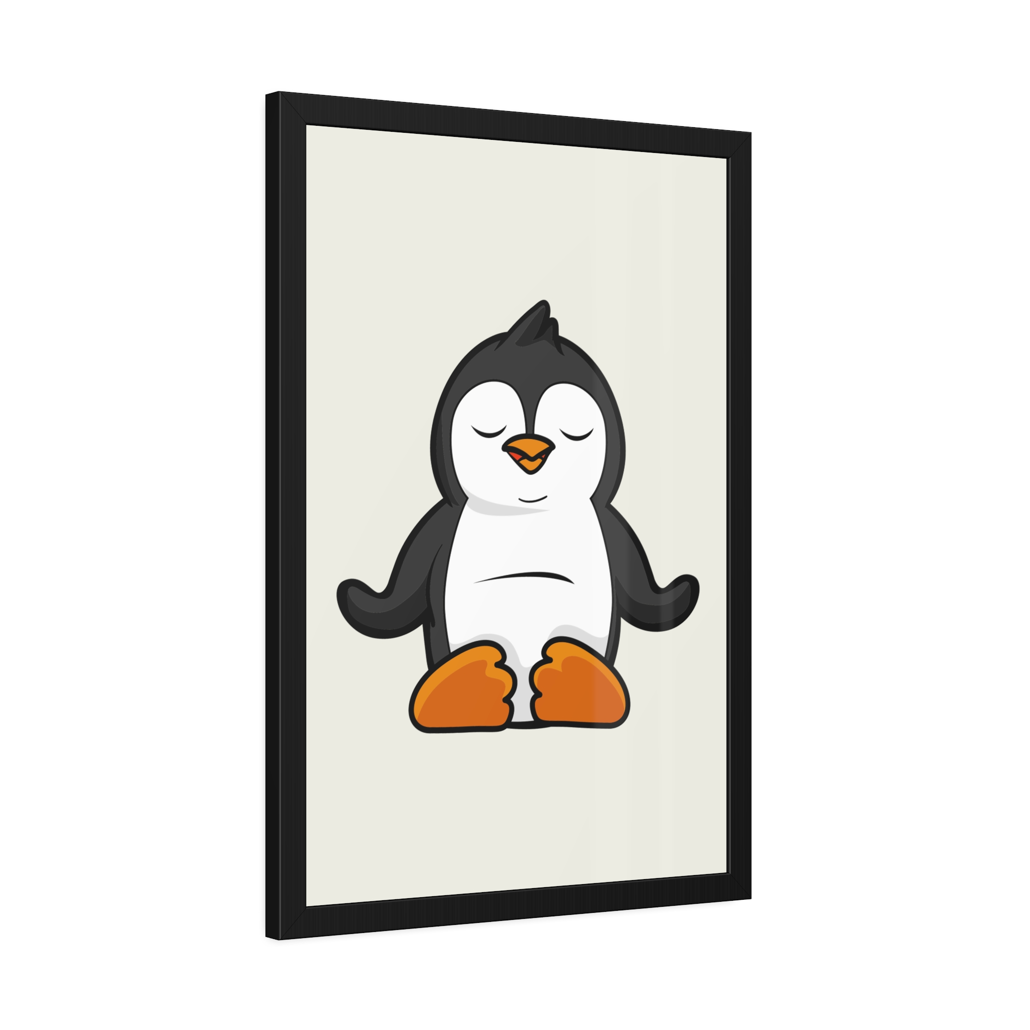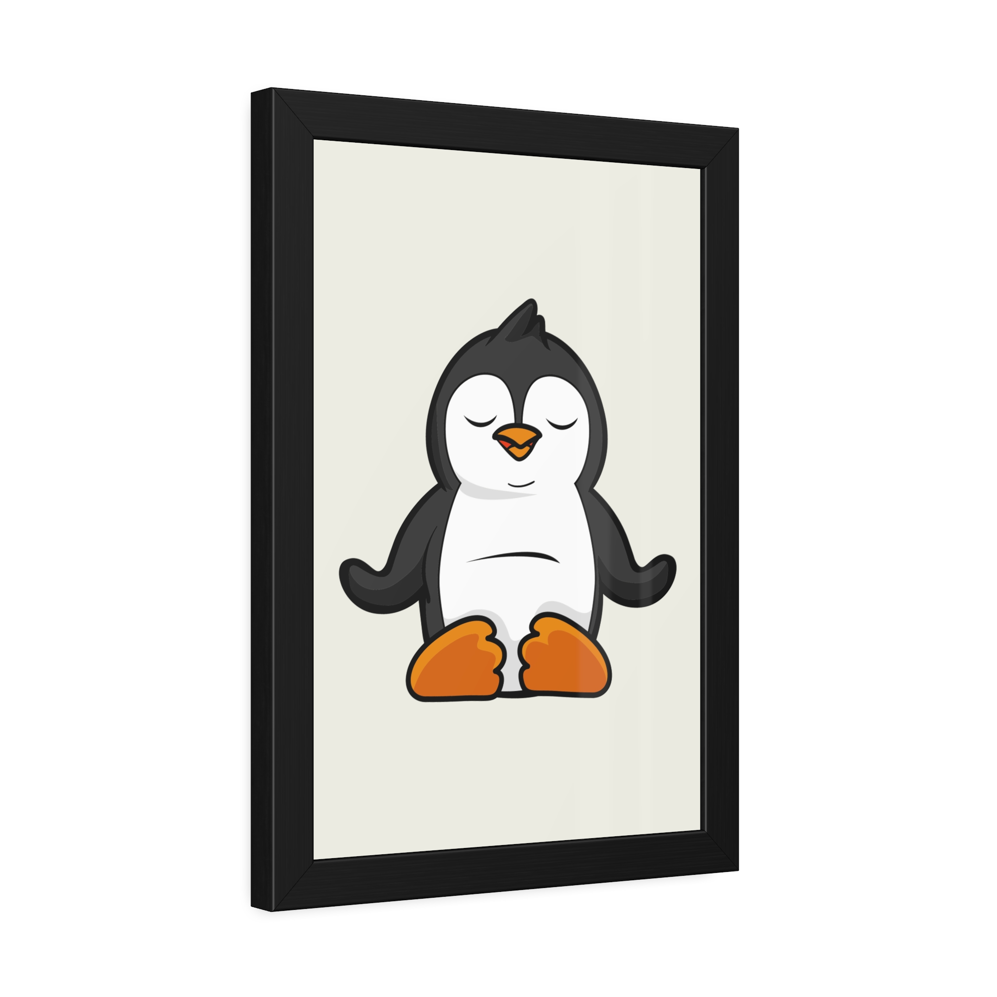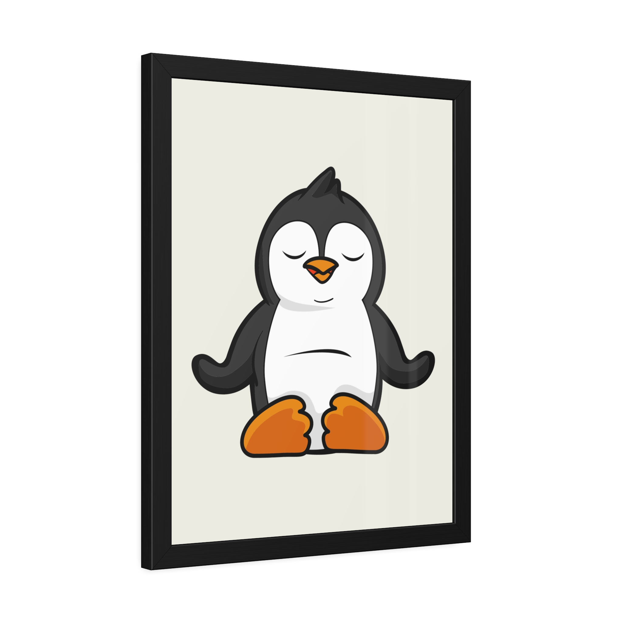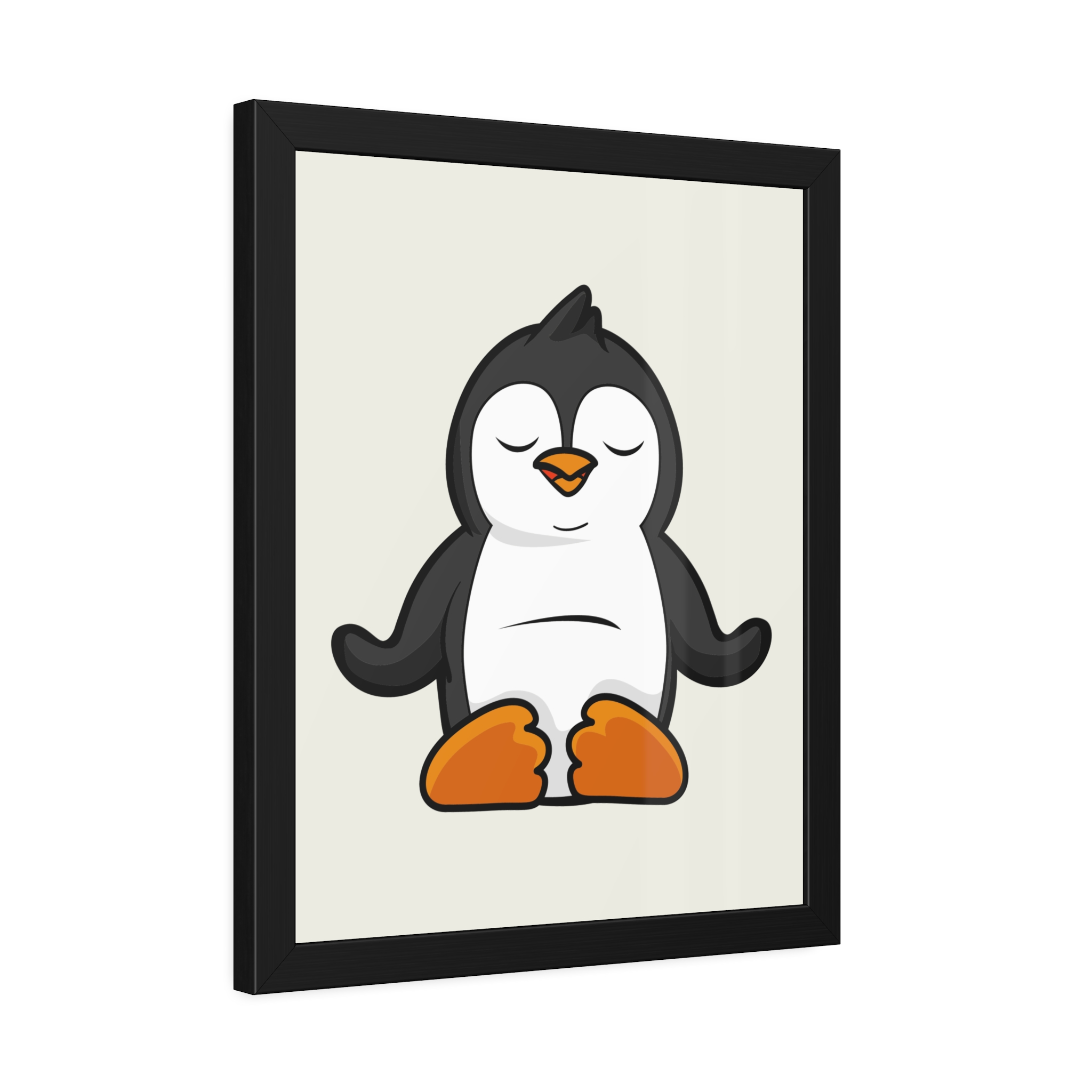 A framed paper poster that brings a soft, playful calm to any wall. The print shows a gentle, meditative penguin rendered with clean lines and warm accents — a quiet moment captured in bright, true-to-design color. Choose textured fine art paper for a tactile, gallery-style look, or semi-gloss photo paper for crisp, luminous whites. Each print is set in a matte black 100% pinewood frame with brown paper backing and shatter-proof plexiglass, arriving ready to hang with pre-installed hardware and rubber bumpers to protect your walls. Available in ten sizes and both horizontal and vertical orientations, this framed poster slips easily into a nursery, home office, or cozy reading nook and adds a touch of cheerful serenity wherever it’s placed.