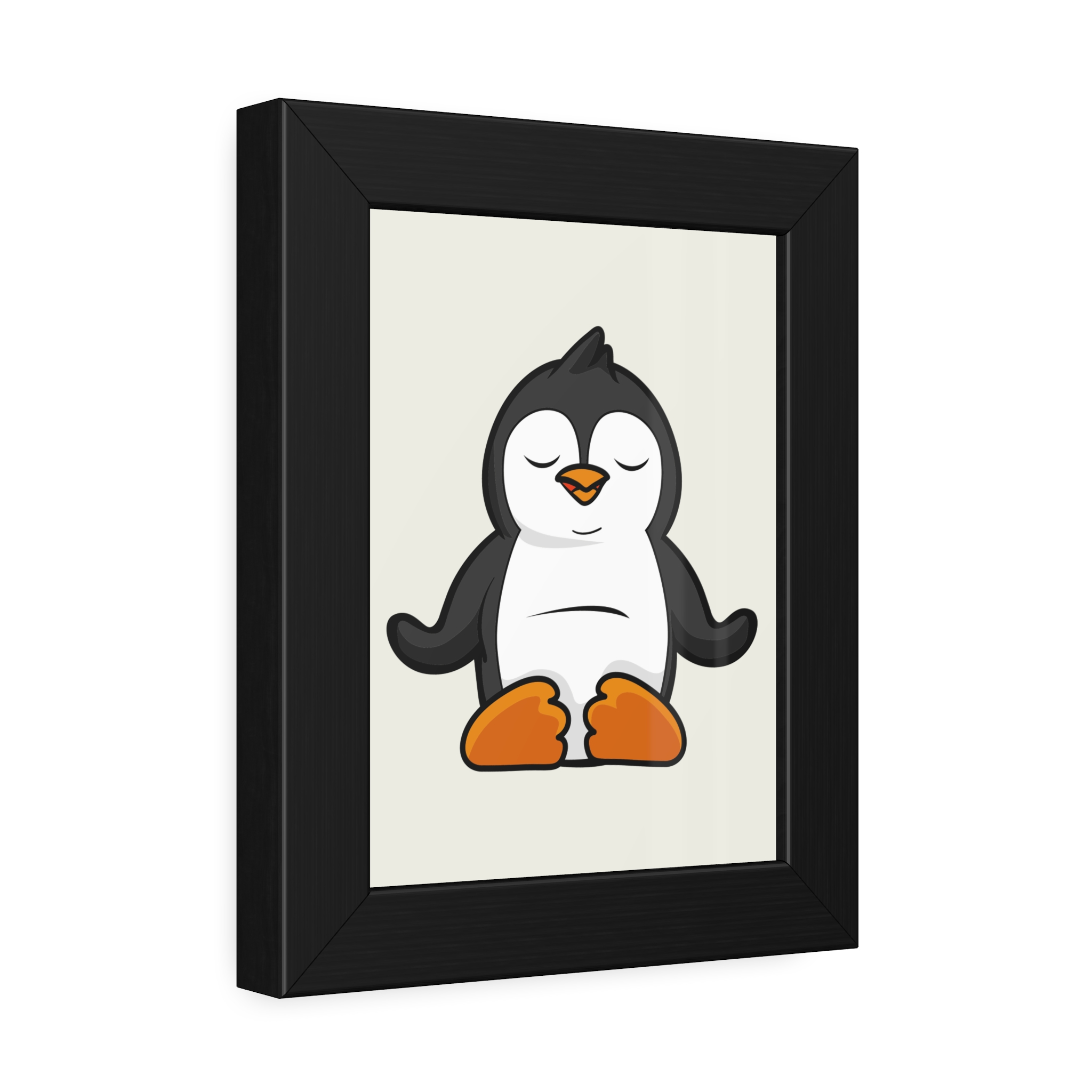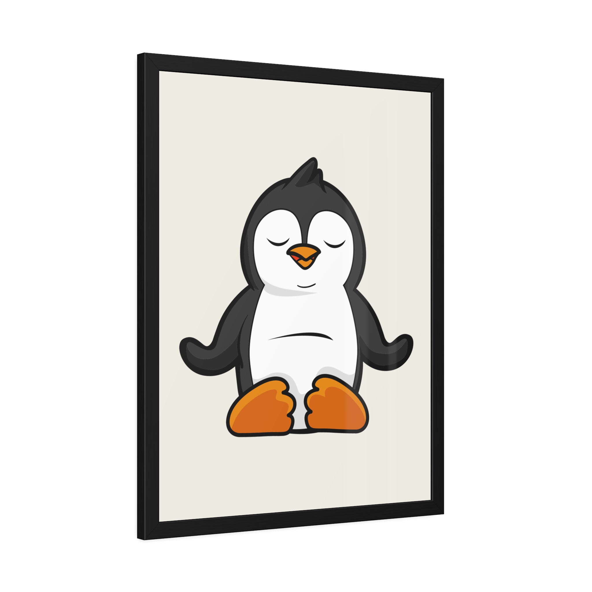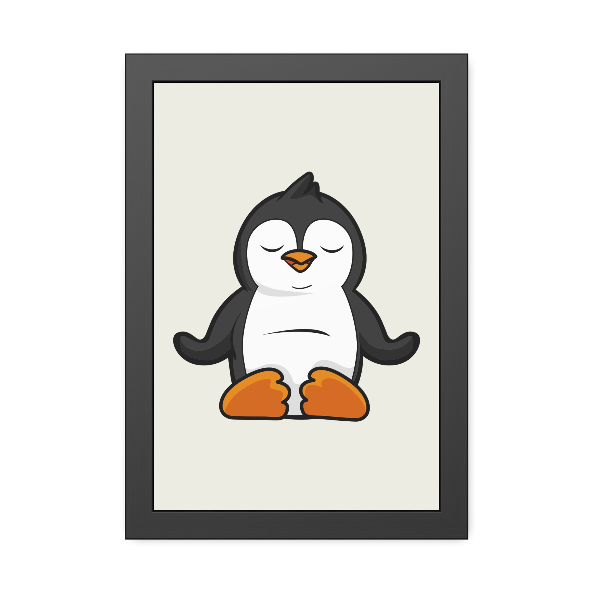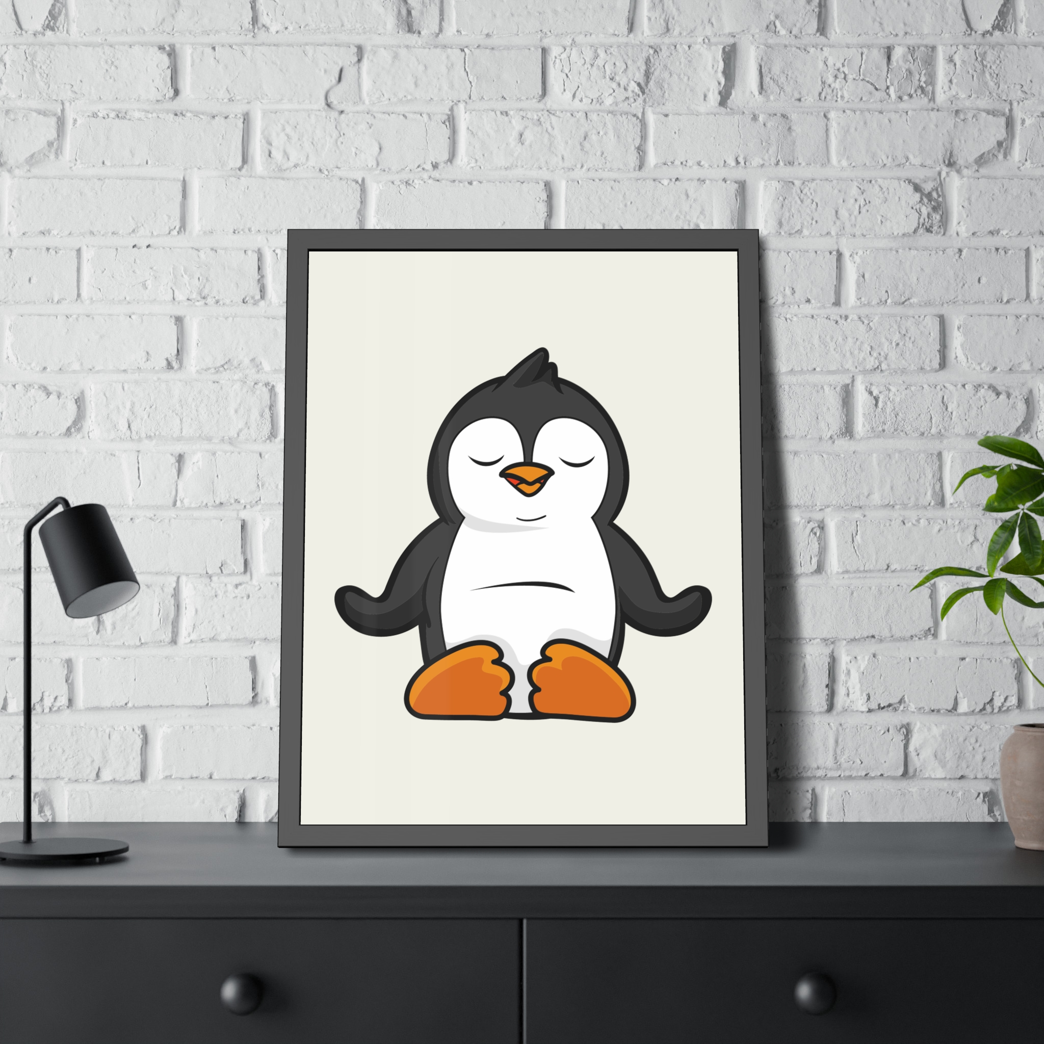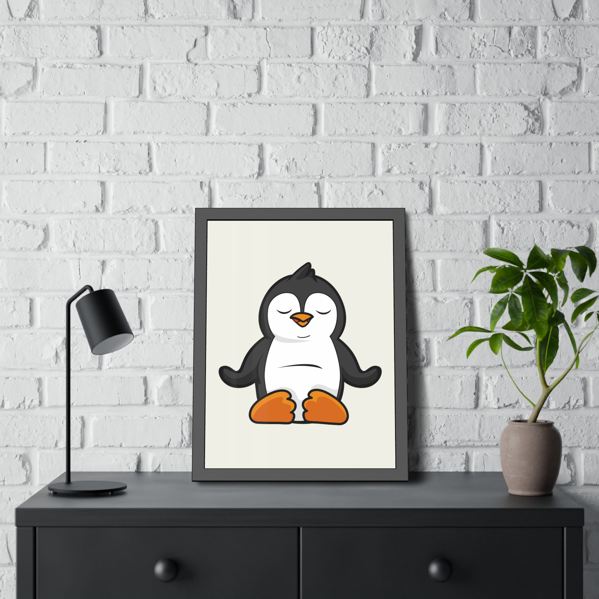 A framed paper poster that brings a soft, playful calm to any wall. The print shows a gentle, meditative penguin rendered with clean lines and warm accents — a quiet moment captured in bright, true-to-design color. Choose textured fine art paper for a tactile, gallery-style look, or semi-gloss photo paper for crisp, luminous whites. Each print is set in a matte black 100% pinewood frame with brown paper backing and shatter-proof plexiglass, arriving ready to hang with pre-installed hardware and rubber bumpers to protect your walls. Available in ten sizes and both horizontal and vertical orientations, this framed poster slips easily into a nursery, home office, or cozy reading nook and adds a touch of cheerful serenity wherever it’s placed.