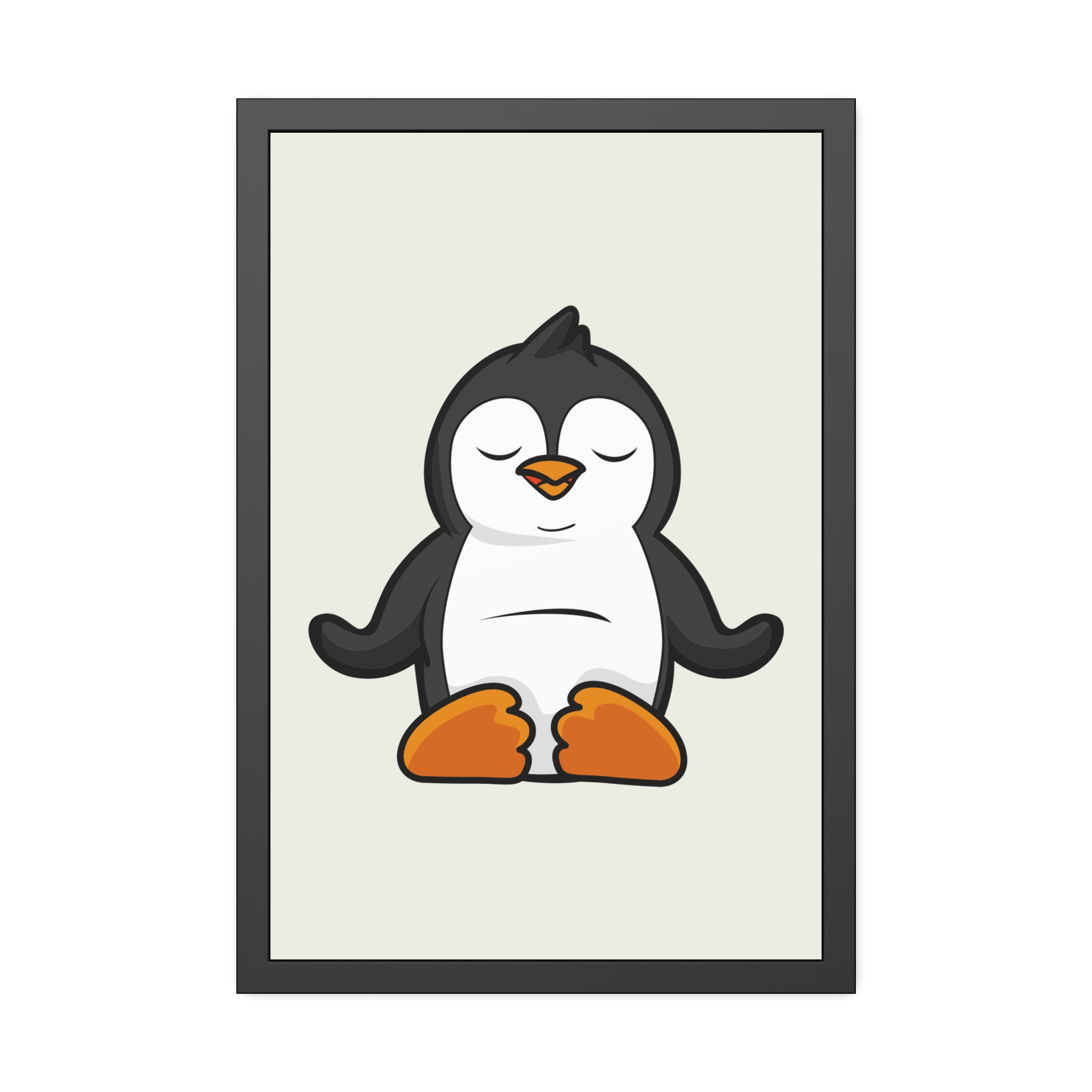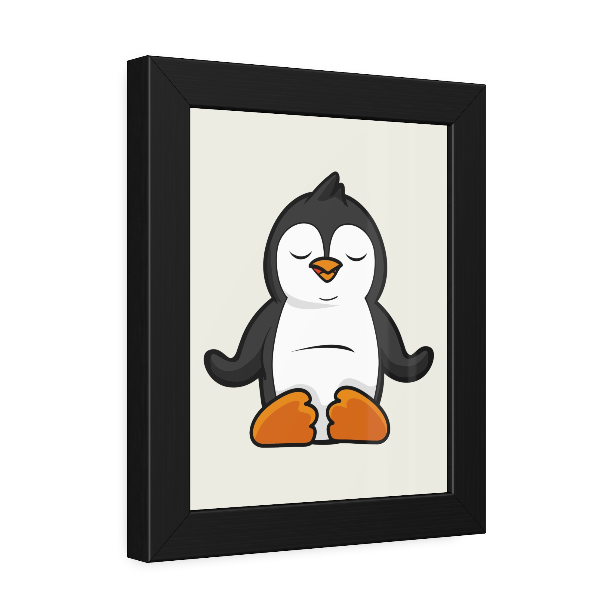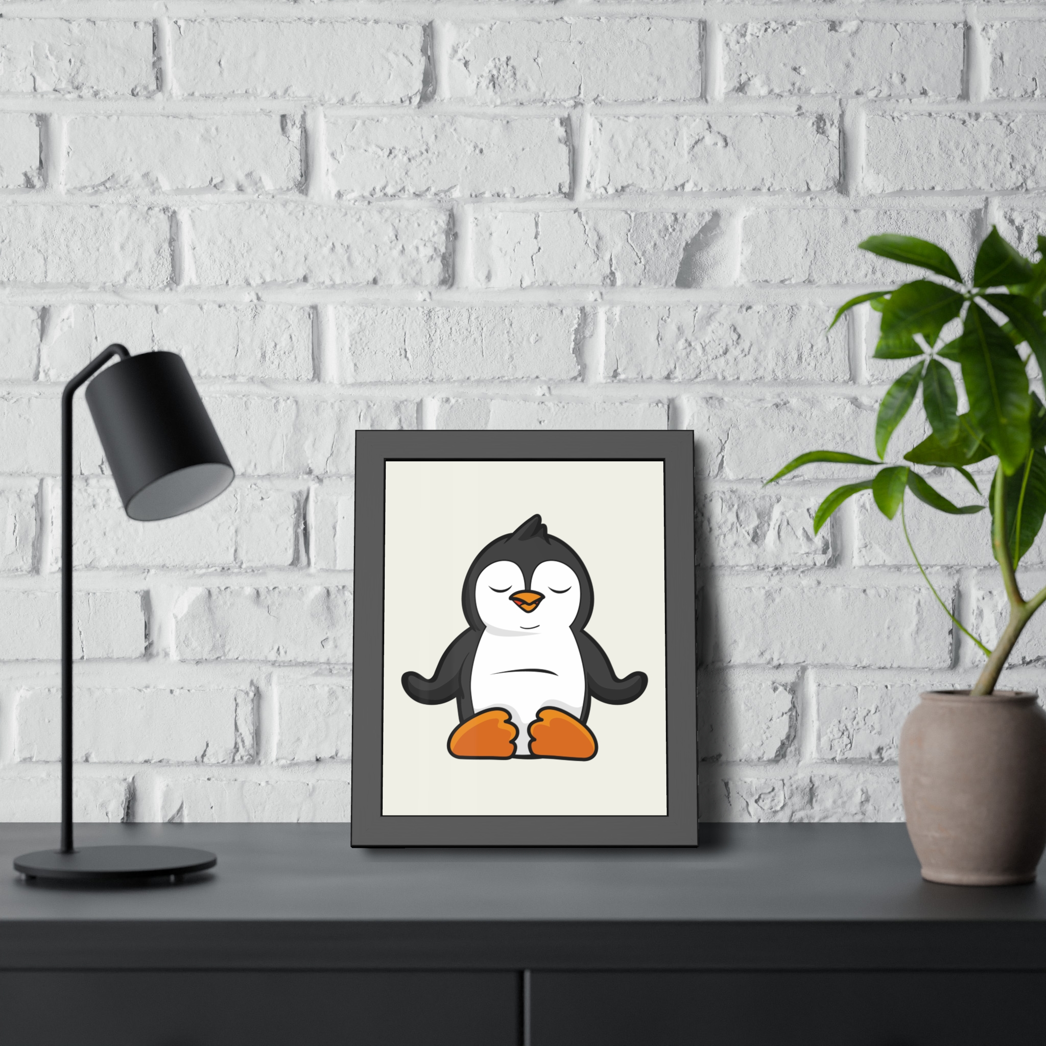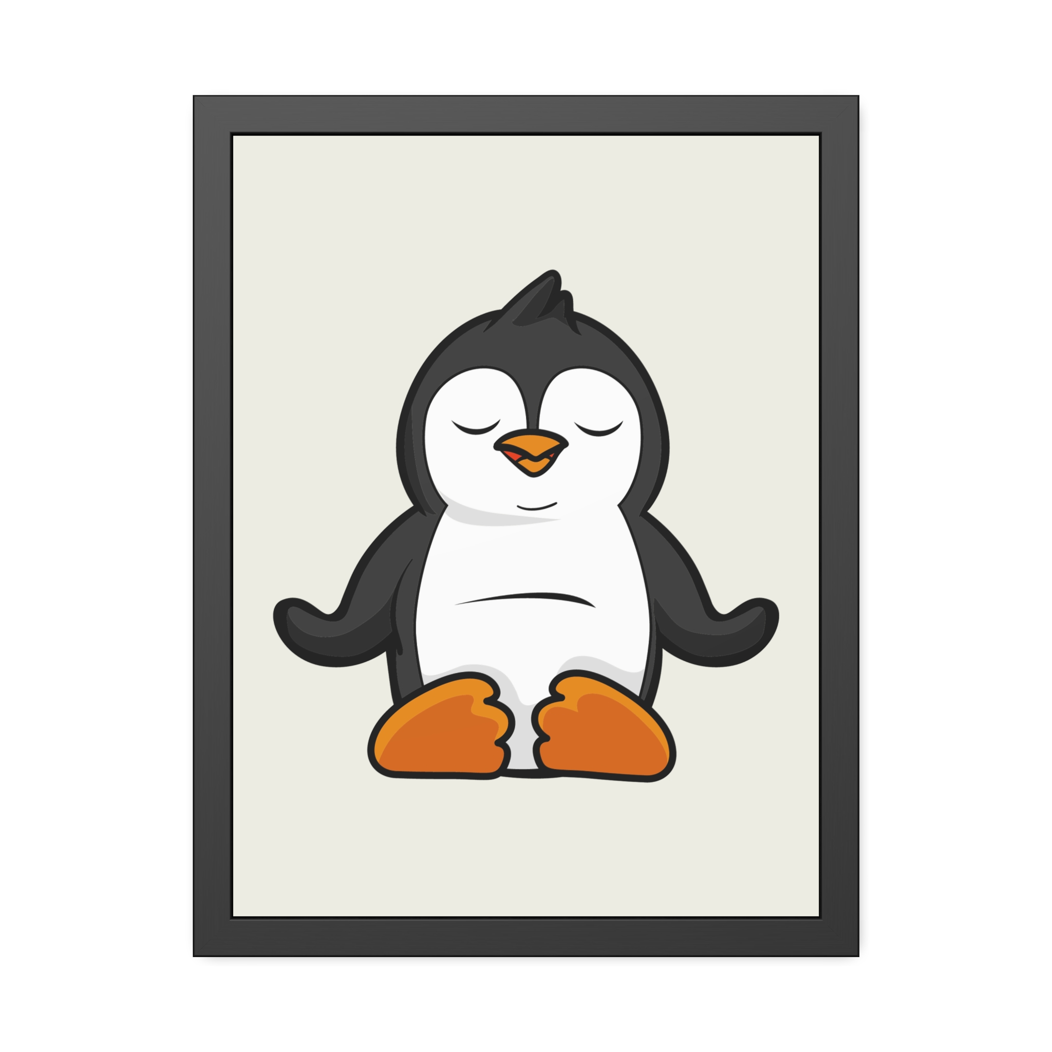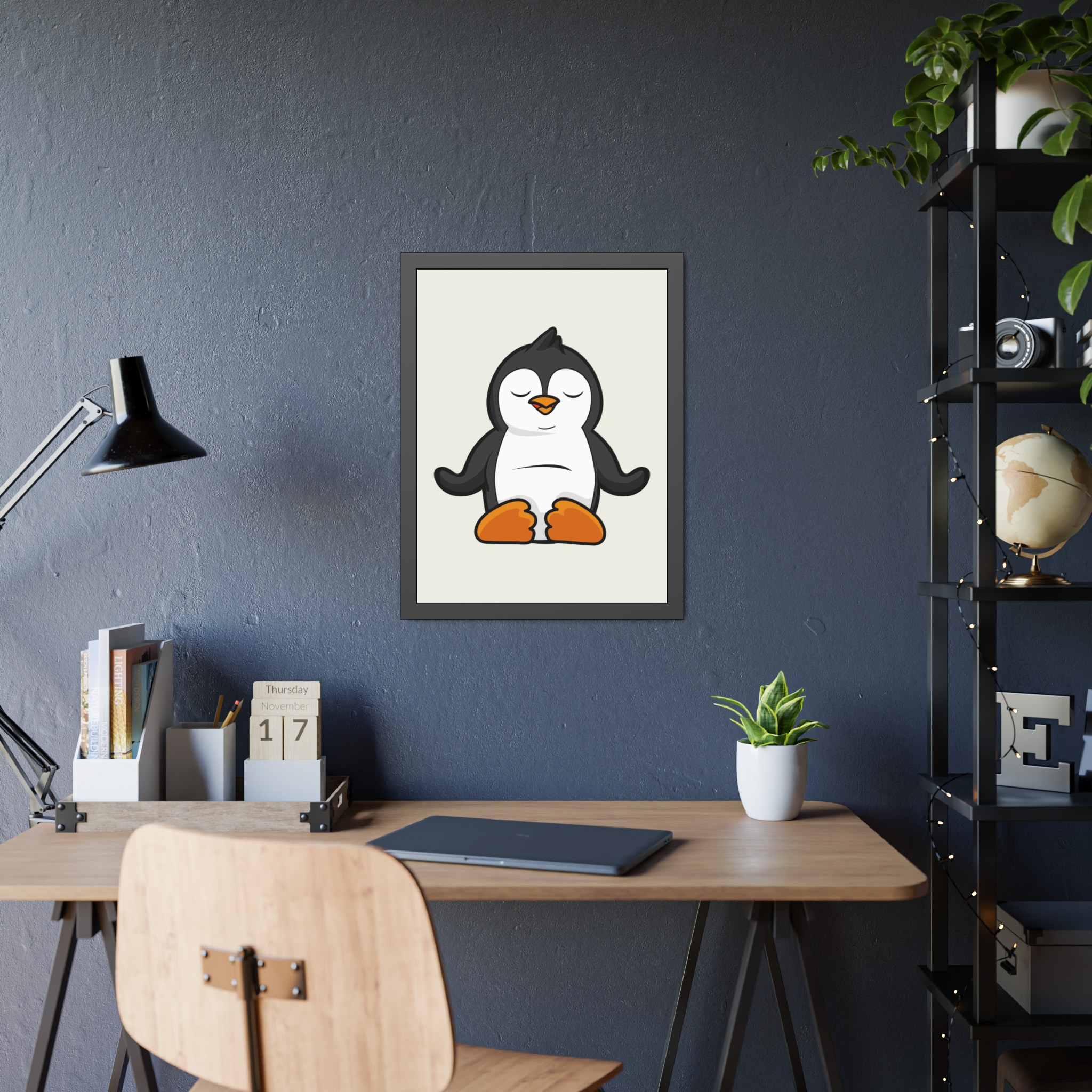 A framed paper poster that brings a soft, playful calm to any wall. The print shows a gentle, meditative penguin rendered with clean lines and warm accents — a quiet moment captured in bright, true-to-design color. Choose textured fine art paper for a tactile, gallery-style look, or semi-gloss photo paper for crisp, luminous whites. Each print is set in a matte black 100% pinewood frame with brown paper backing and shatter-proof plexiglass, arriving ready to hang with pre-installed hardware and rubber bumpers to protect your walls. Available in ten sizes and both horizontal and vertical orientations, this framed poster slips easily into a nursery, home office, or cozy reading nook and adds a touch of cheerful serenity wherever it’s placed.