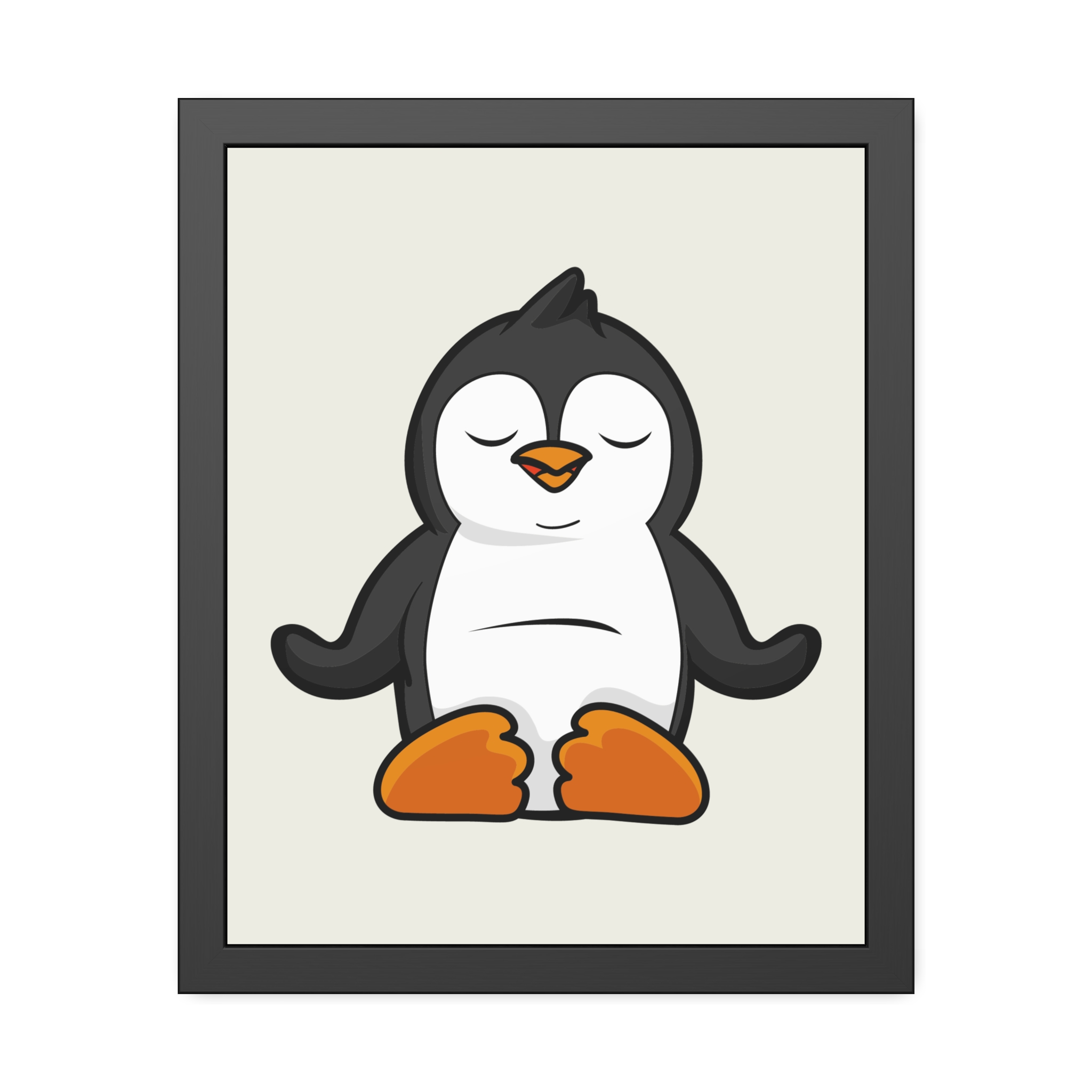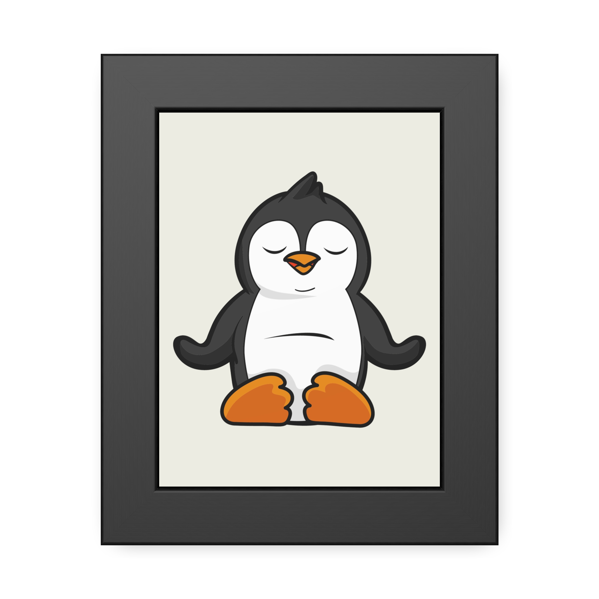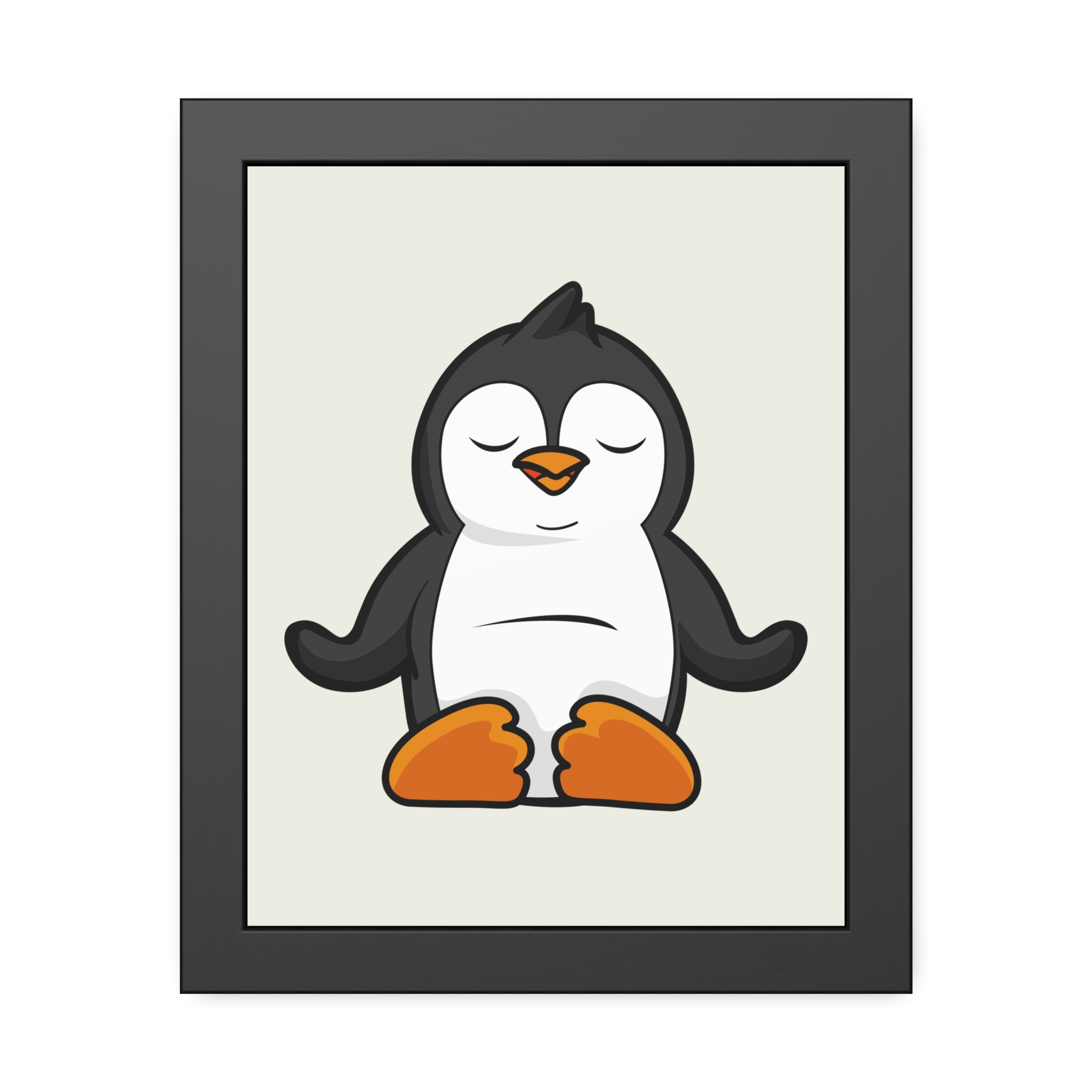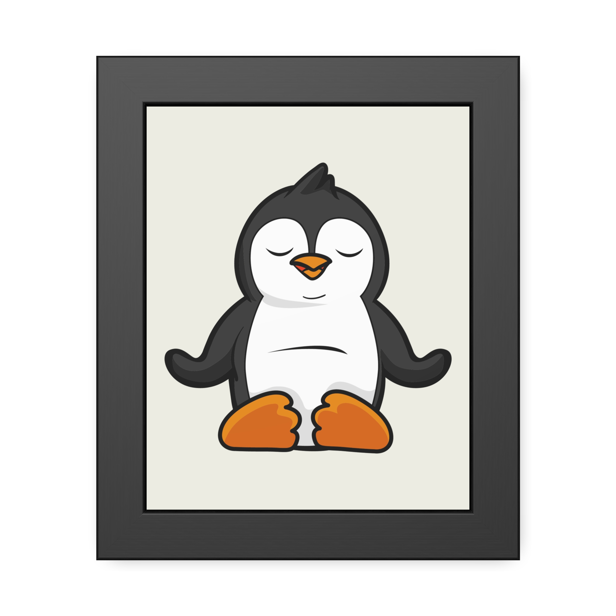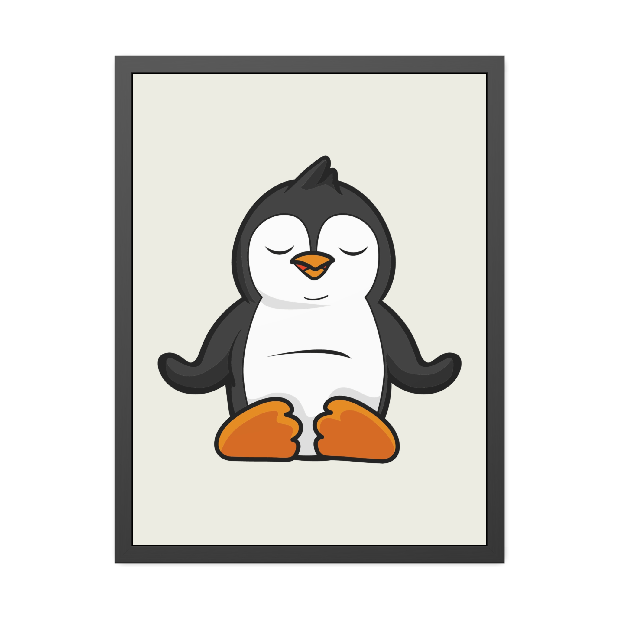 A framed paper poster that brings a soft, playful calm to any wall. The print shows a gentle, meditative penguin rendered with clean lines and warm accents — a quiet moment captured in bright, true-to-design color. Choose textured fine art paper for a tactile, gallery-style look, or semi-gloss photo paper for crisp, luminous whites. Each print is set in a matte black 100% pinewood frame with brown paper backing and shatter-proof plexiglass, arriving ready to hang with pre-installed hardware and rubber bumpers to protect your walls. Available in ten sizes and both horizontal and vertical orientations, this framed poster slips easily into a nursery, home office, or cozy reading nook and adds a touch of cheerful serenity wherever it’s placed.